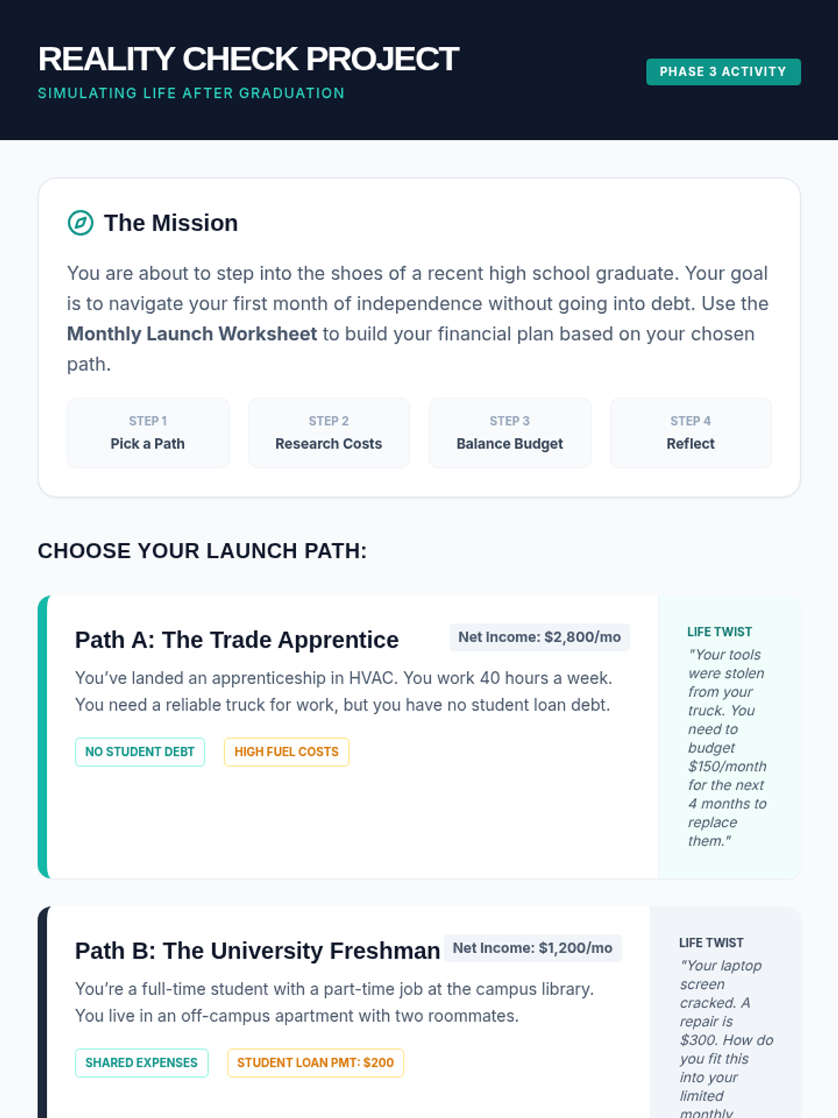 A project-based learning experience for high school seniors to bridge the gap between their 'Reality Check' lifestyle results and actual financial planning, featuring career research, tax calculations, and a 'Curveball' challenge.