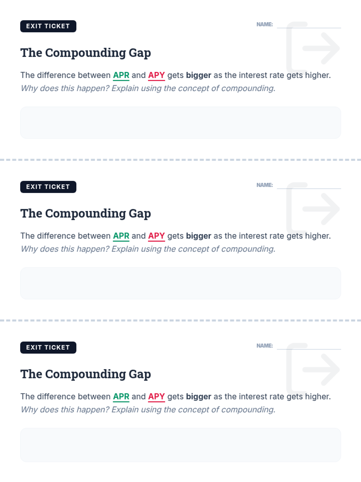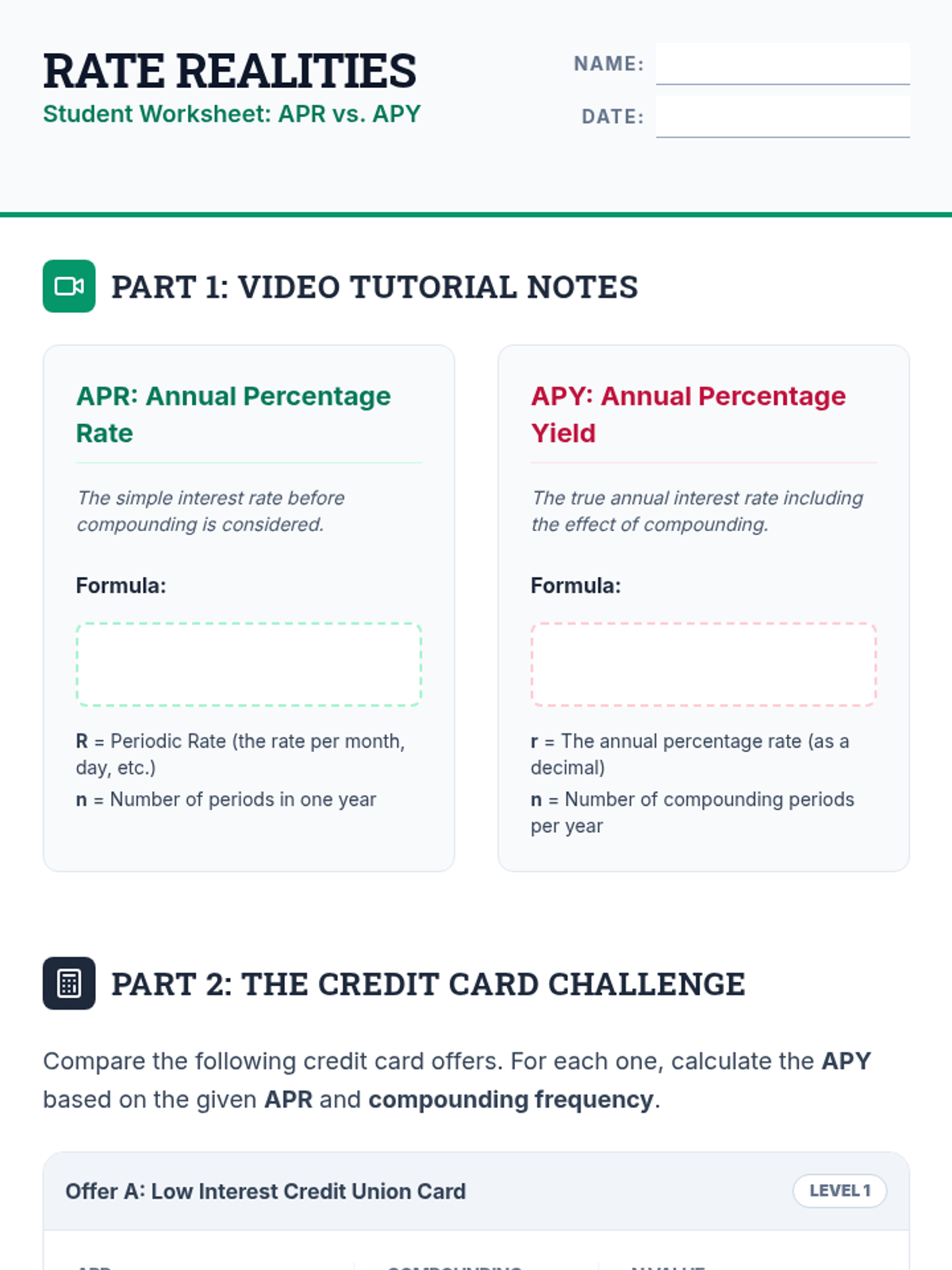 This lesson explores the difference between Annual Percentage Rate (APR) and Annual Percentage Yield (APY), helping students understand how compounding frequency and high interest rates impact the true cost of credit. Students will watch a tutorial video, apply formulas to credit card offers, and analyze why the gap between nominal and effective rates widens.