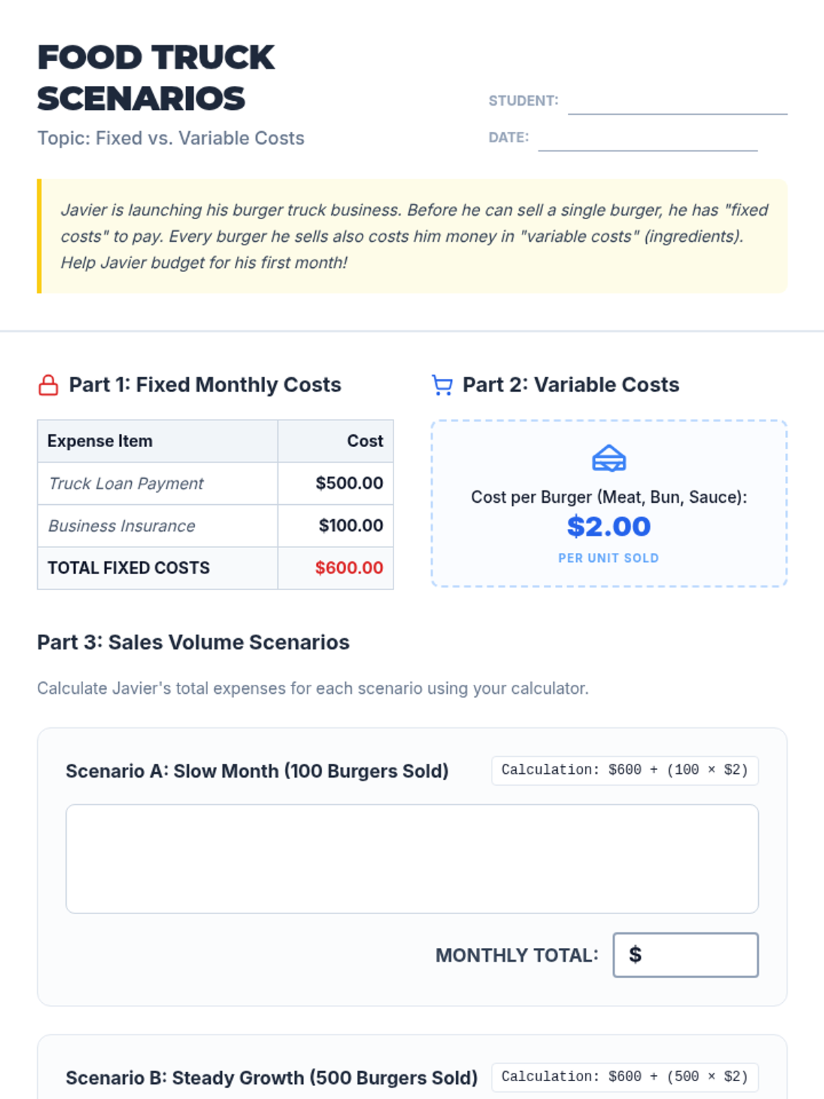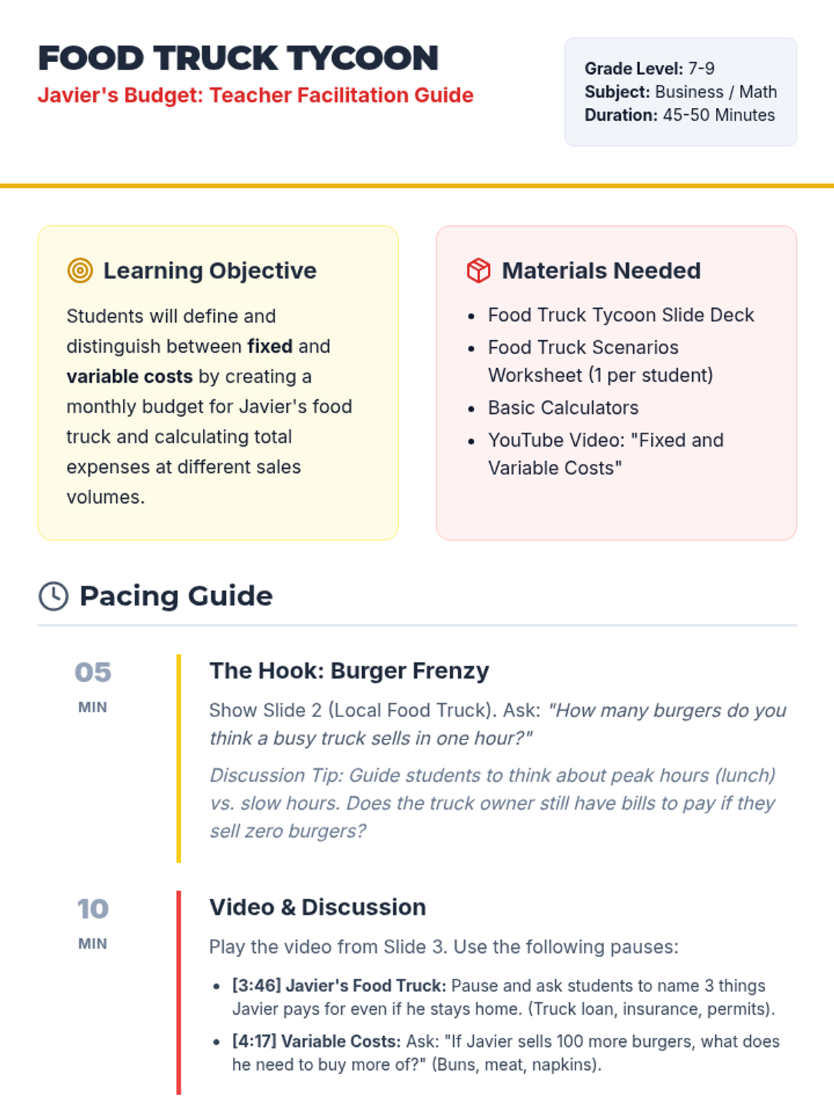 A business and economics lesson for grades 7-9 where students learn the difference between fixed and variable costs through the lens of running a food truck business. Includes a video-guided discussion and a hands-on budgeting worksheet.