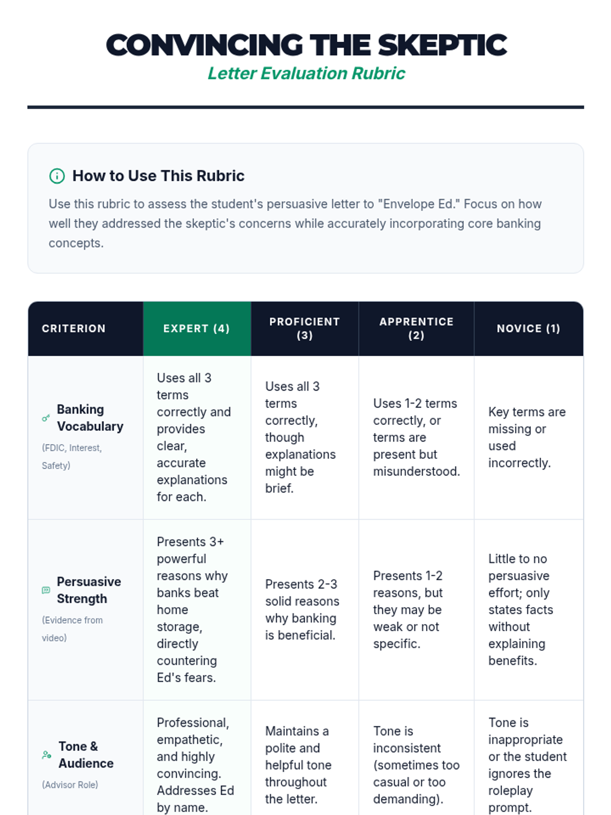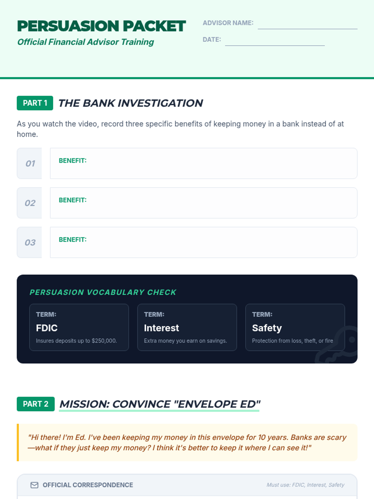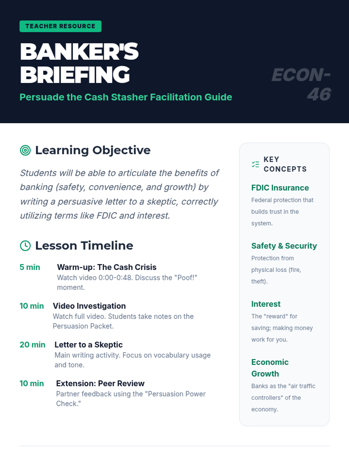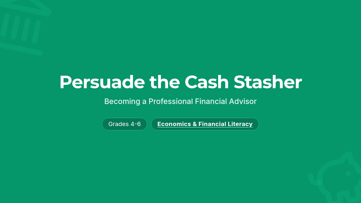 A financial literacy lesson where students learn the benefits of banking and practice persuasive writing by convincing a 'cash stasher' to open a bank account. Students explore concepts like FDIC insurance, interest, and economic growth through a video-based exploration and roleplay activity.