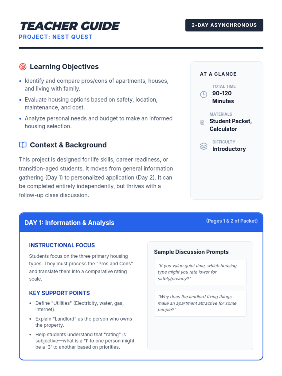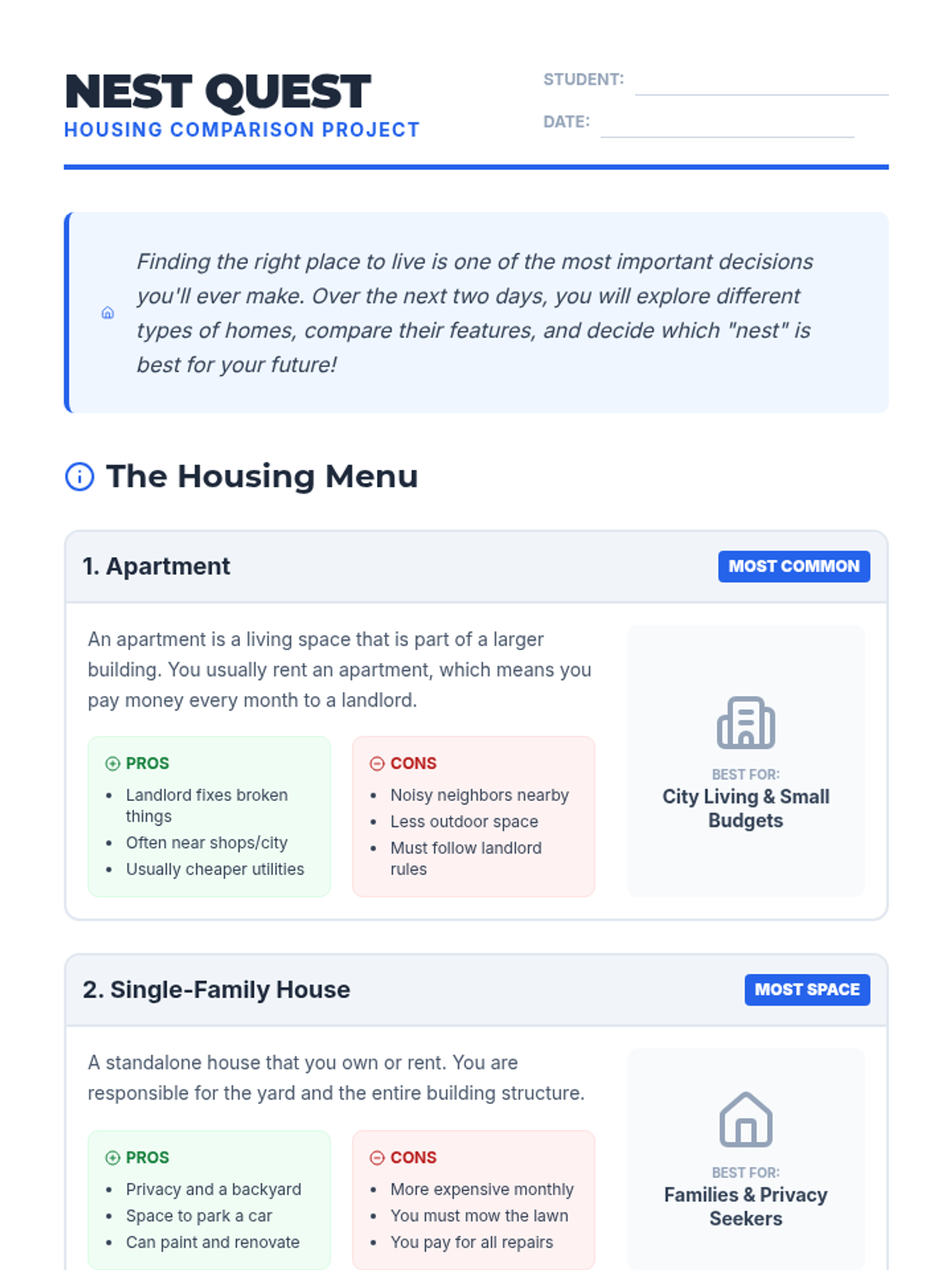 A two-day project where students explore different housing options, compare their features, and determine which best fits their personal needs and budget.