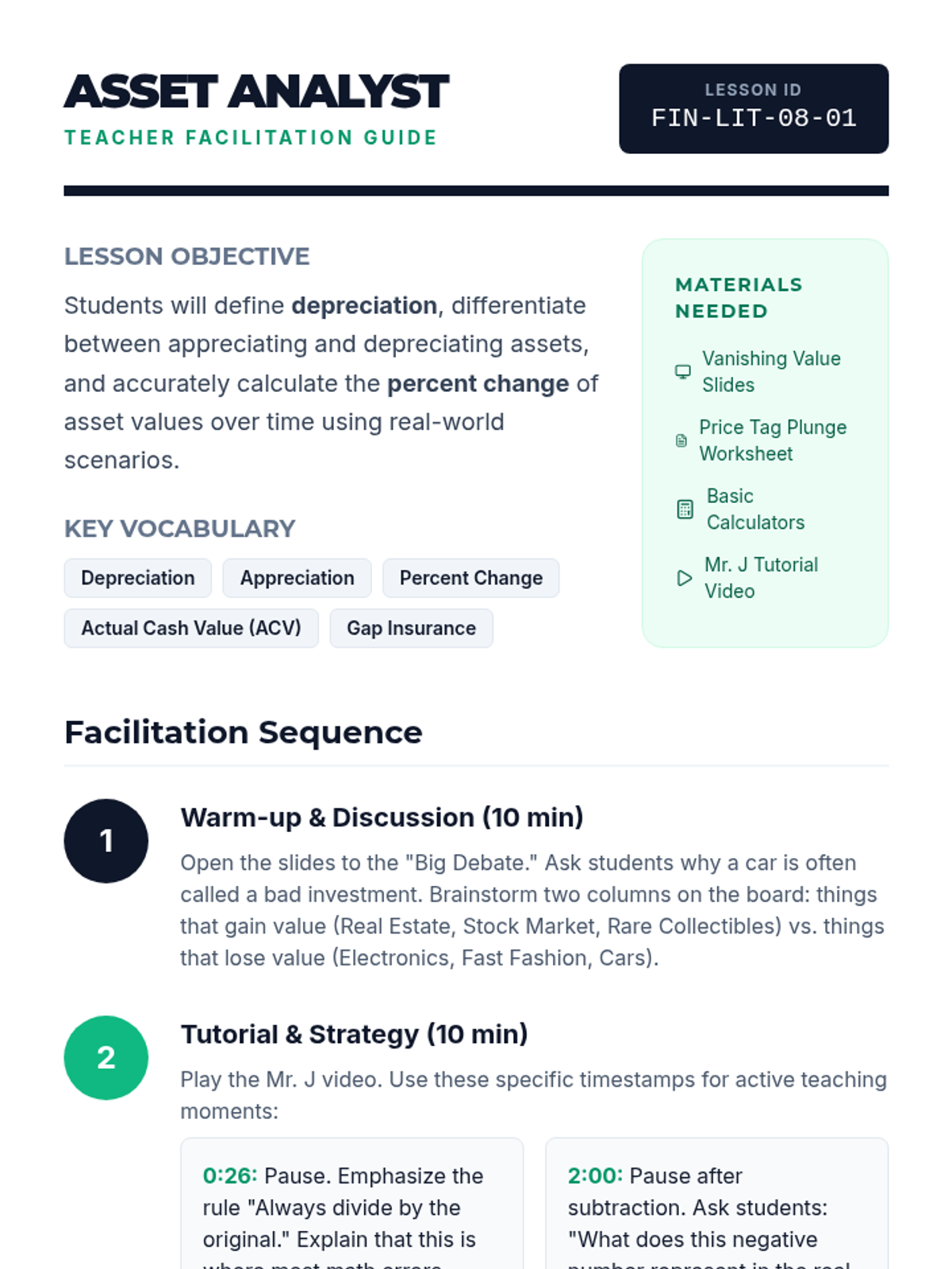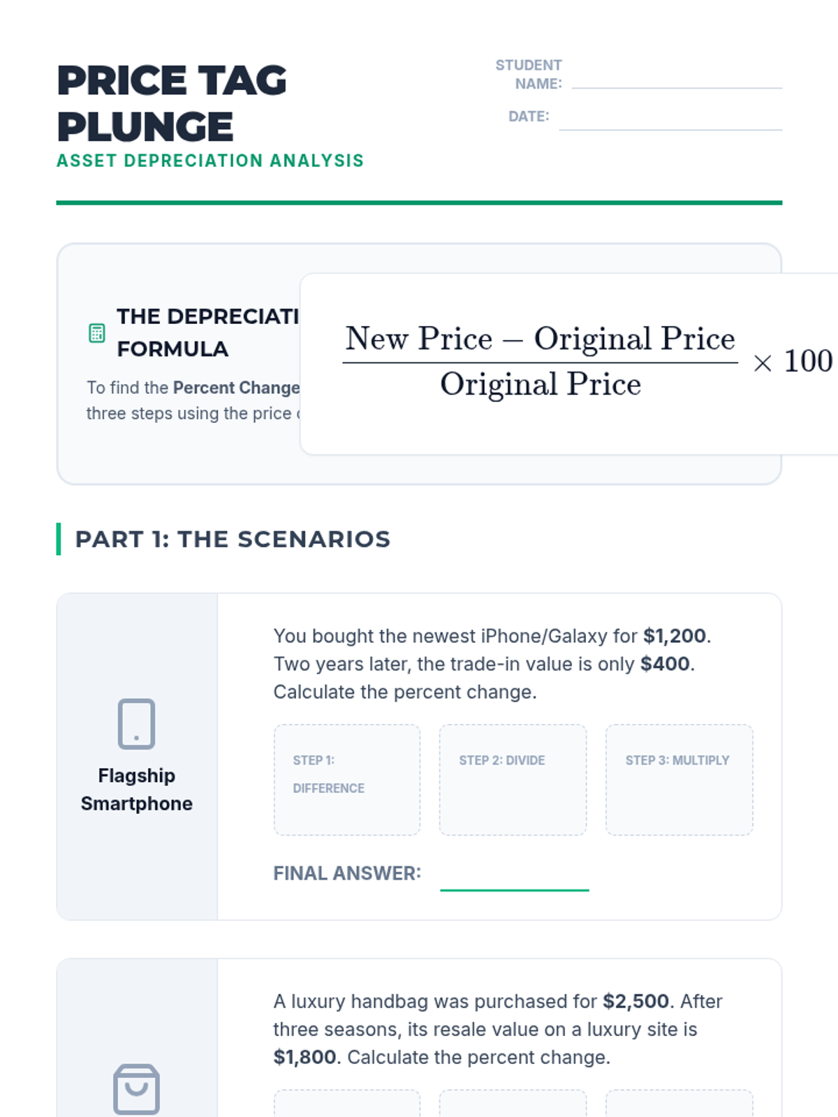 Students explore why certain assets lose value over time, learn to calculate percent change using real-world scenarios (car, phone, handbag), and discuss the financial implications of depreciation on insurance and net worth.