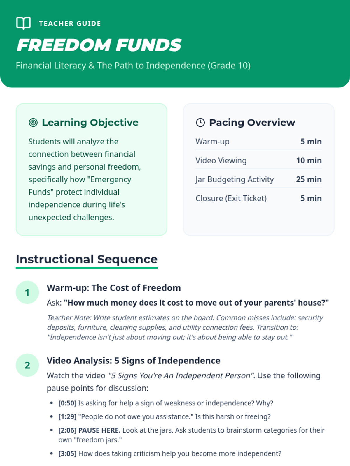 A 10th-grade financial literacy lesson that explores the link between savings and personal freedom using the 'Jar Budgeting' method and a Psych2Go video on independence.
