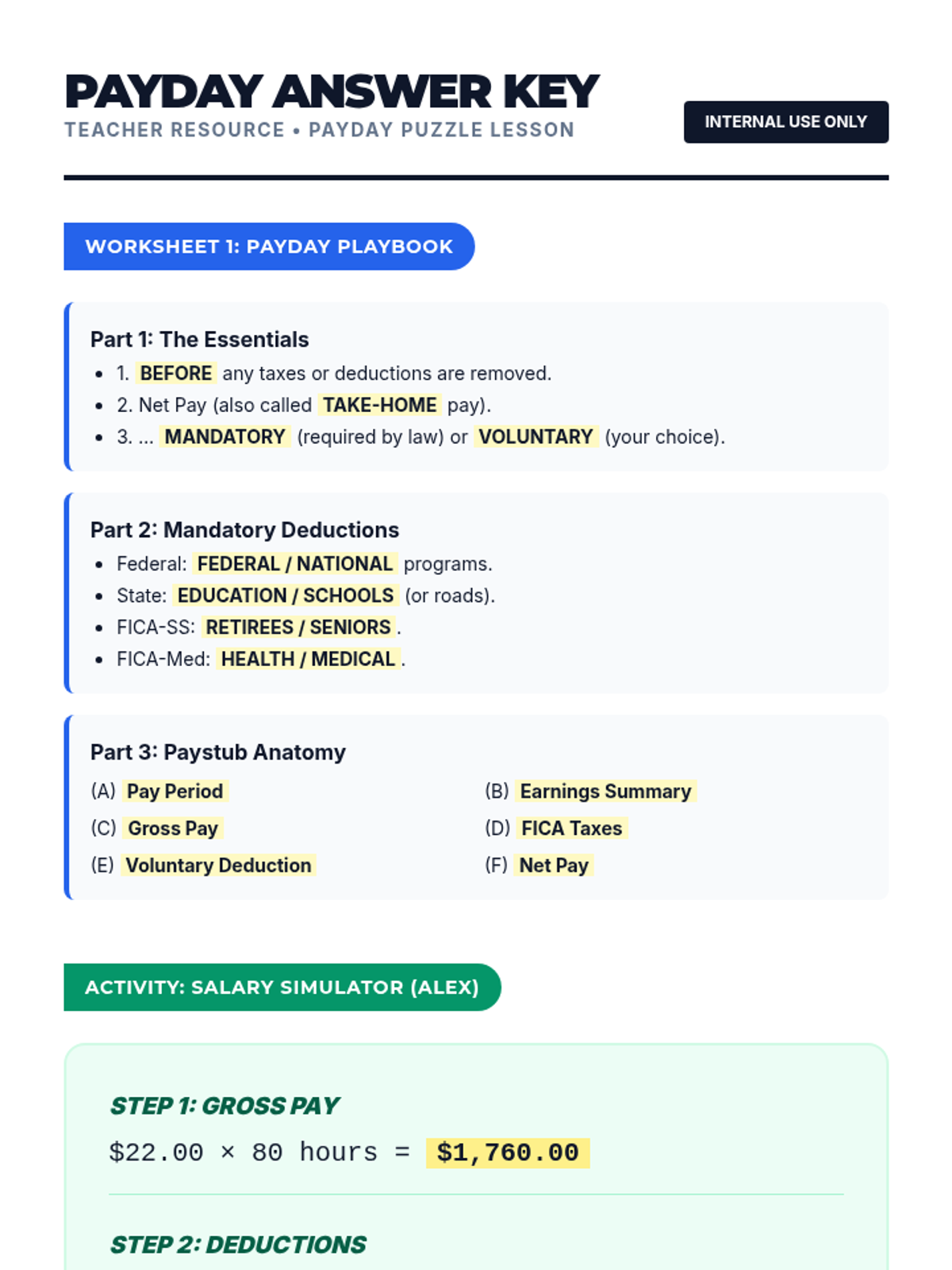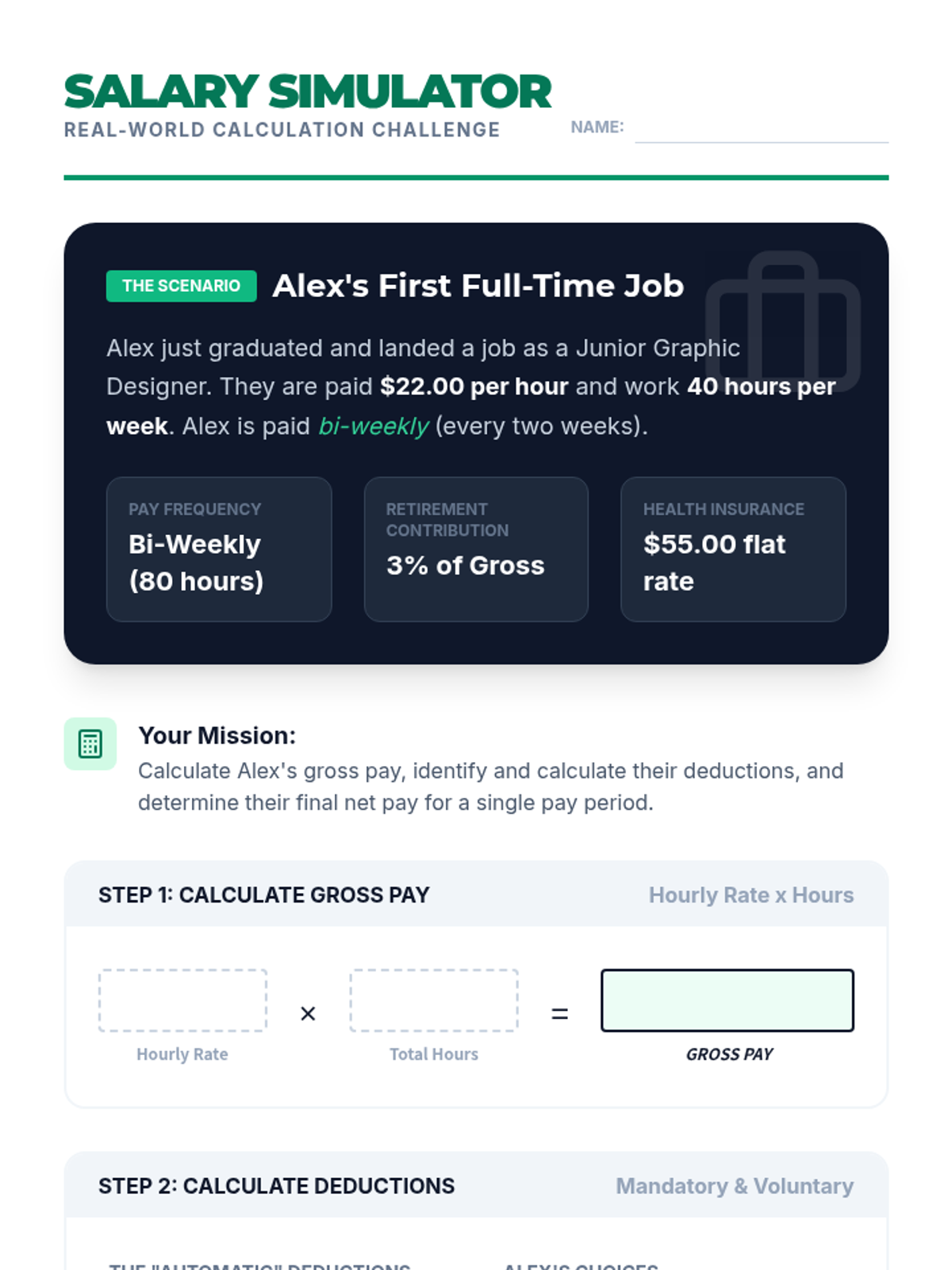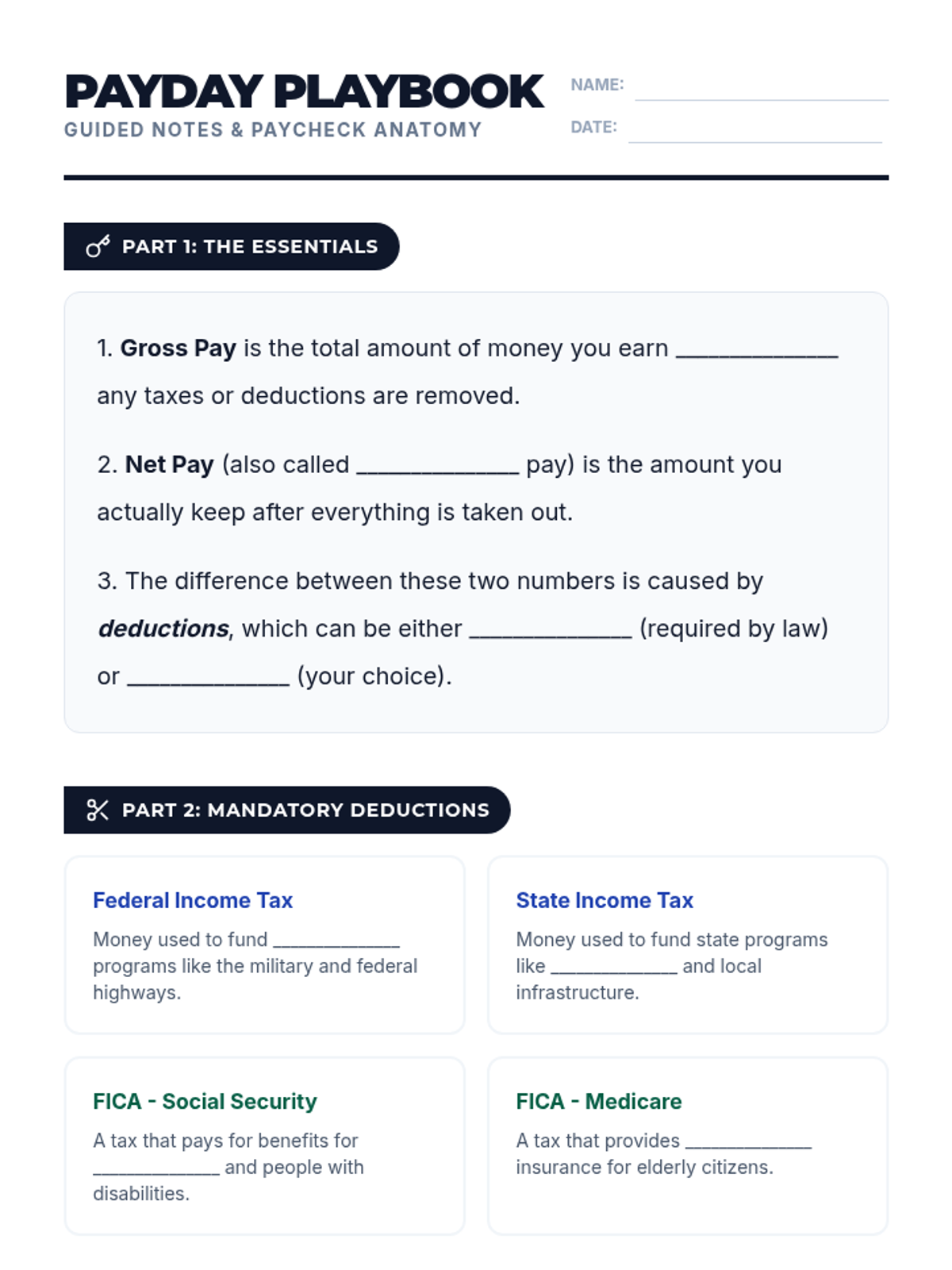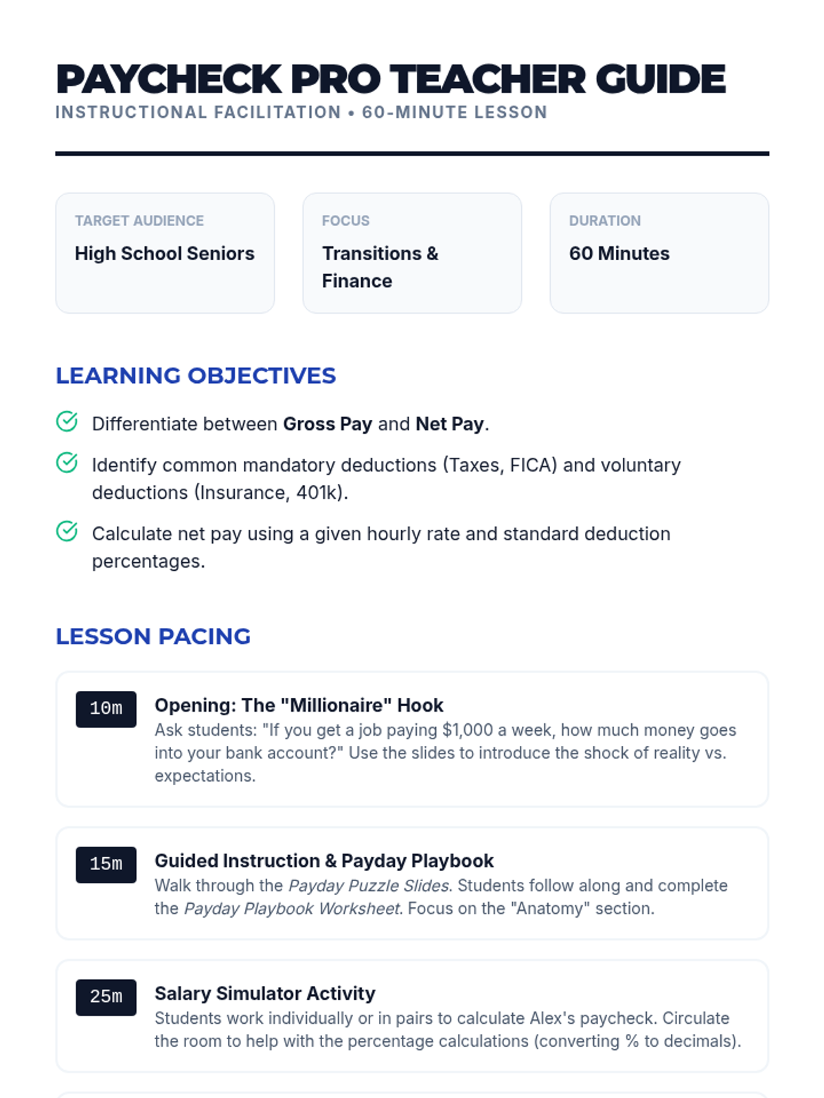A comprehensive lesson for high school seniors to master the difference between gross and net pay. Students explore paycheck components, calculate deductions, and practice reading real-world pay stubs through guided notes and an interactive simulation.