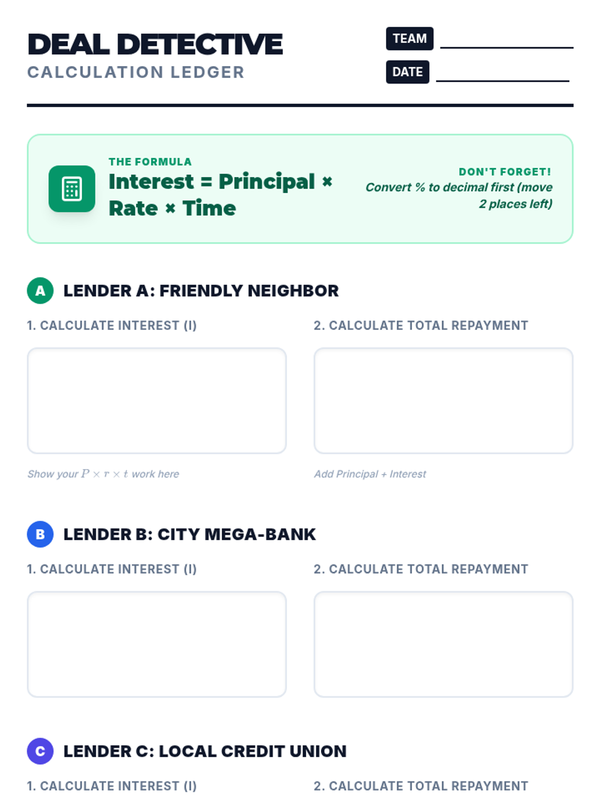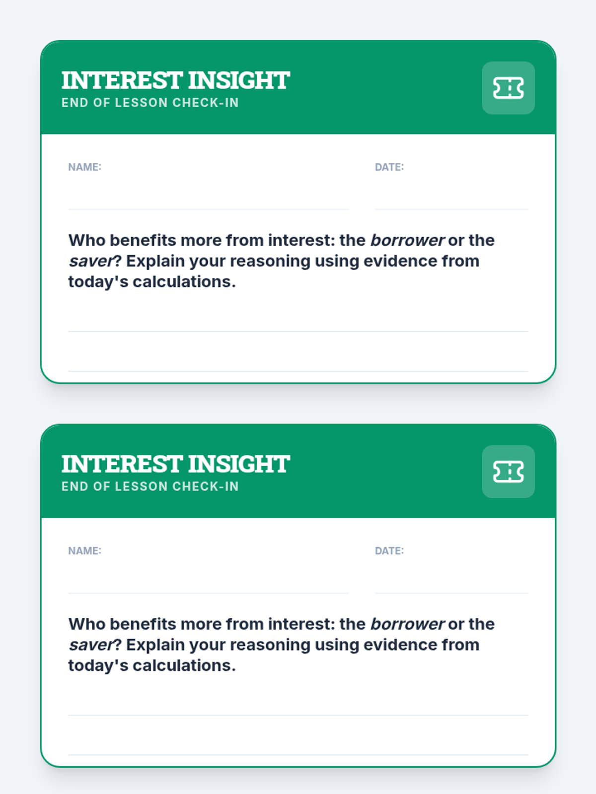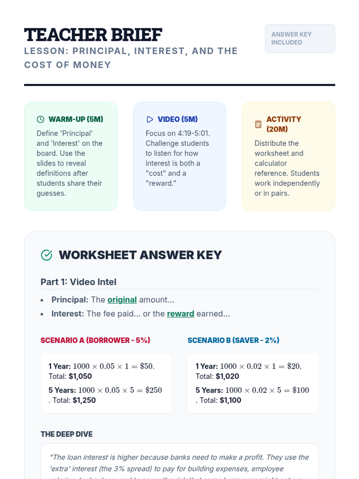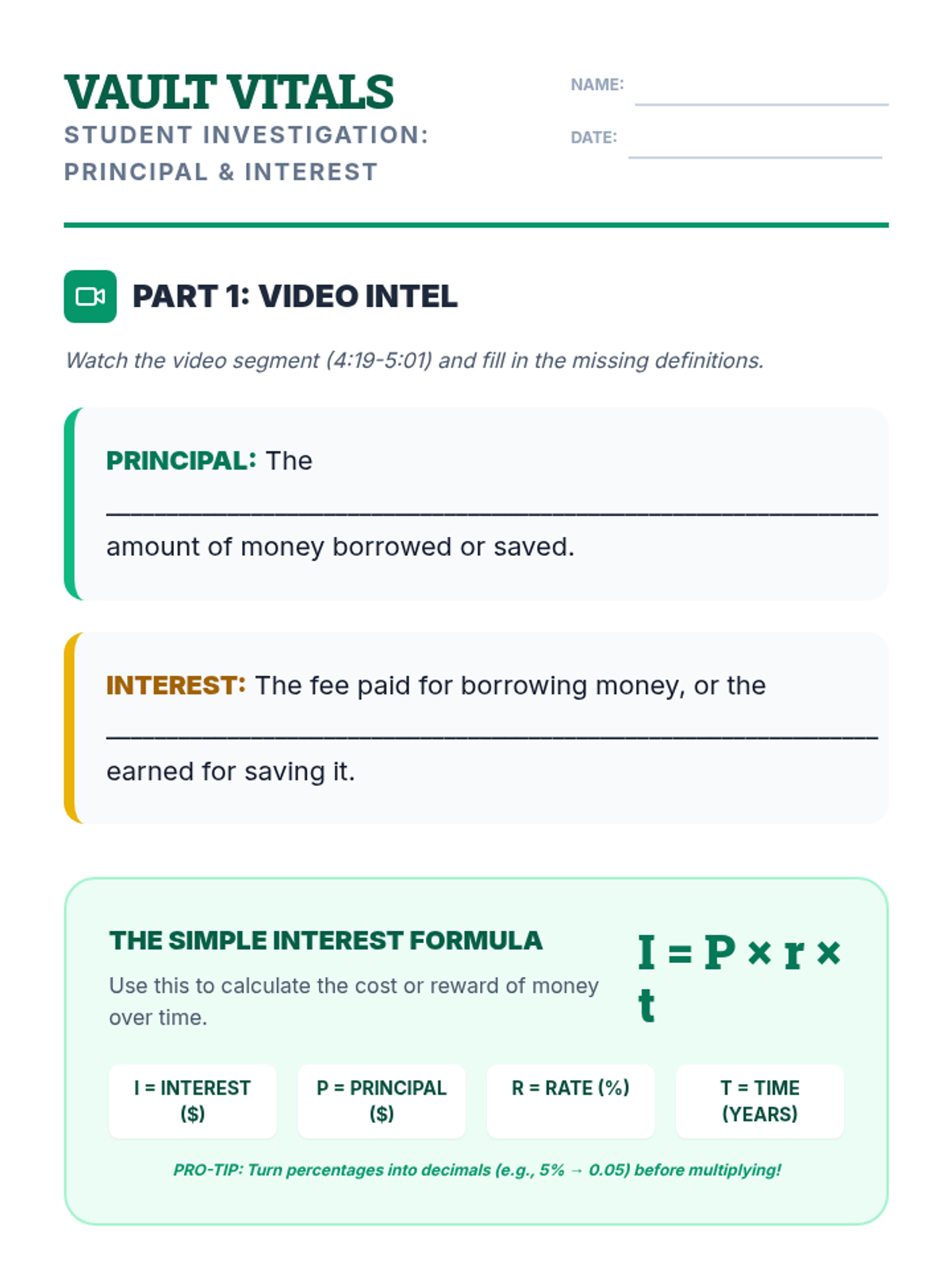 Students will learn the fundamental concepts of principal and interest by calculating simple interest in two scenarios: borrowing for a purchase and saving for the future. Through these calculations and a video analysis, students will understand how interest acts as both a cost and a reward in the banking system.