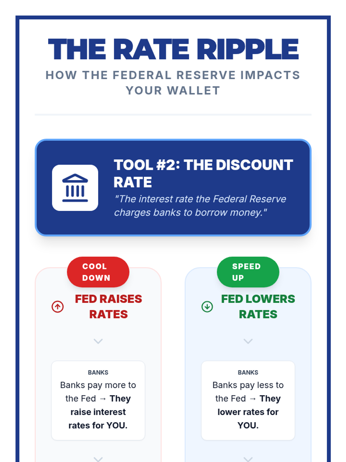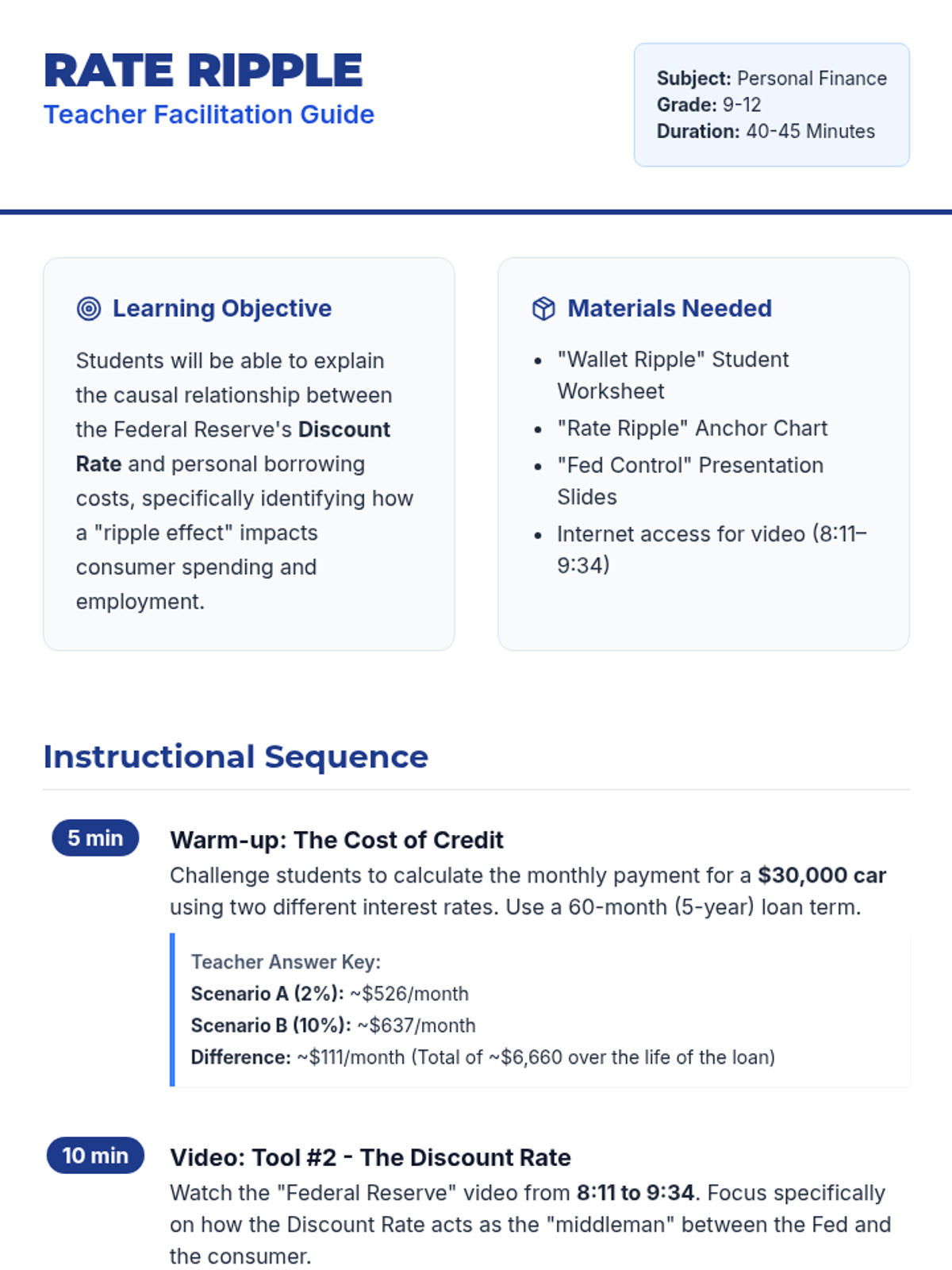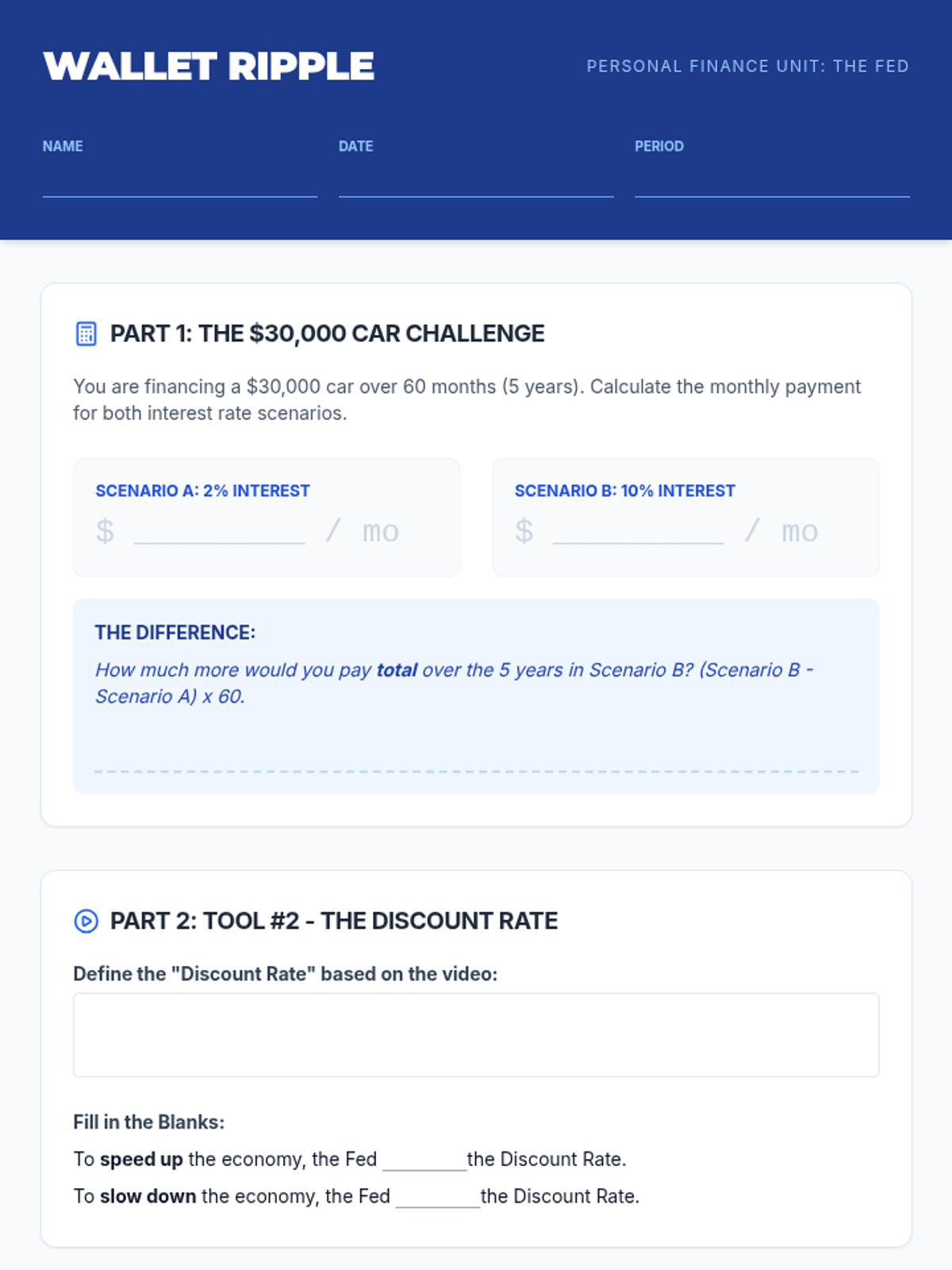 Students explore the connection between the Federal Reserve's Discount Rate and their personal finances through math, video analysis, and a ripple effect simulation.