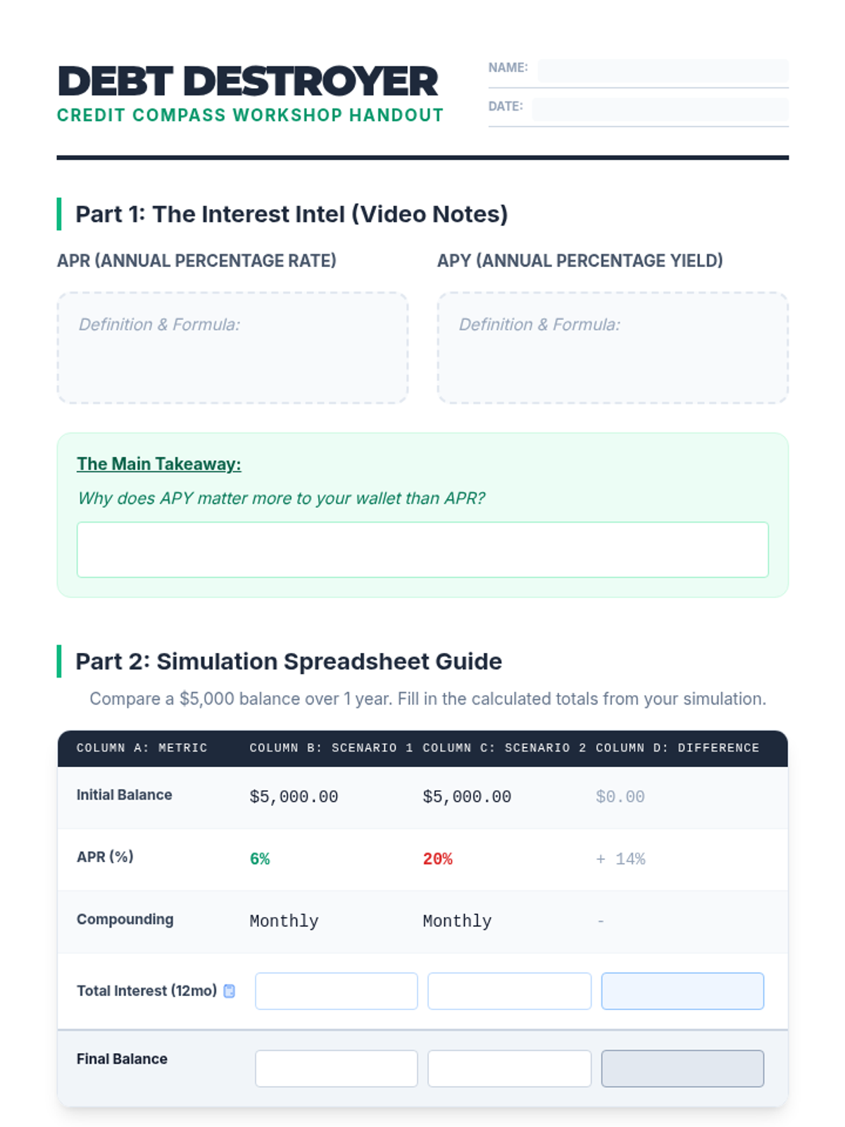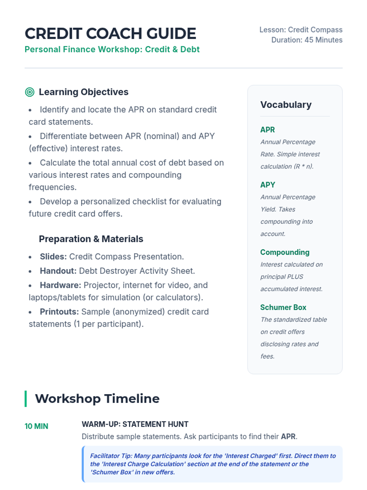 A personal finance workshop for adult learners focused on evaluating credit card offers, understanding the difference between APR and APY, and calculating the long-term costs of debt. Participants will analyze real statements, simulate interest costs, and develop a checklist for choosing new credit lines.