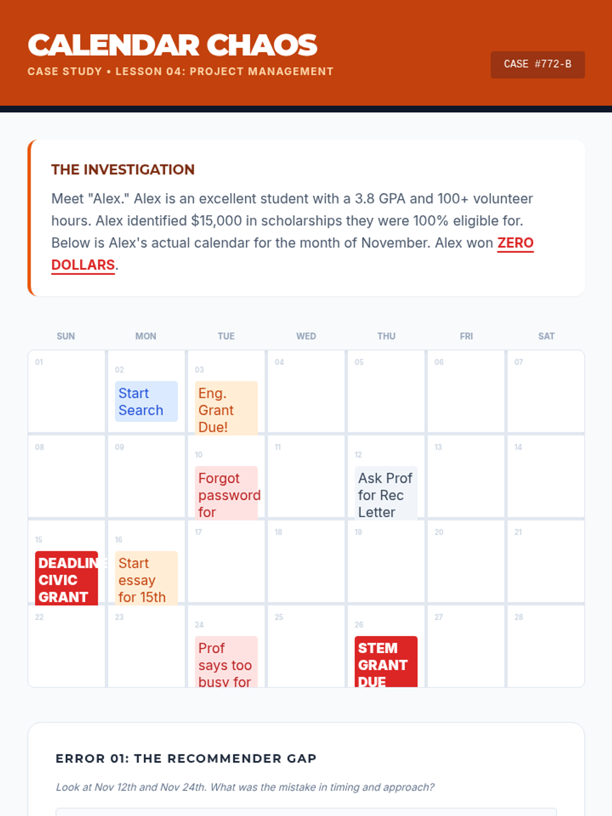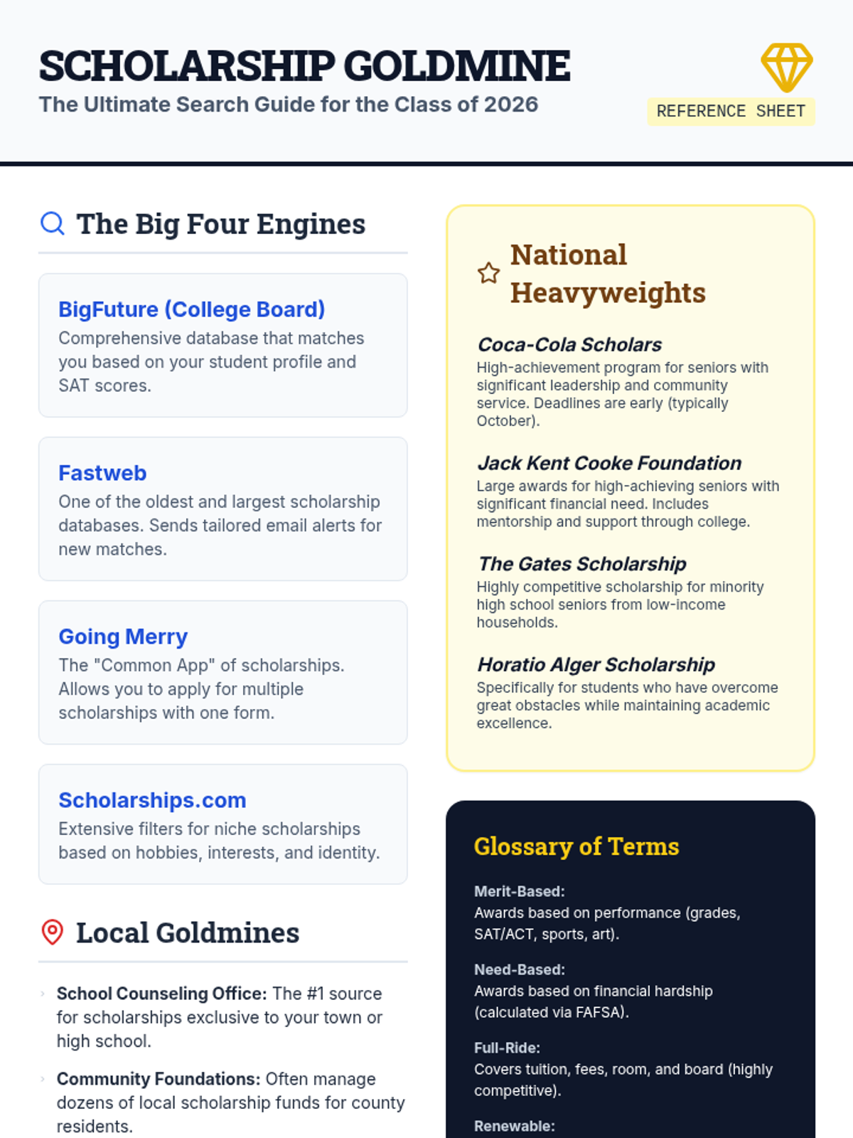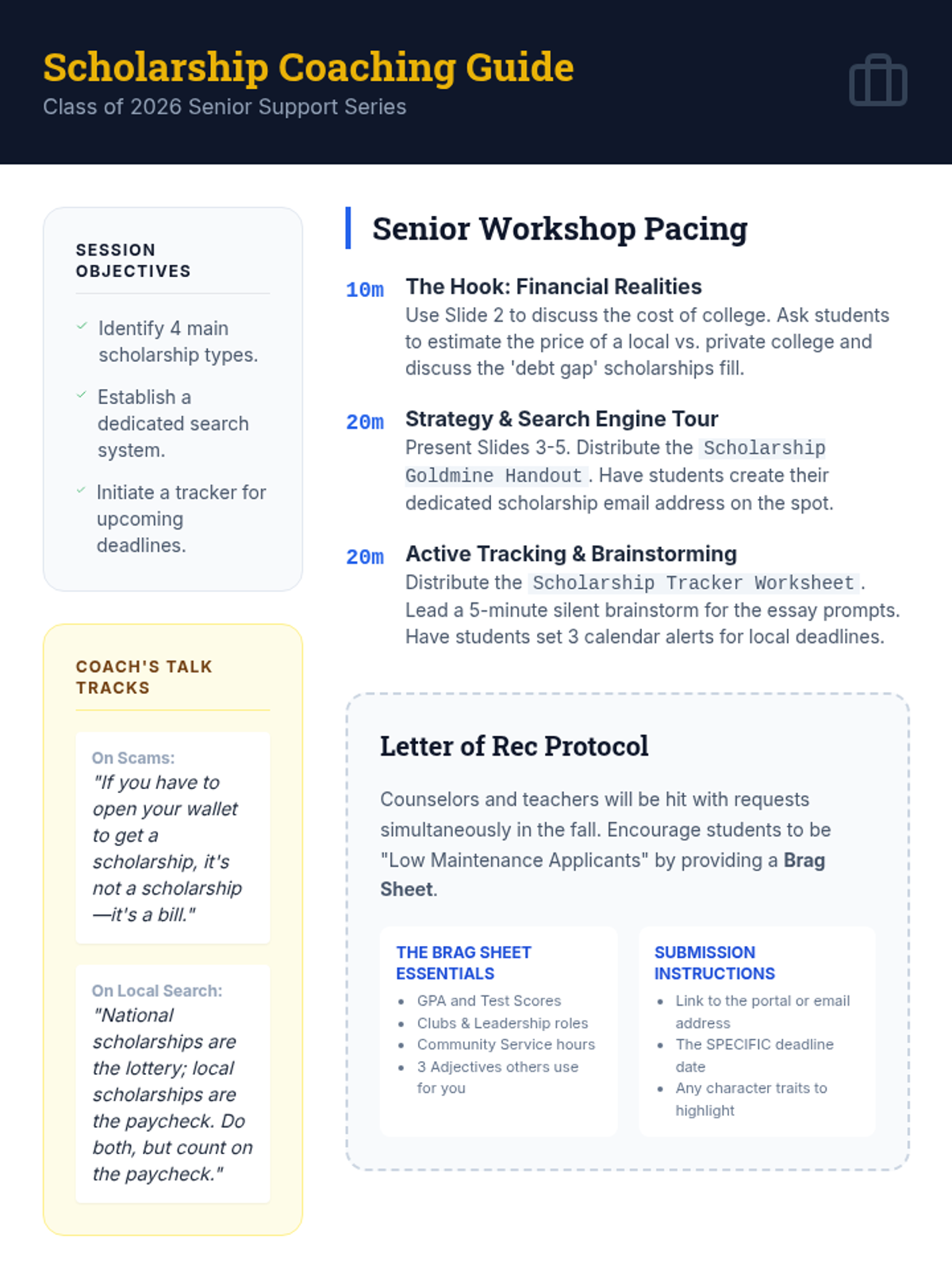 This lesson helps seniors in the class of 2026 navigate the world of scholarship hunting. It covers types of scholarships, search strategies, and organization techniques to maximize their funding potential.