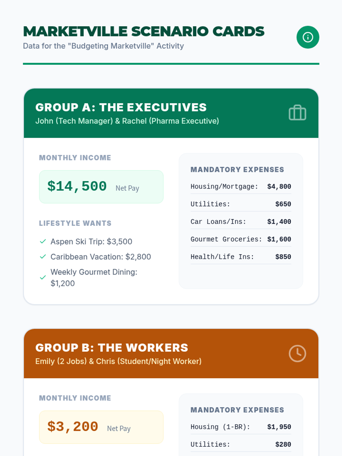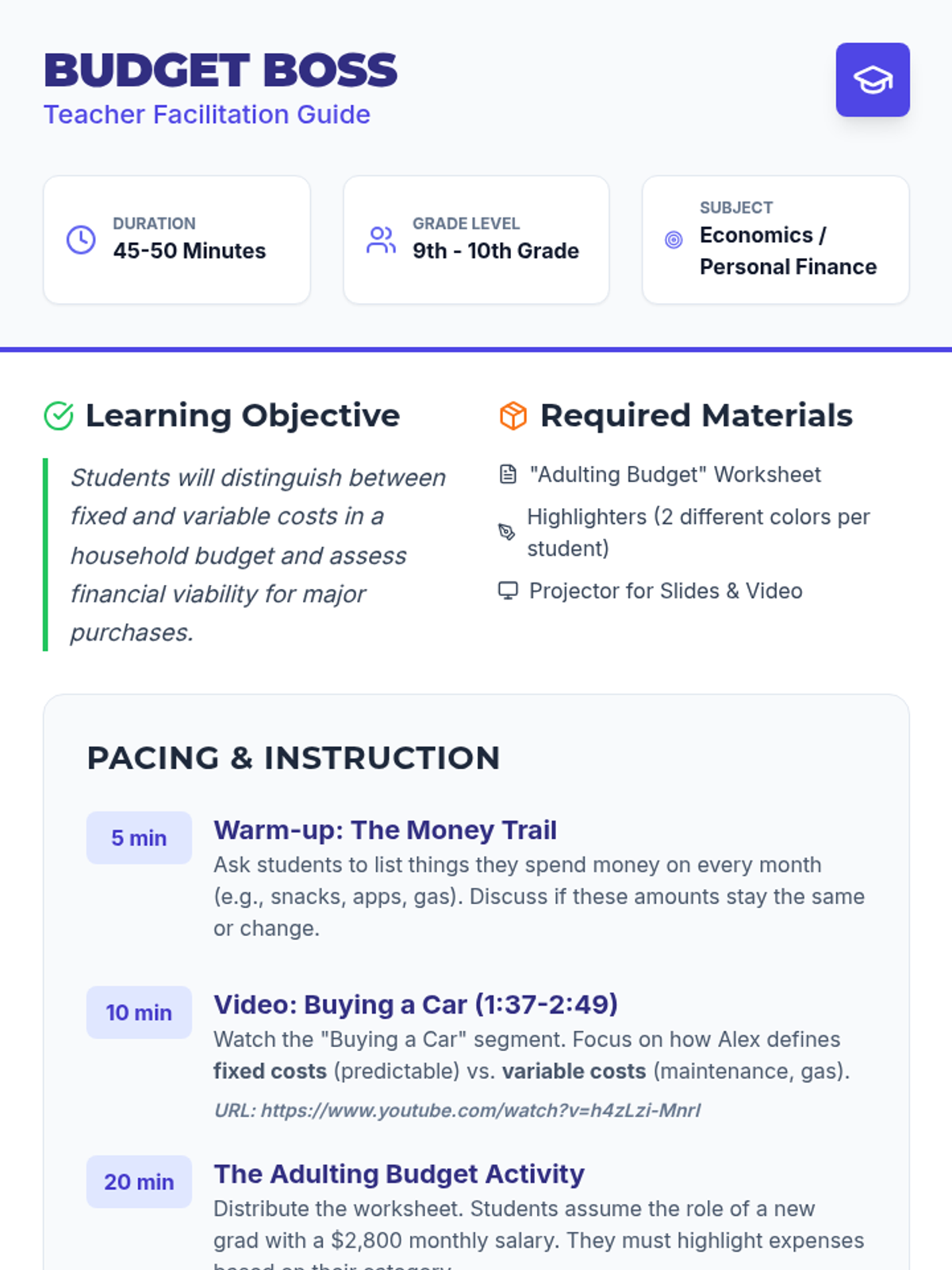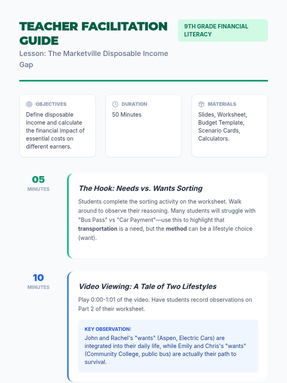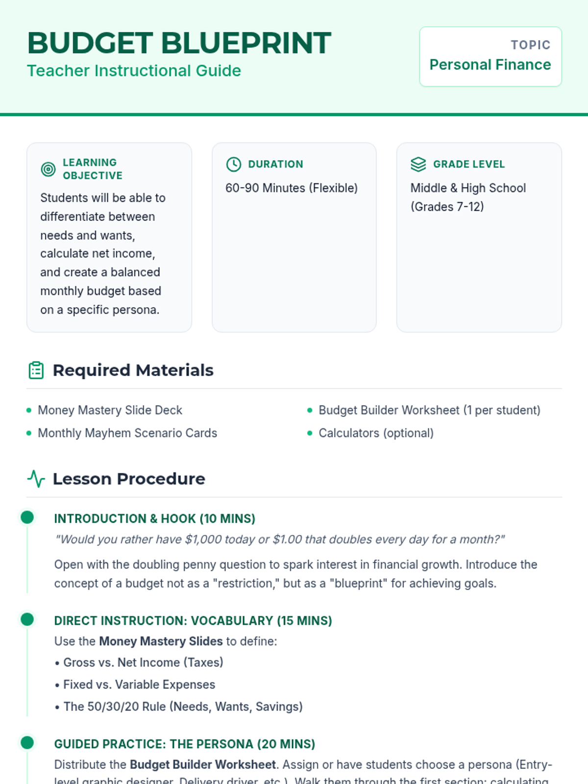 A comprehensive personal finance lesson where students learn to manage income, expenses, and savings through a realistic budget simulation and decision-making activities.