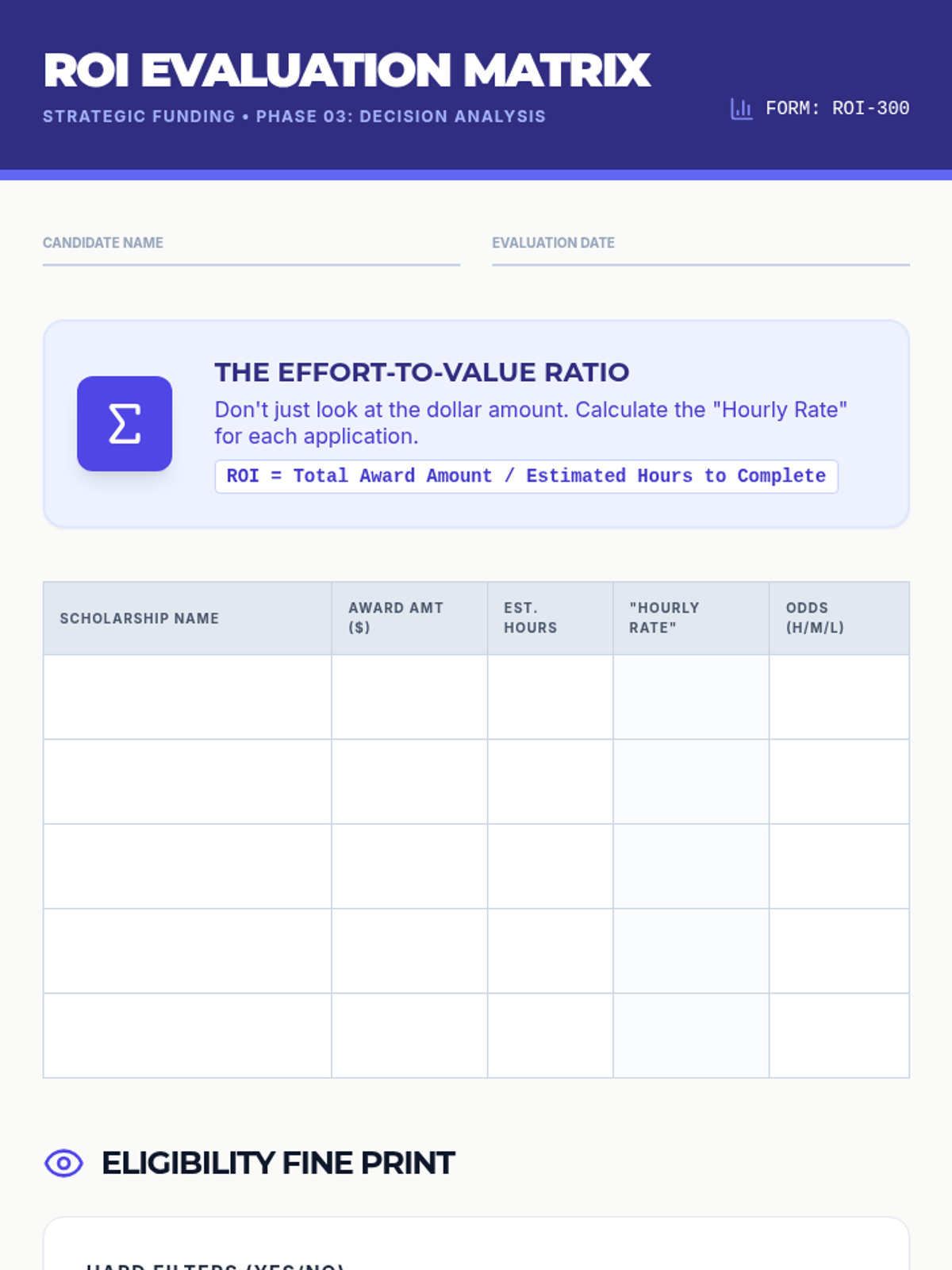 Students evaluate scholarship opportunities based on effort-to-value ratios and eligibility requirements.