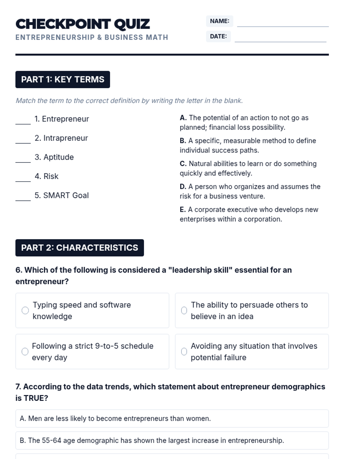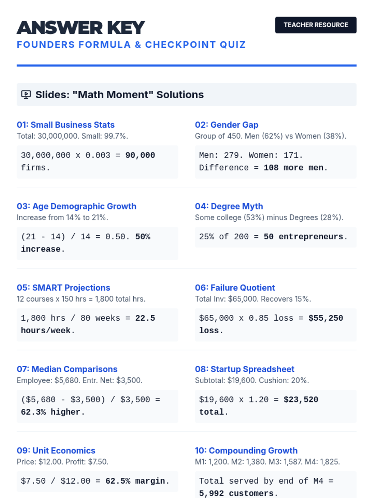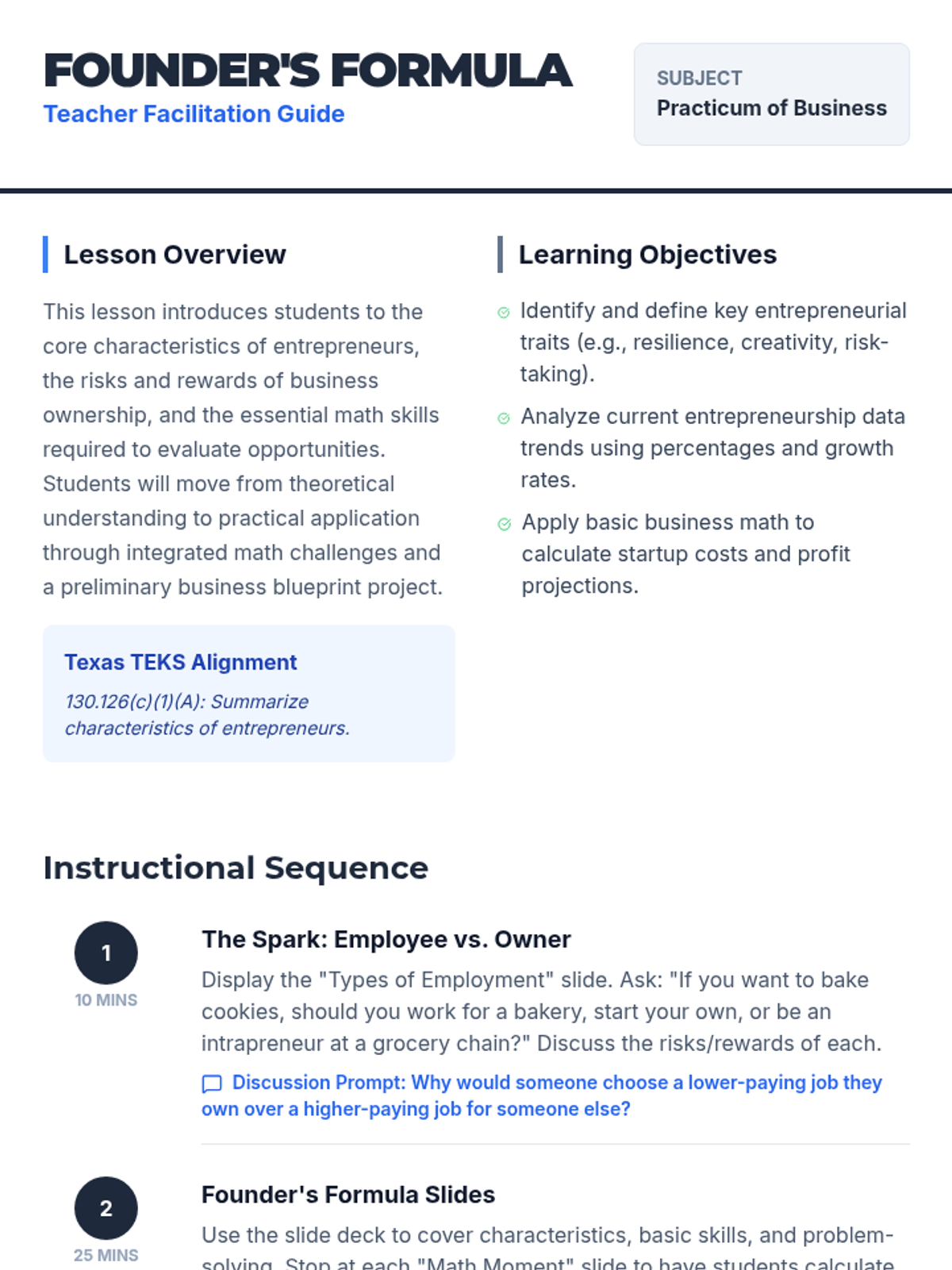 A comprehensive lesson exploring the mindset and characteristics of entrepreneurs, featuring integrated business mathematics and a hands-on startup project. Students will analyze data trends, calculate financial risks, and develop their own business blueprints based on Texas Practicum of Business TEKS.