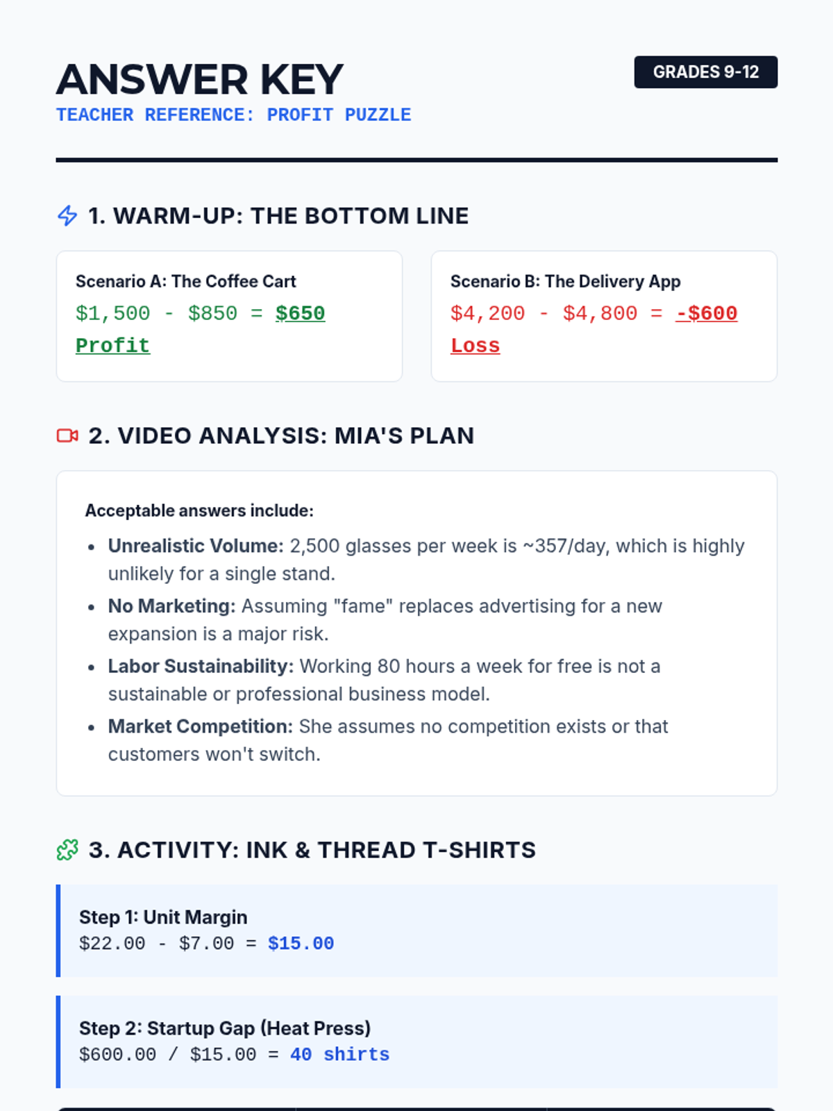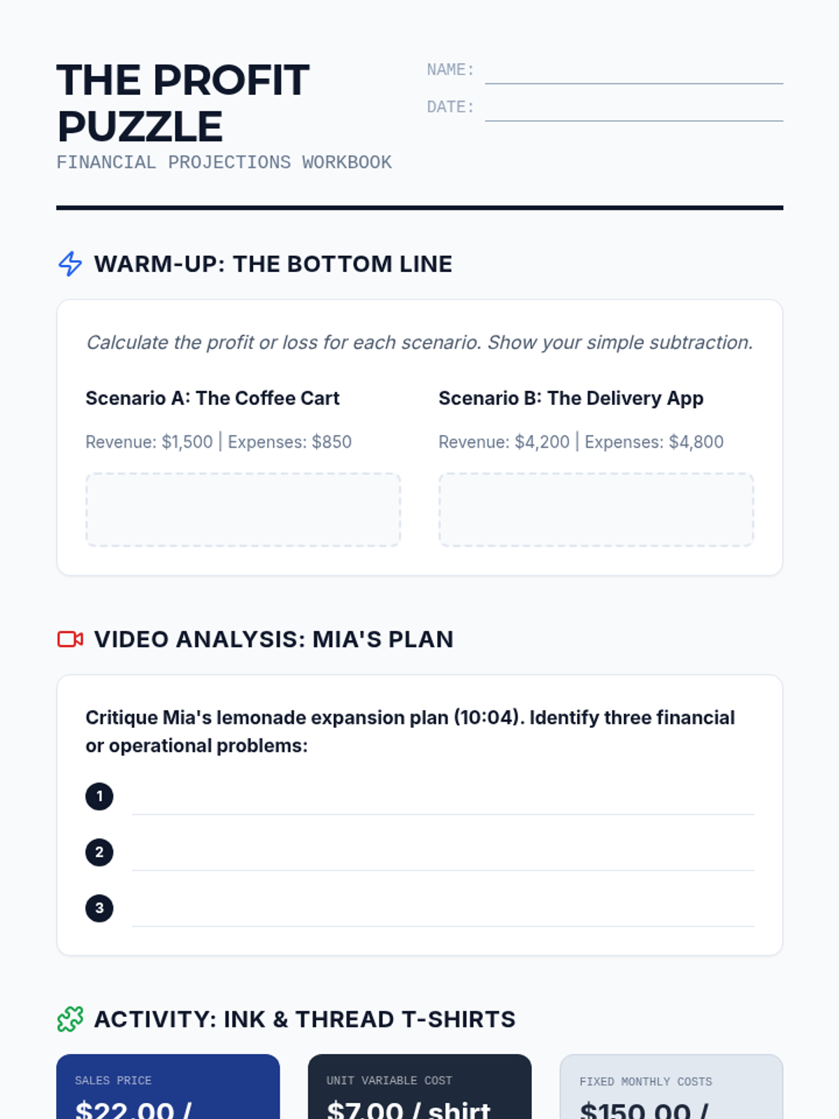 A high school financial literacy lesson focused on calculating revenue, costs, and profit. Students critique a flawed business plan from a video and complete a detailed financial projection activity for a startup T-shirt business.