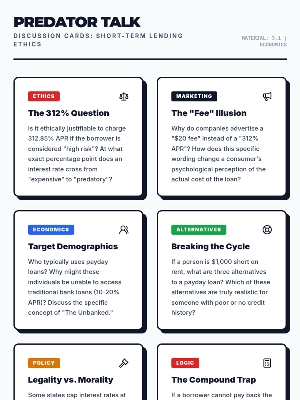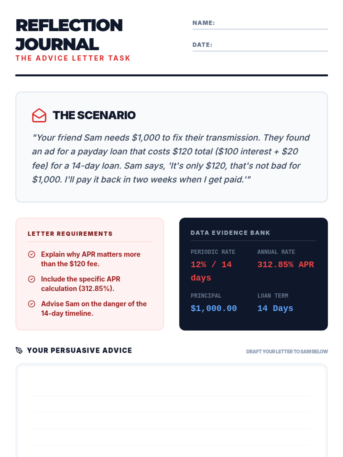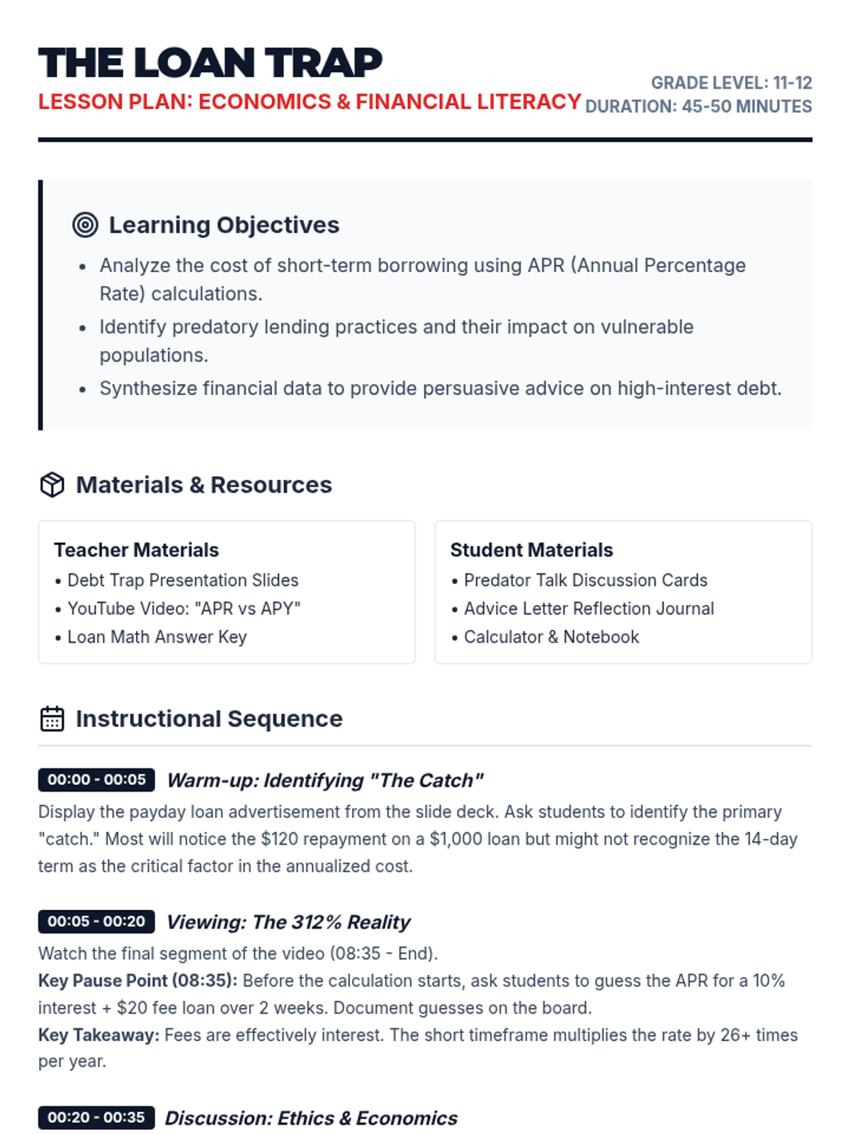 A high-school economics lesson analyzing the mathematical reality and predatory nature of short-term lending, specifically focusing on payday loans and APR calculations. Students will use real-world data to calculate the true cost of borrowing and practice persuasive financial communication.