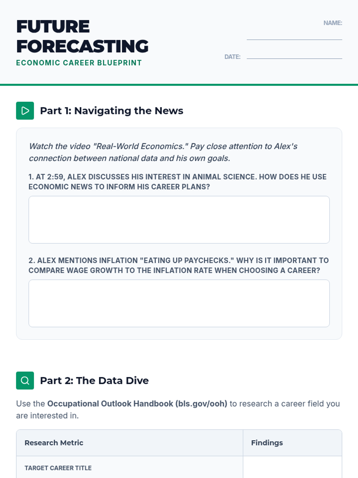 A high school economics lesson that connects macroeconomic indicators (unemployment, inflation, industry growth) to personal career planning using real-world data and video analysis.