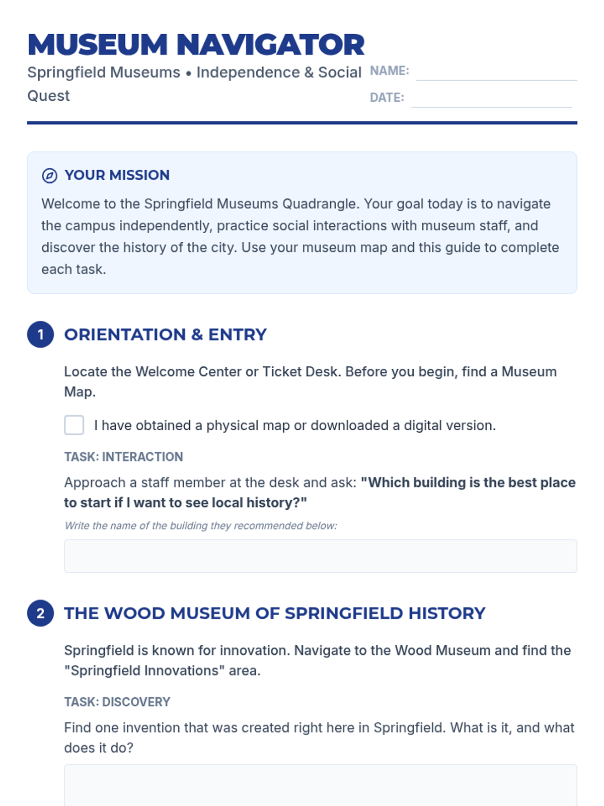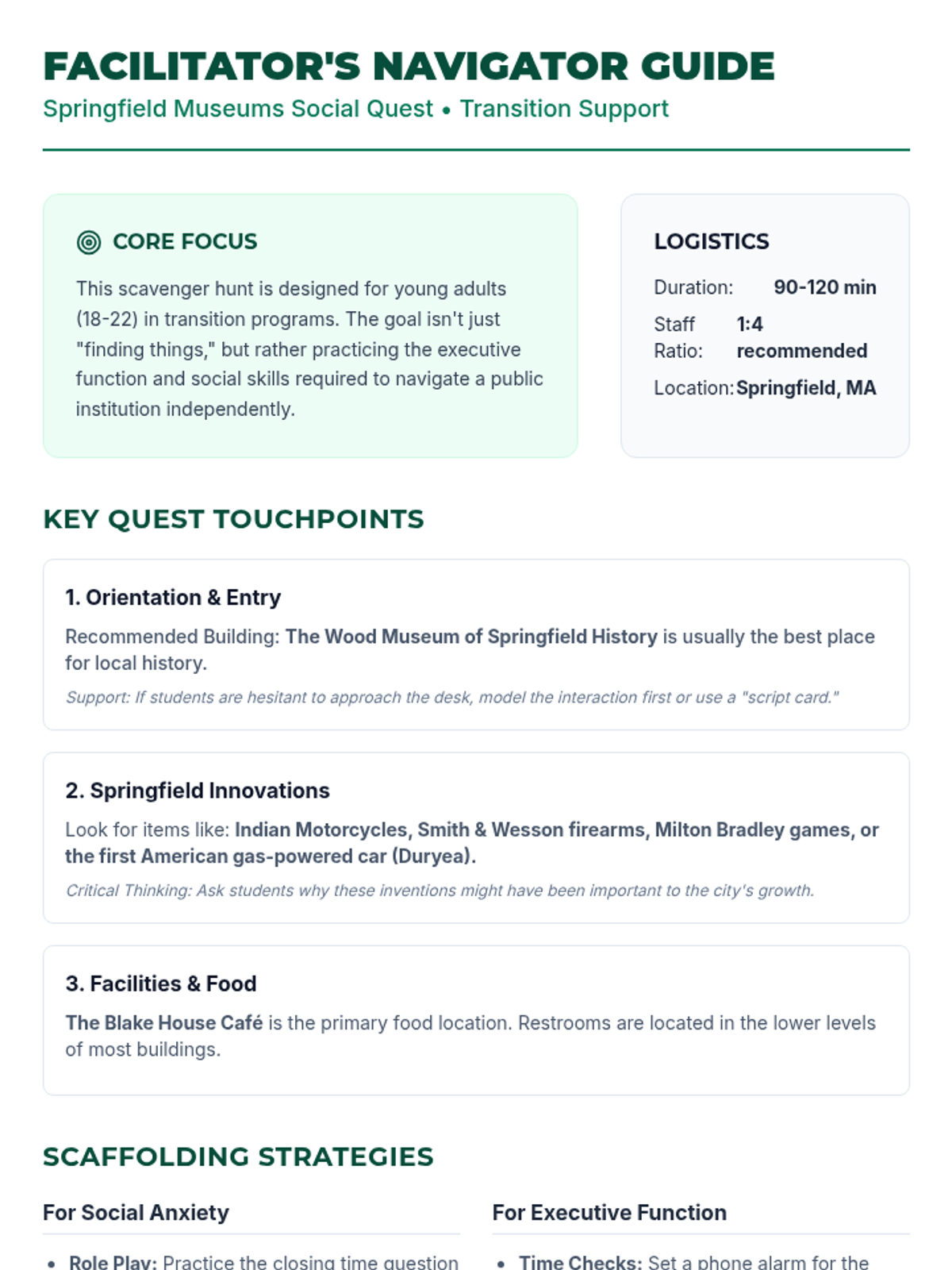 A scavenger hunt and social learning experience designed for young adults (18-22) at the Springfield Museums in Massachusetts. This lesson focuses on community independence, social navigation, and functional literacy in a public cultural setting.