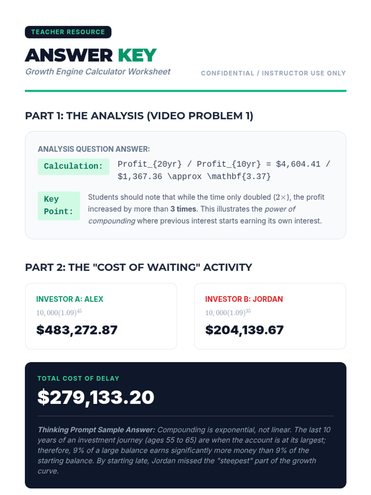 This lesson explores the exponential power of time in investing, focusing on how compound interest accelerates growth over longer durations and calculating the 'cost of waiting' to start an investment journey.
