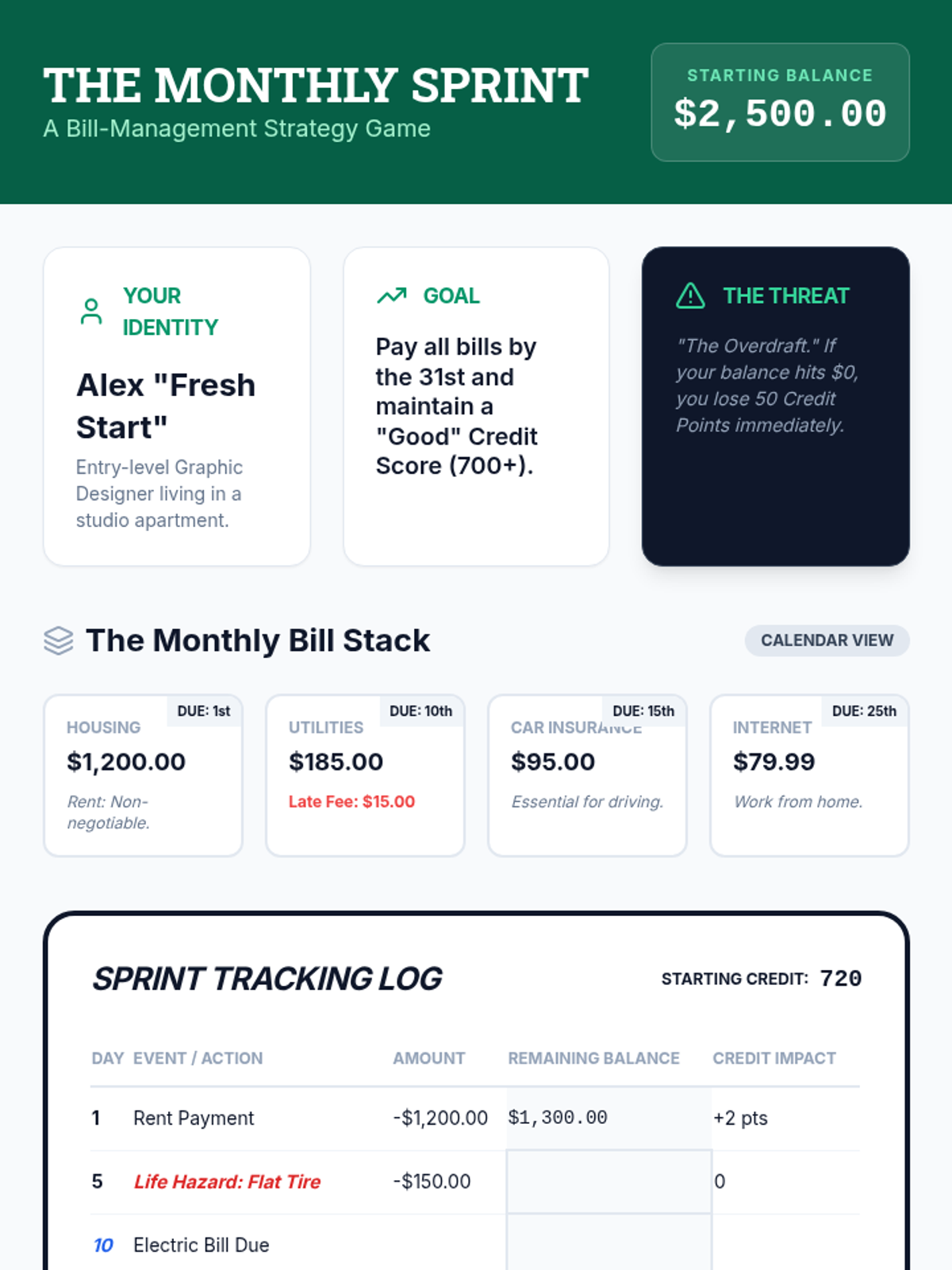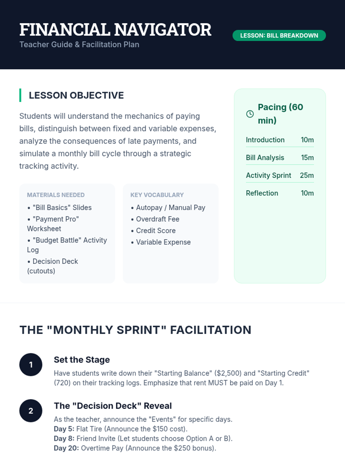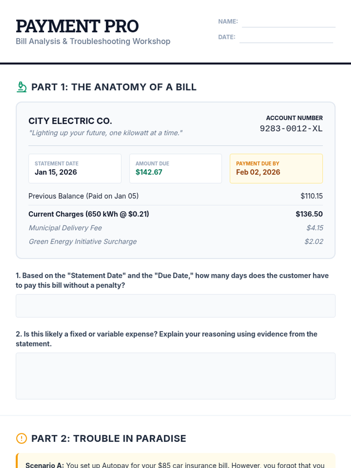 A comprehensive lesson for high school seniors focused on the mechanics, strategy, and consequences of paying bills, featuring a simulated monthly bill cycle activity.