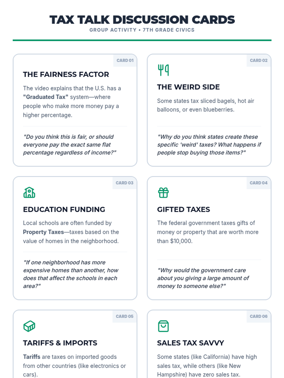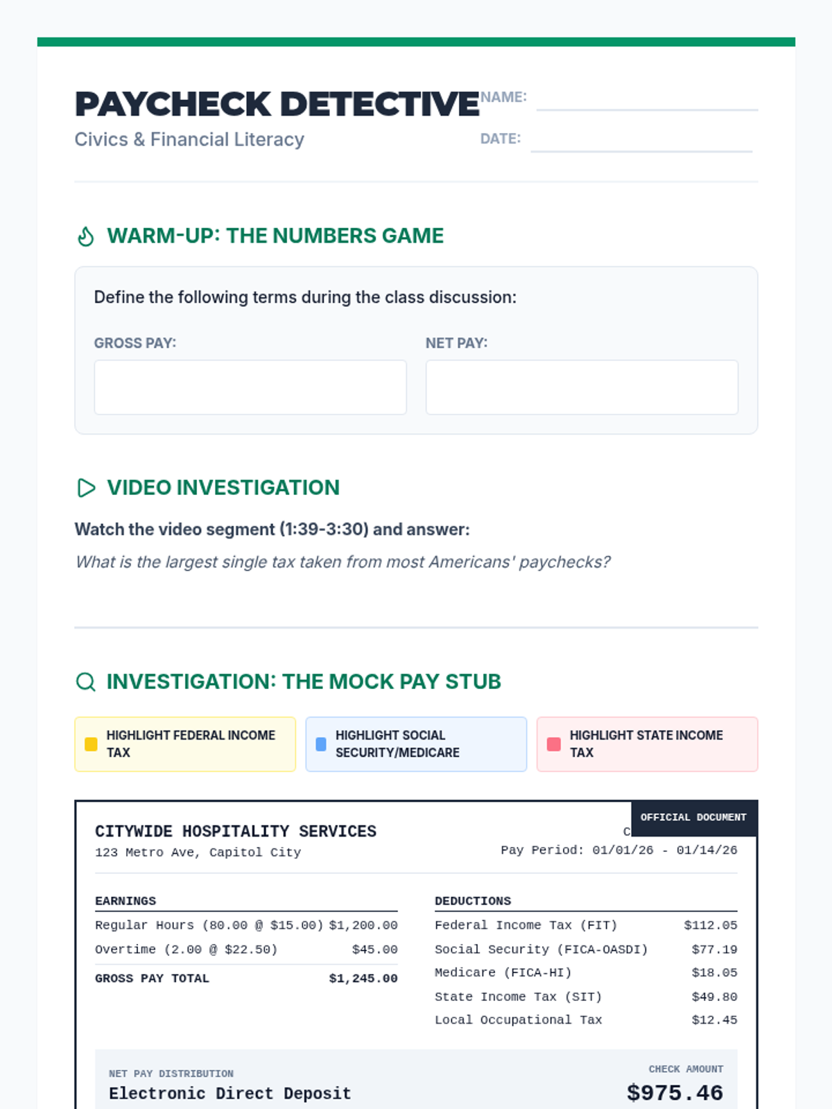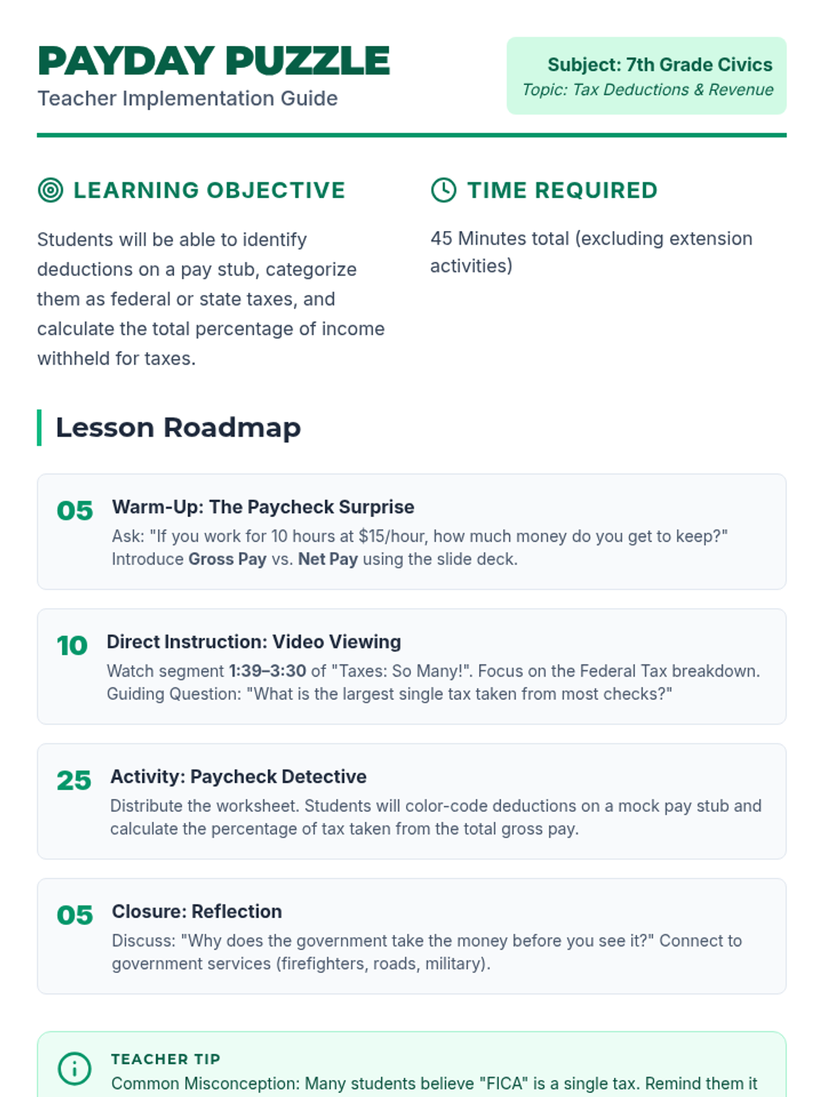 A 7th-grade civics lesson where students decode a pay stub, categorize tax deductions, and analyze how government revenue is collected at federal and state levels.