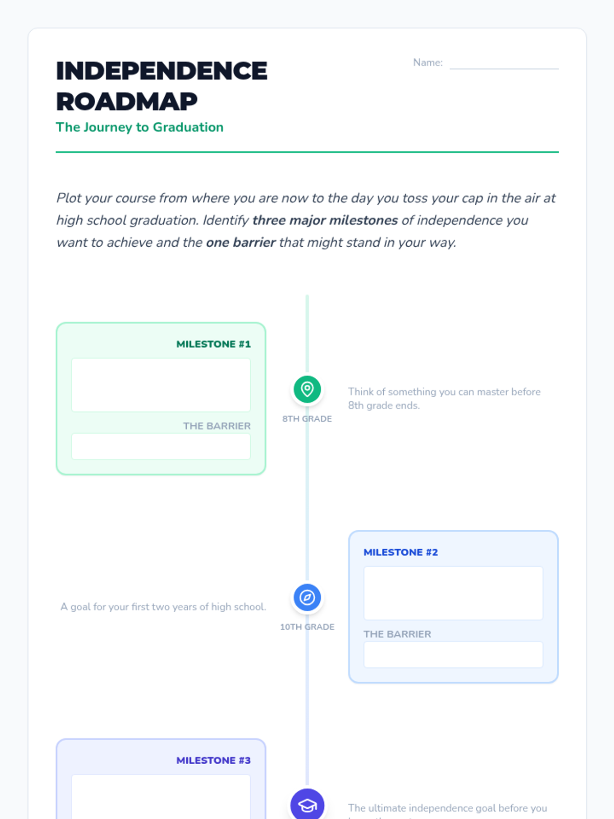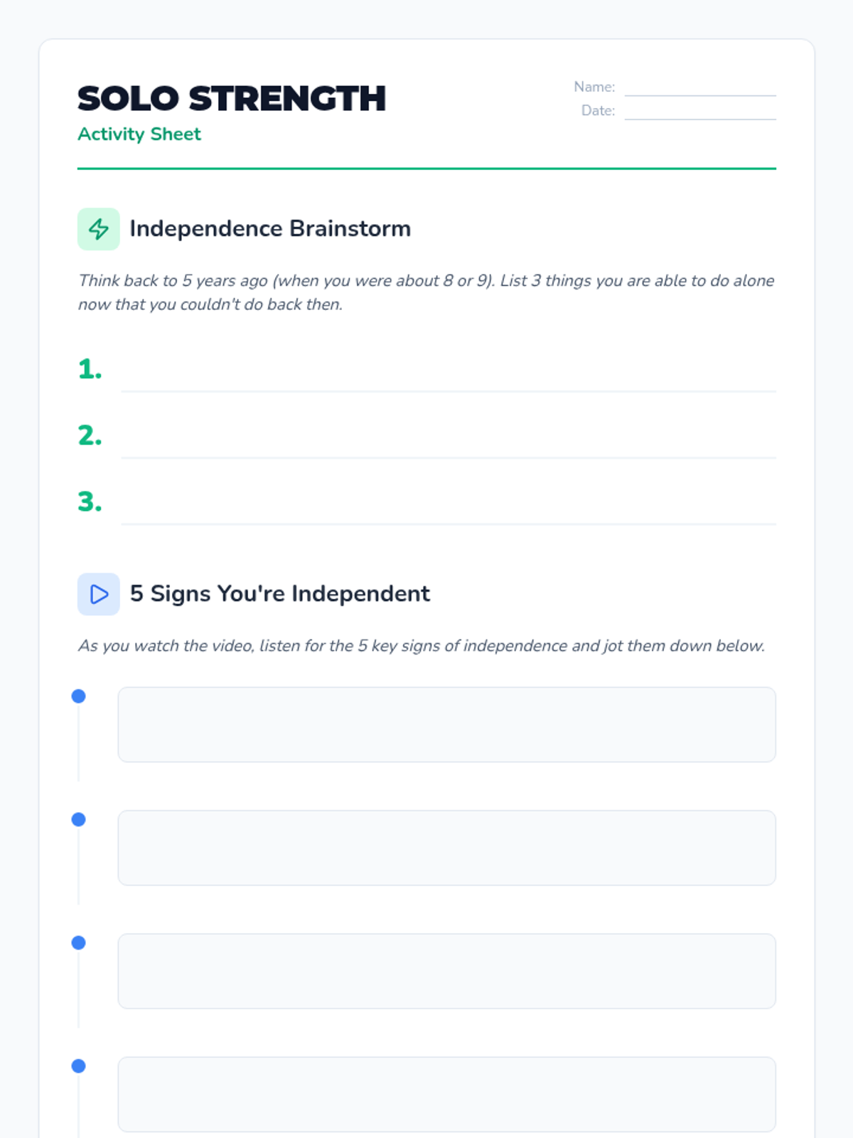 A lesson for 8th graders to explore self-sufficiency and set personal goals for independence as they transition toward high school. Includes a video analysis of '5 Signs You\'re An Independent Person' and the creation of a personal 'Independence Roadmap'.
