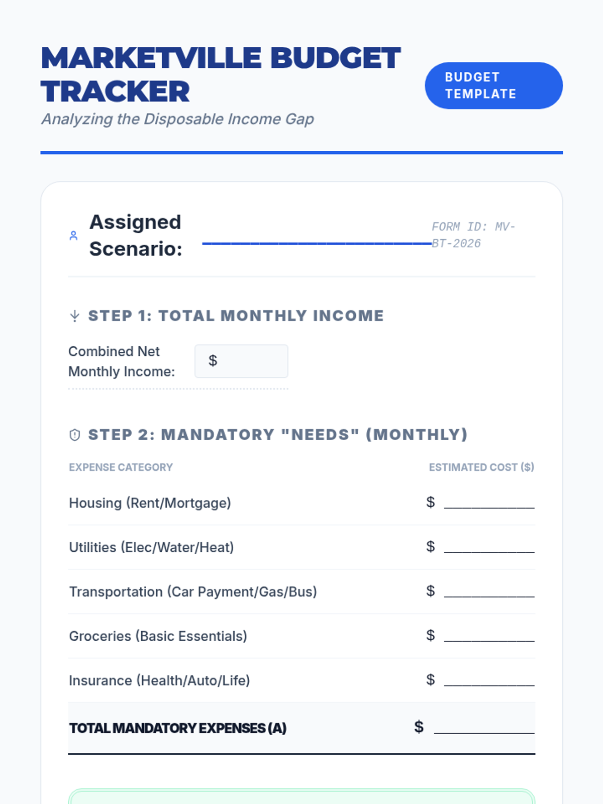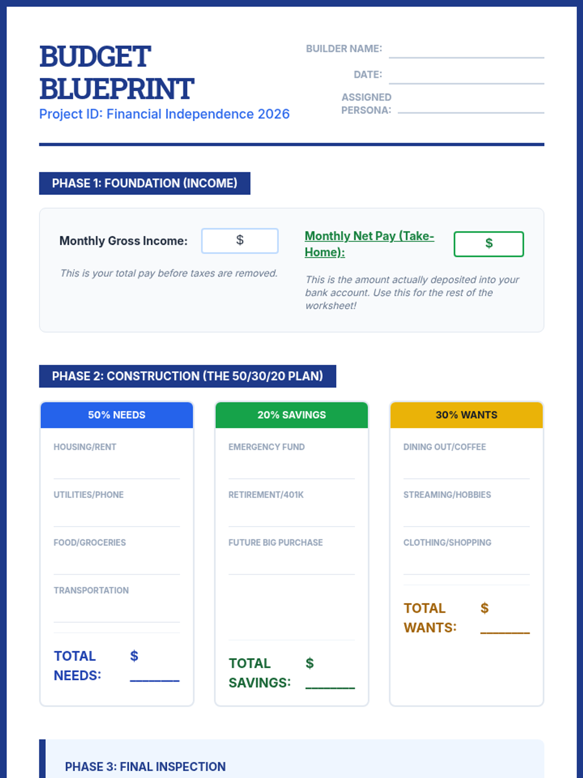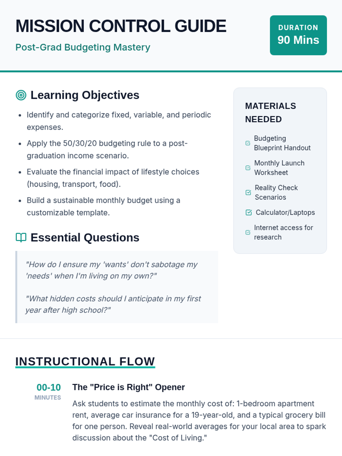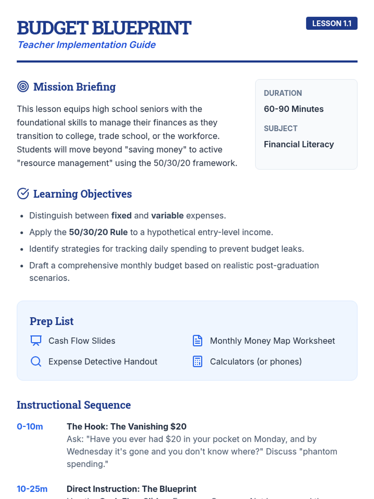 A comprehensive lesson designed to prepare high school seniors for financial independence by teaching them how to create a realistic monthly budget and track their daily expenses using the 50/30/20 rule.