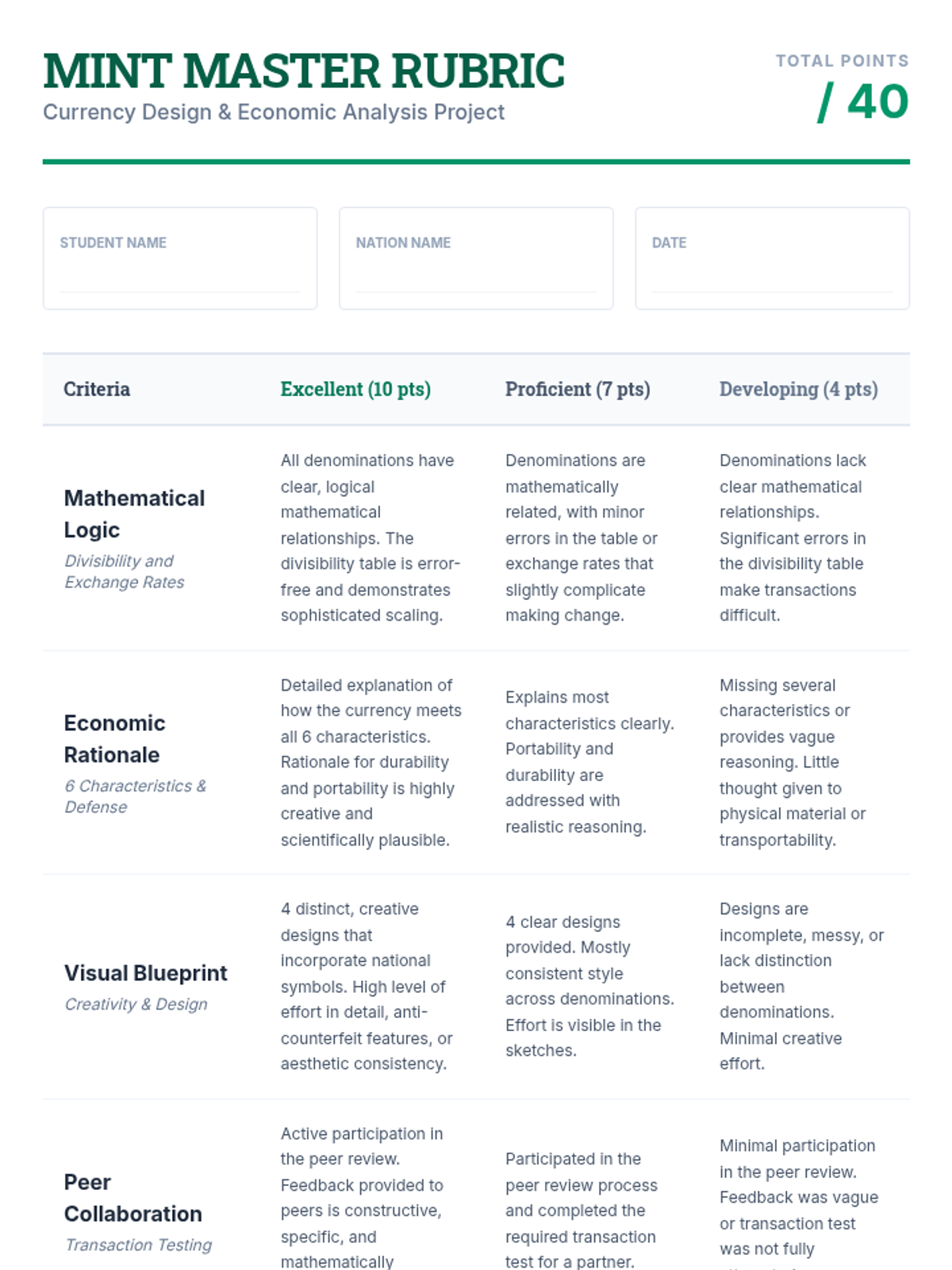 Students explore the six characteristics of money and the math of divisibility by designing their own currency system for a fictional nation, establishing exchange rates and denominations.