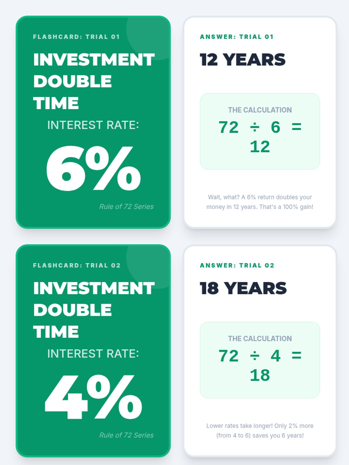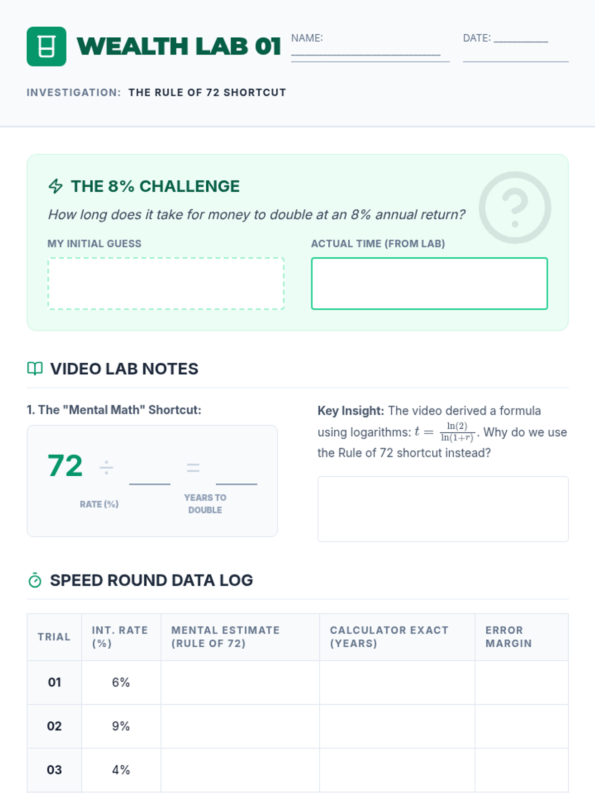 A high-speed lesson teaching students how to estimate the doubling time of investments using the Rule of 72 mental math shortcut. Students compare mental estimates with exact logarithmic calculations to understand the rule's power and limitations.