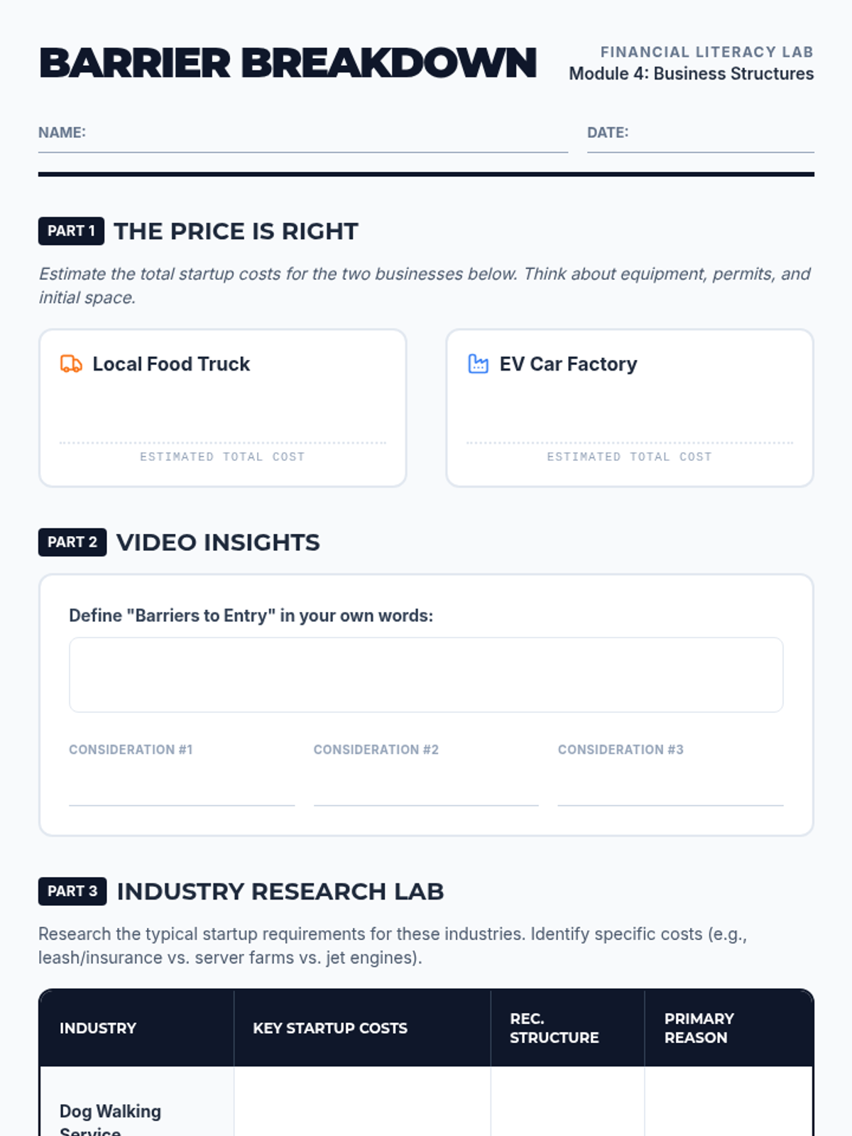 Students will investigate how startup costs and barriers to entry dictate the most appropriate business structure for different industries. They will research real-world startup requirements and justify business organizational choices based on capital needs and liability risks.