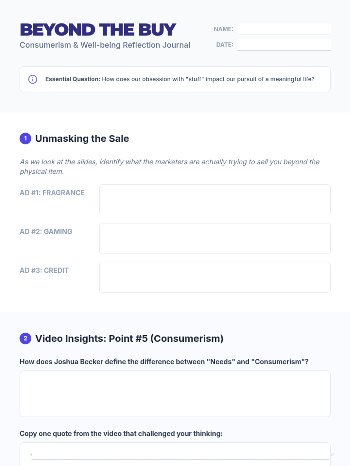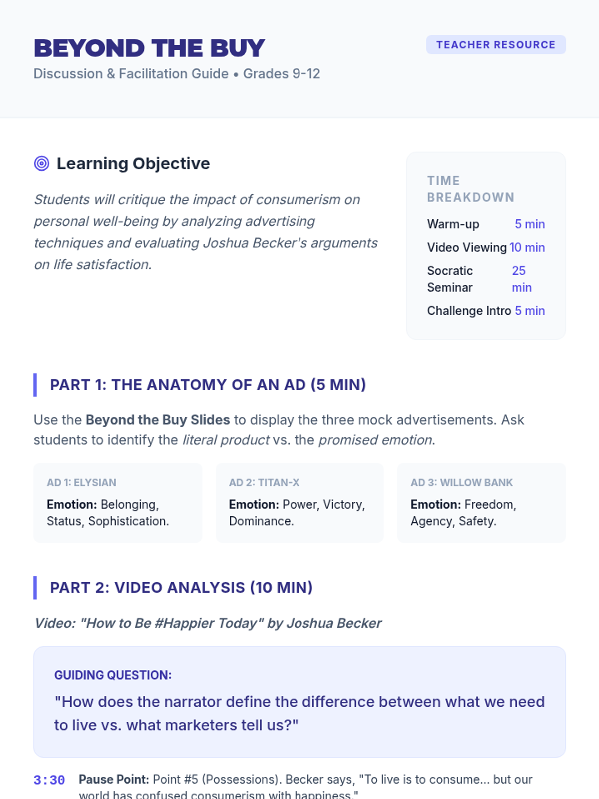 A high school lesson exploring the psychological impact of consumerism and how to cultivate long-term life satisfaction beyond material possessions, based on Joshua Becker's insights.