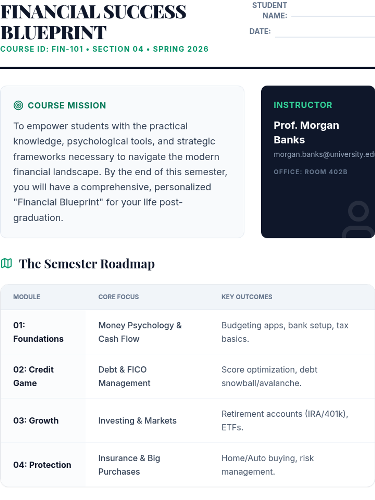 A foundational introductory lesson for a college-level personal finance course, focusing on the importance of financial literacy, core concepts, and setting the stage for the semester.