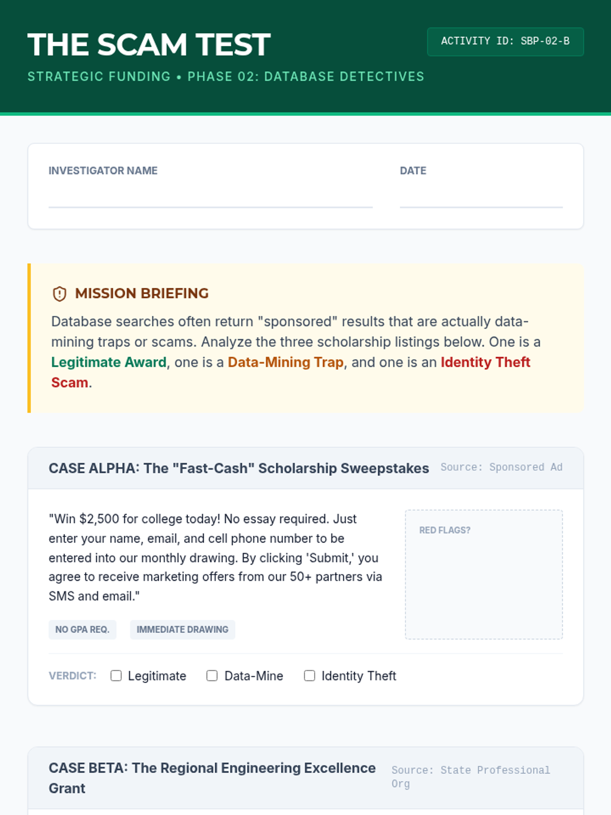 Students learn to identify red flags in scholarship offers and develop critical thinking skills to avoid financial aid scams.