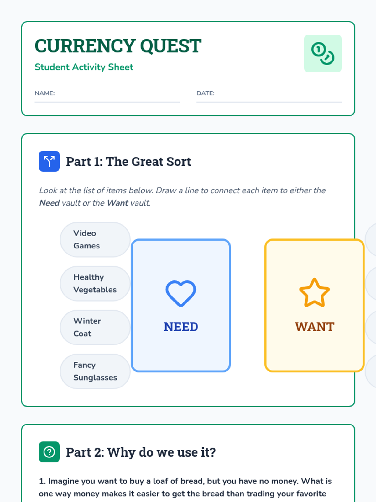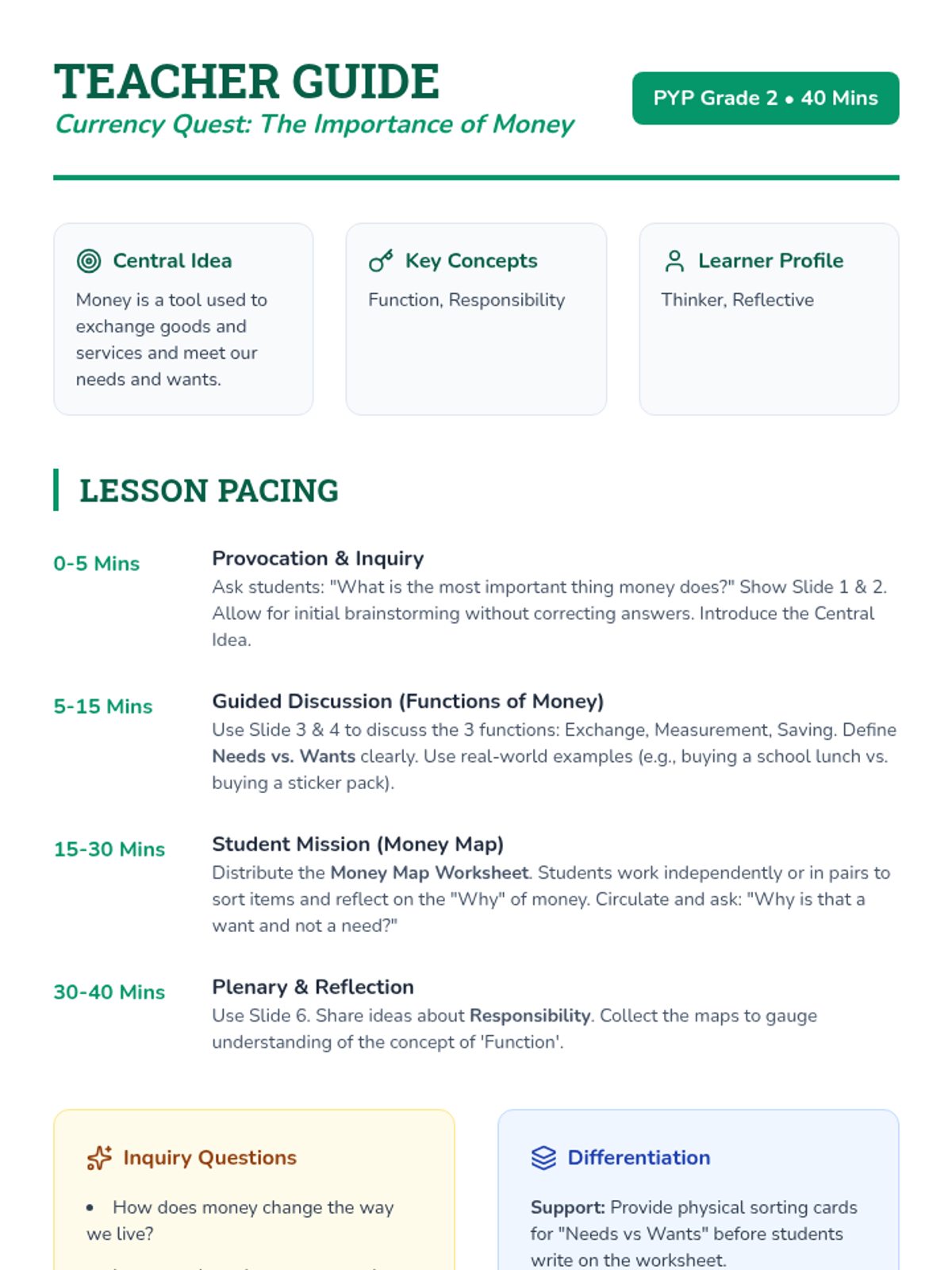 A 40-minute PYP inquiry into the functions of money, helping second graders distinguish between needs and wants while exploring how money acts as a tool for exchange.