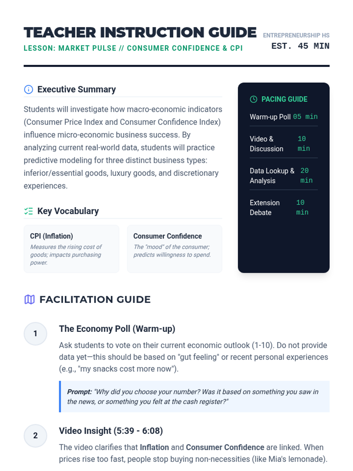 A high school entrepreneurship lesson analyzing how consumer confidence and inflation (CPI) impact business revenue through real-world data analysis and case studies. Students evaluate three different business models to determine their resilience in various economic climates.