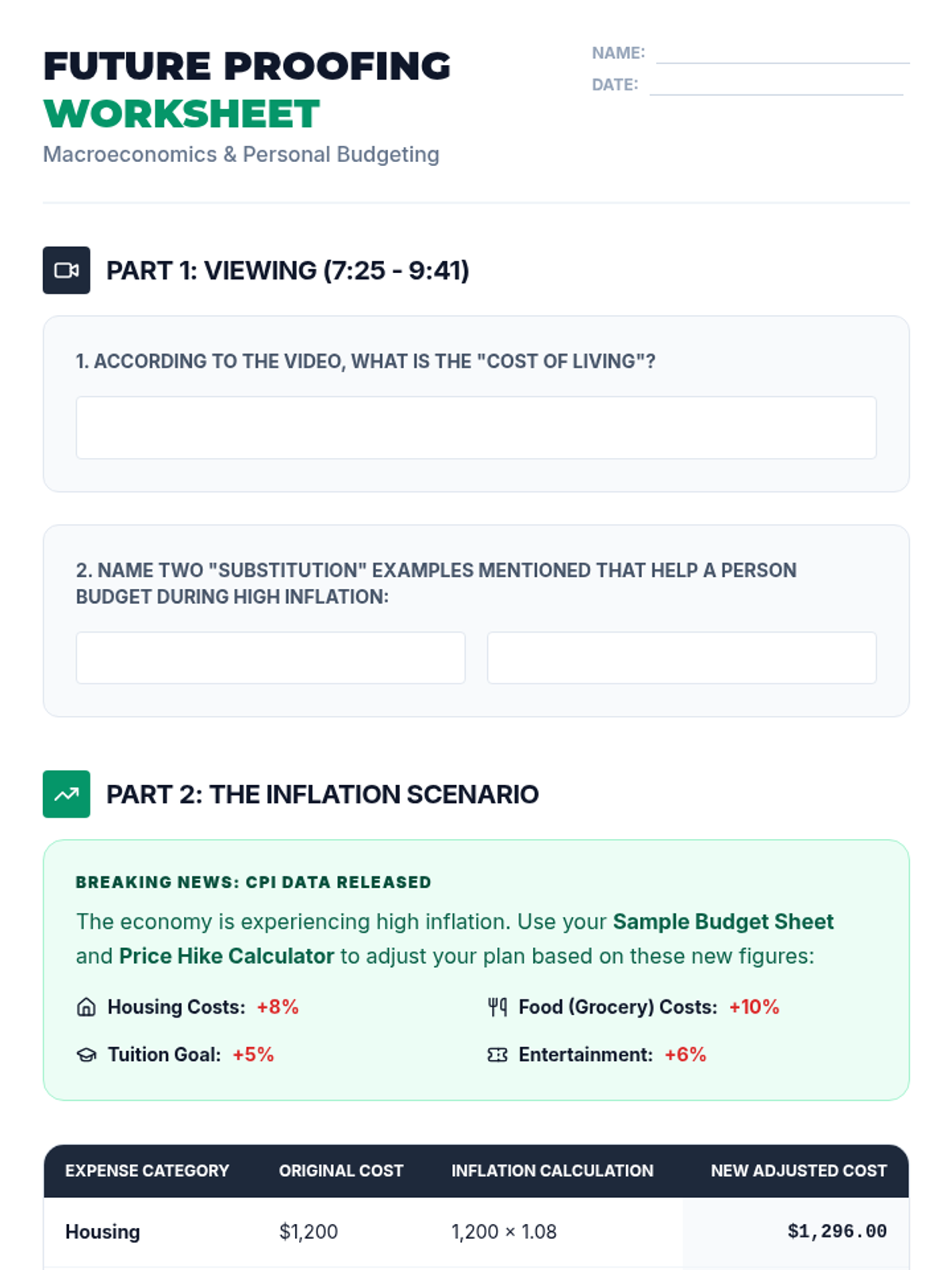 A high school financial literacy lesson connecting macroeconomic trends (CPI and inflation) to personal budgeting and long-term financial planning. Students learn to analyze cost-of-living adjustments and make strategic spending trade-offs to remain solvent in changing economic conditions.