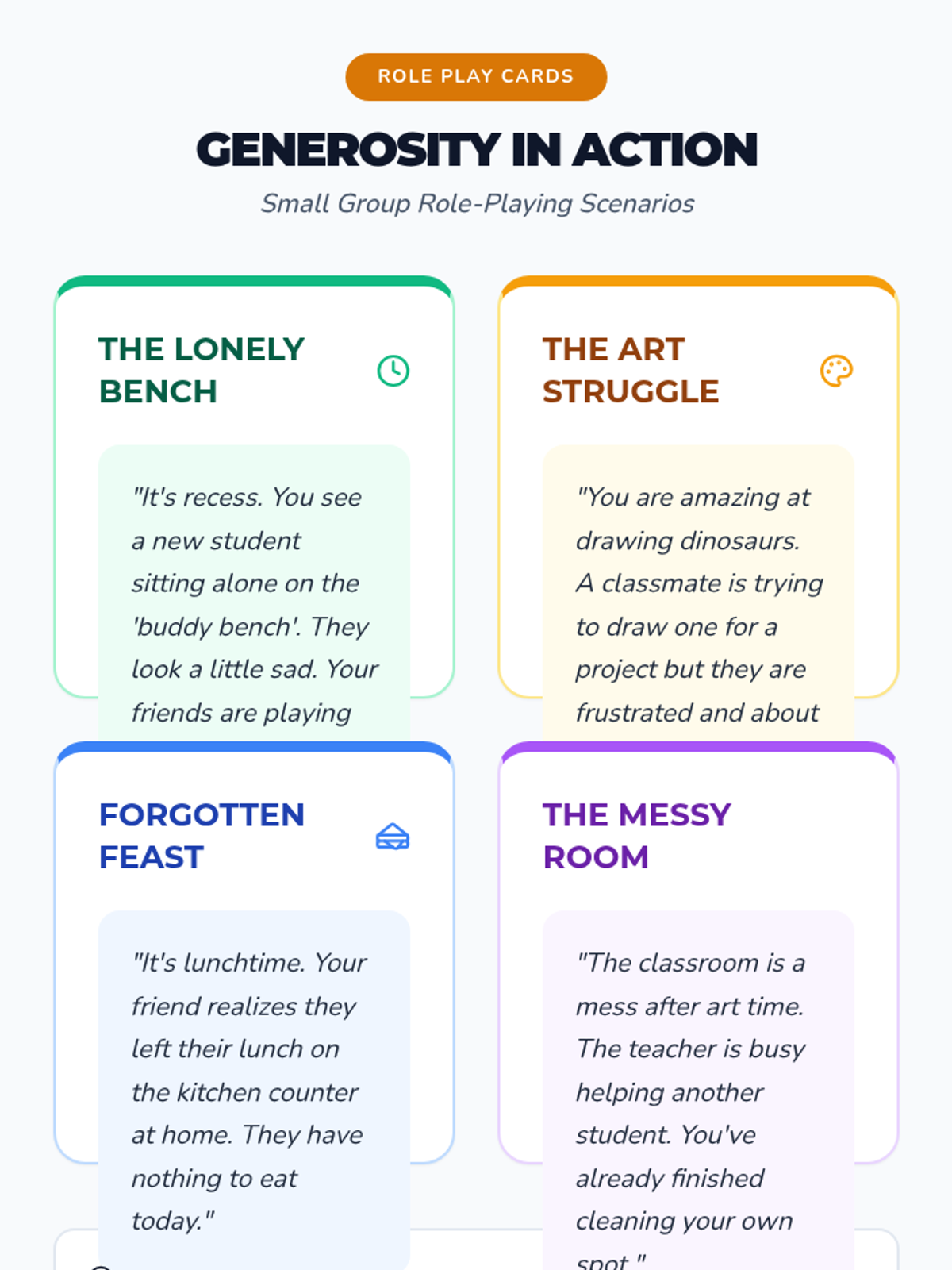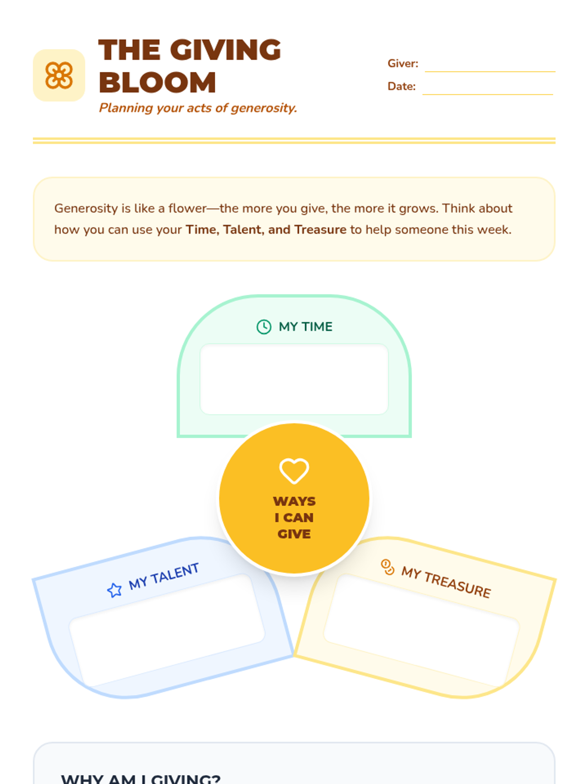 Explores different ways to be generous—time, talent, and treasure—through interactive role-play scenarios and a giving-focused graphic organizer.