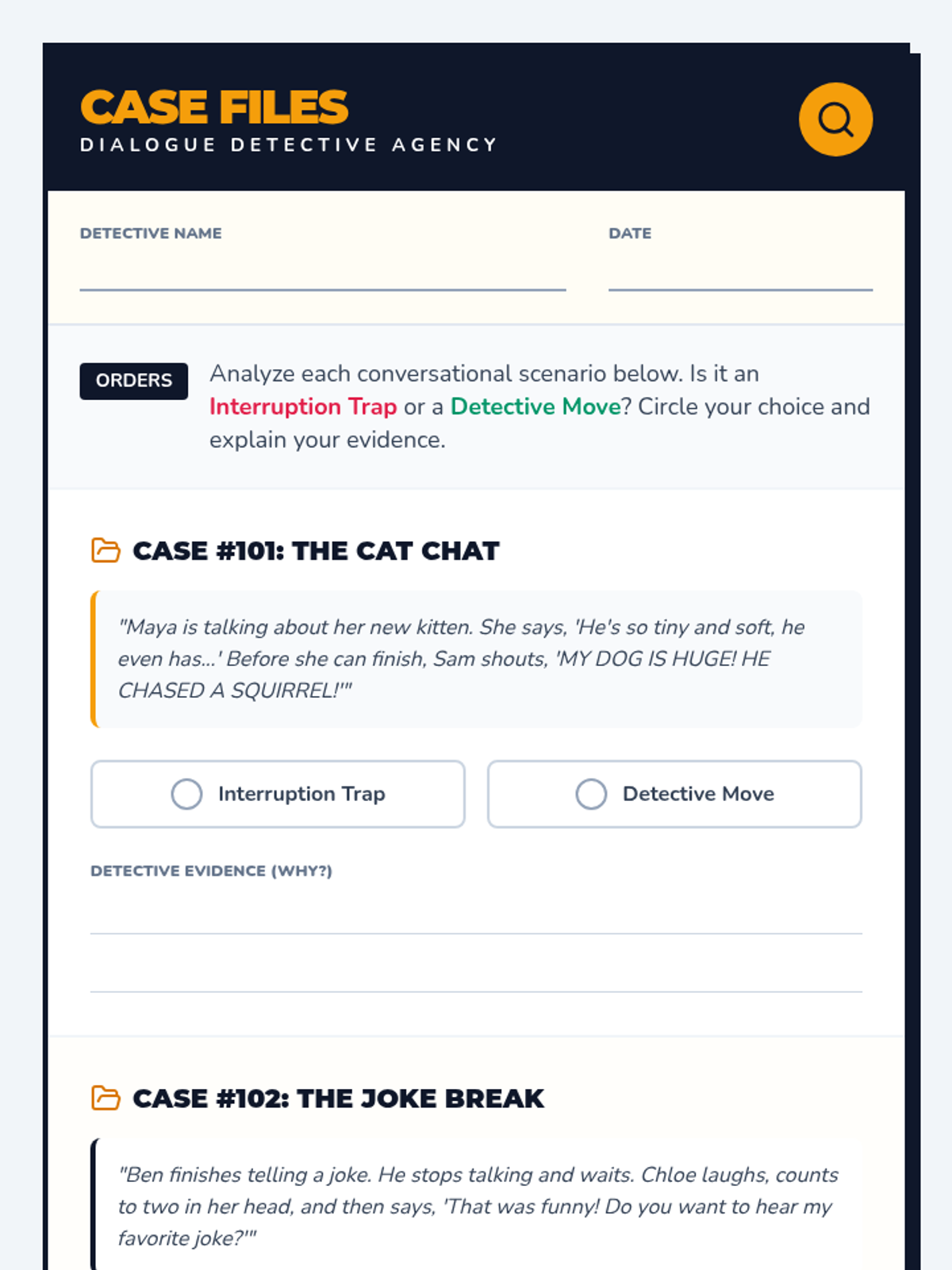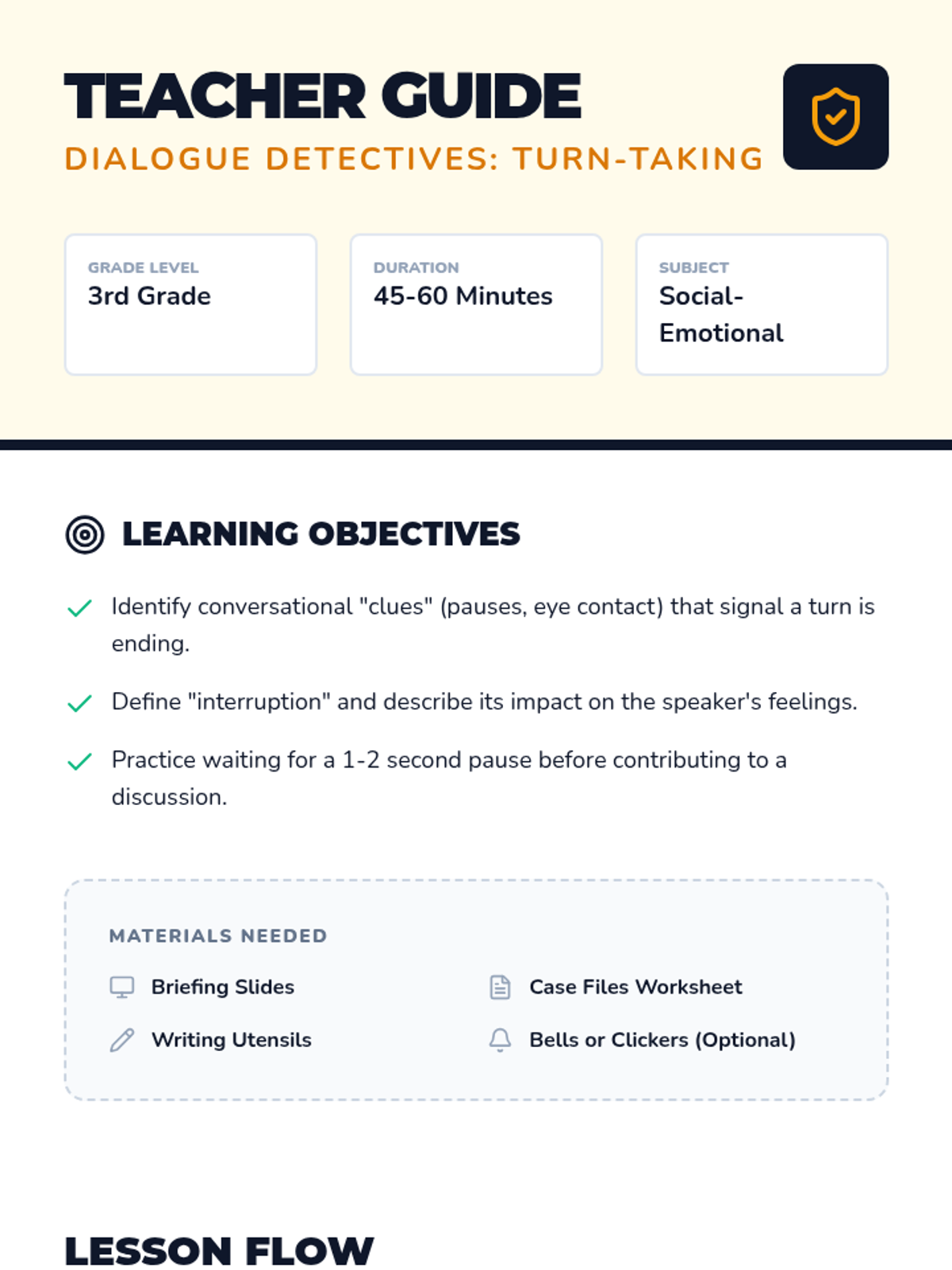 A lesson focused on teaching 3rd graders the social-emotional skill of conversational turn-taking through a 'Dialogue Detectives' mystery theme. Students learn to recognize conversational cues, avoid interruptions, and practice active listening using real-world scenarios.