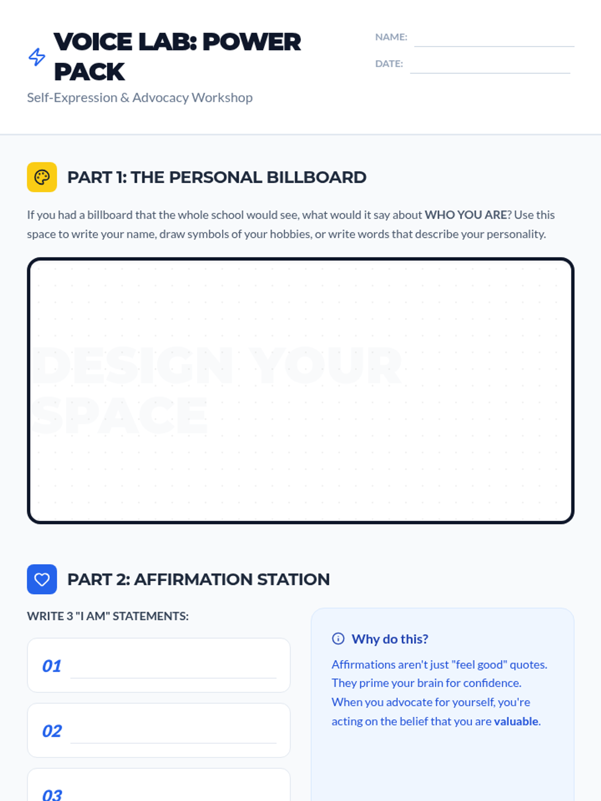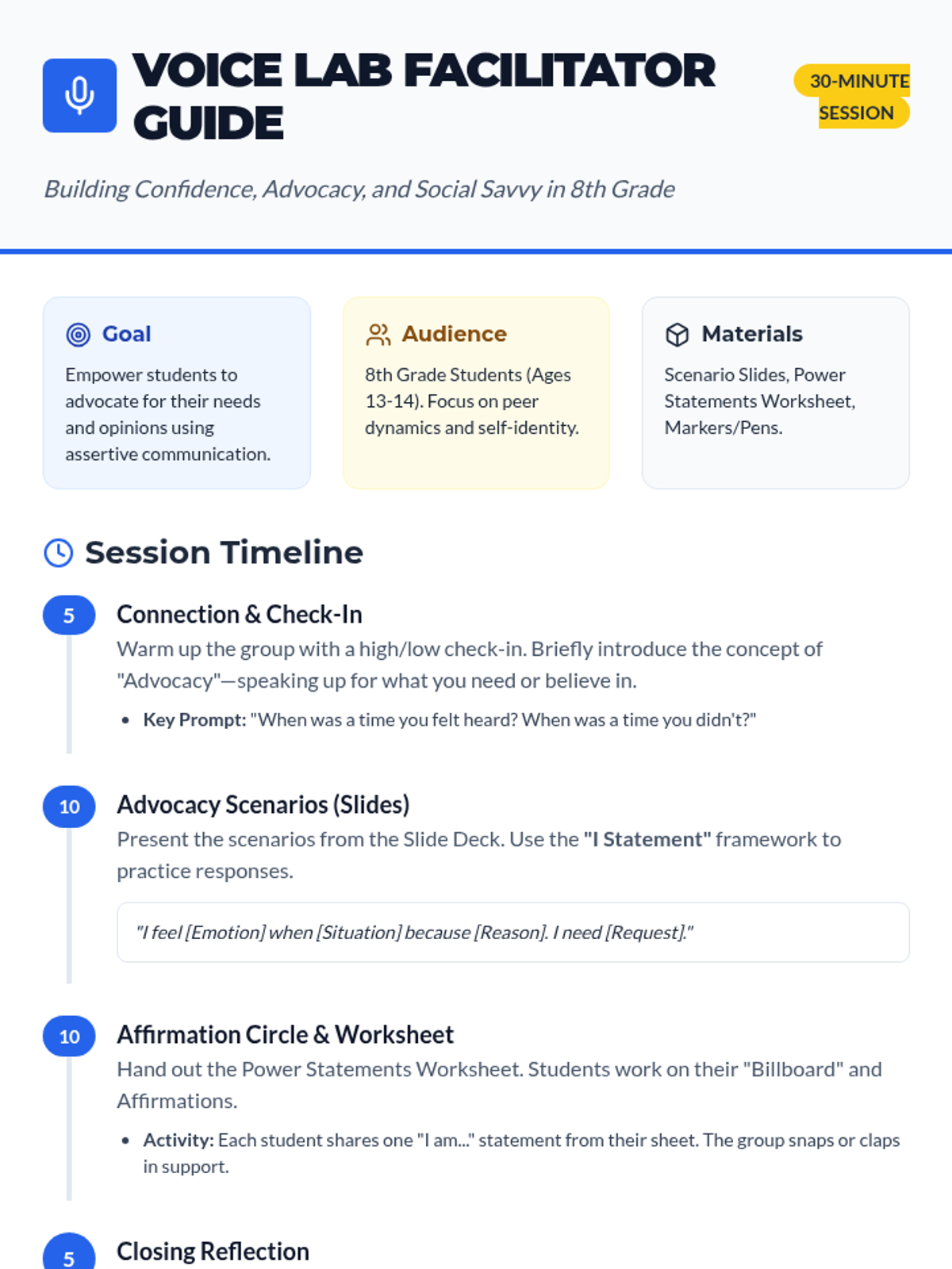 A 30-minute group session designed for 8th graders to build self-confidence and social pragmatics through advocacy, self-expression, and positive affirmations.