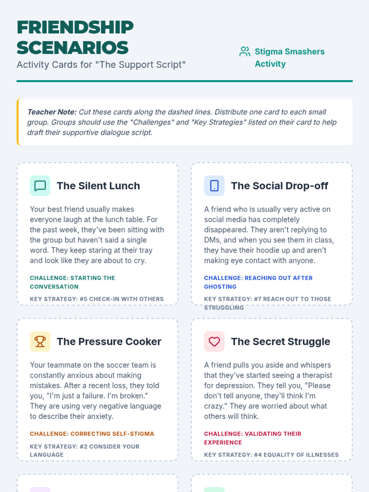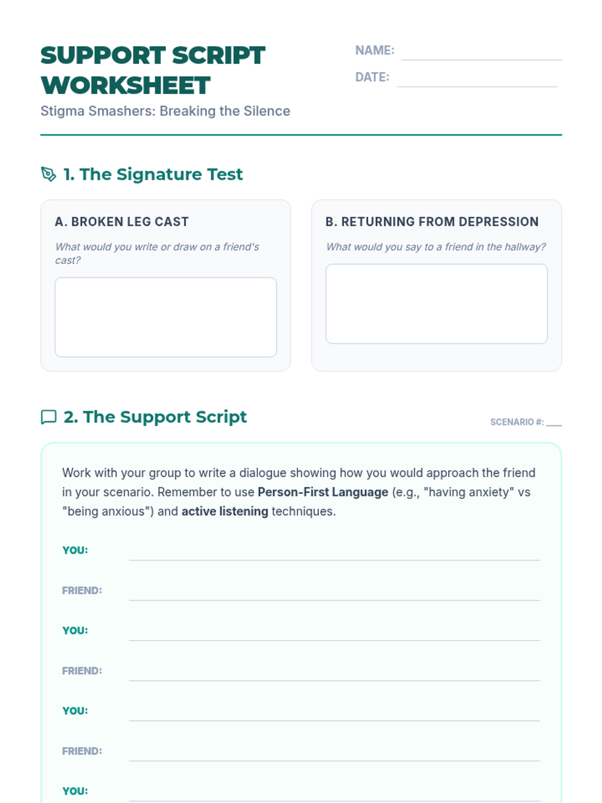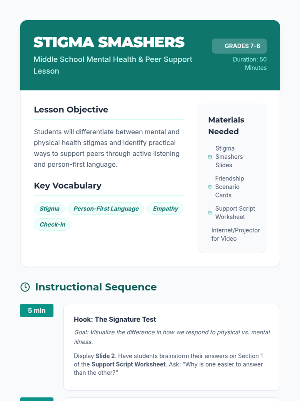 A lesson for 7th-8th grade students to understand the difference between mental and physical health stigmas and learn practical strategies for supporting peers using person-first language and active listening.