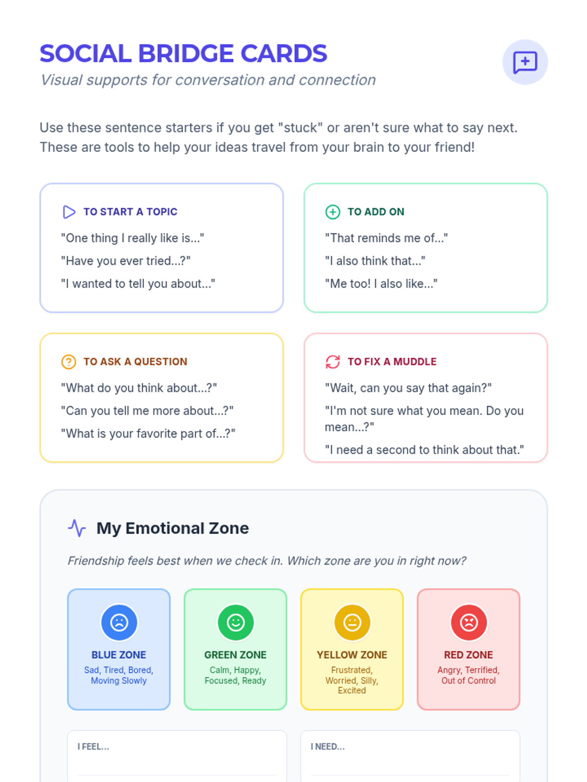 Peer relationship navigation, conversational turn-taking, and stress management strategies within supportive group settings. Develops communal belonging through shared mental health education and collaborative skill practice.