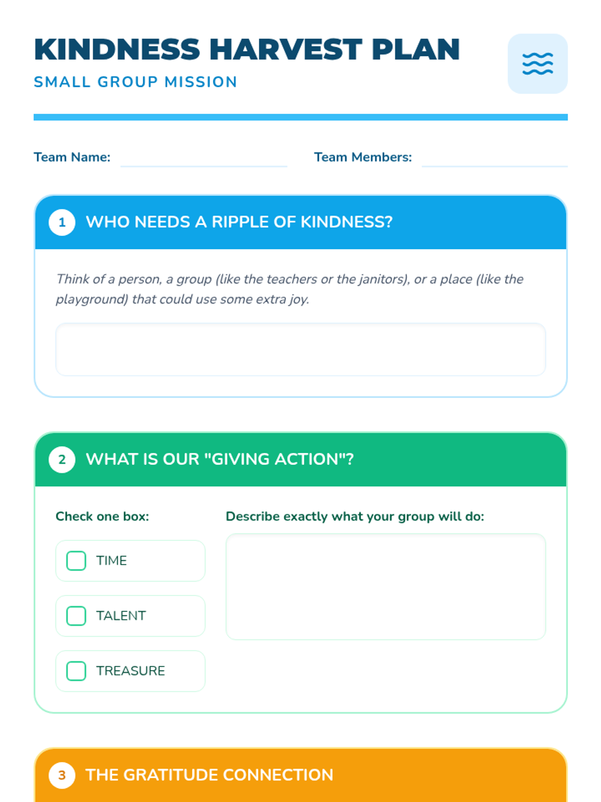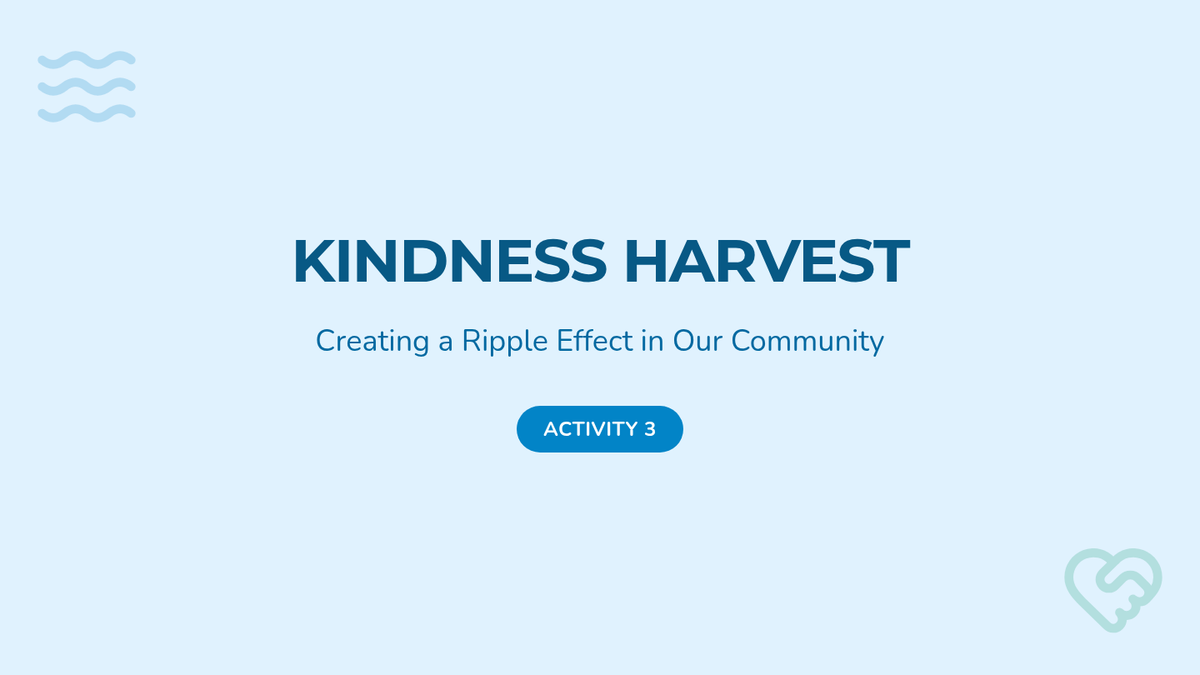 Synthesizes the concepts of gratitude and generosity by having student groups plan a 'ripple effect' of kindness for their community.