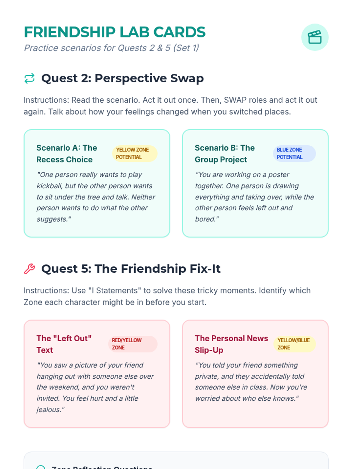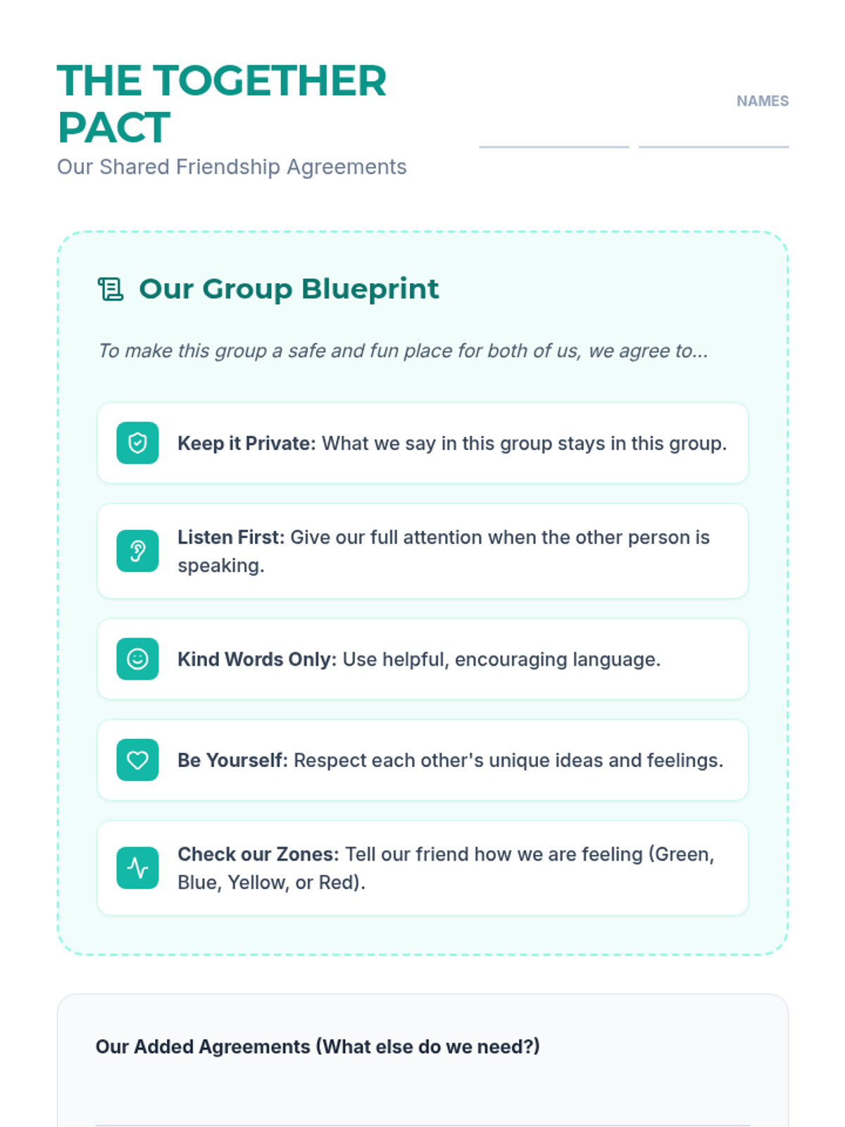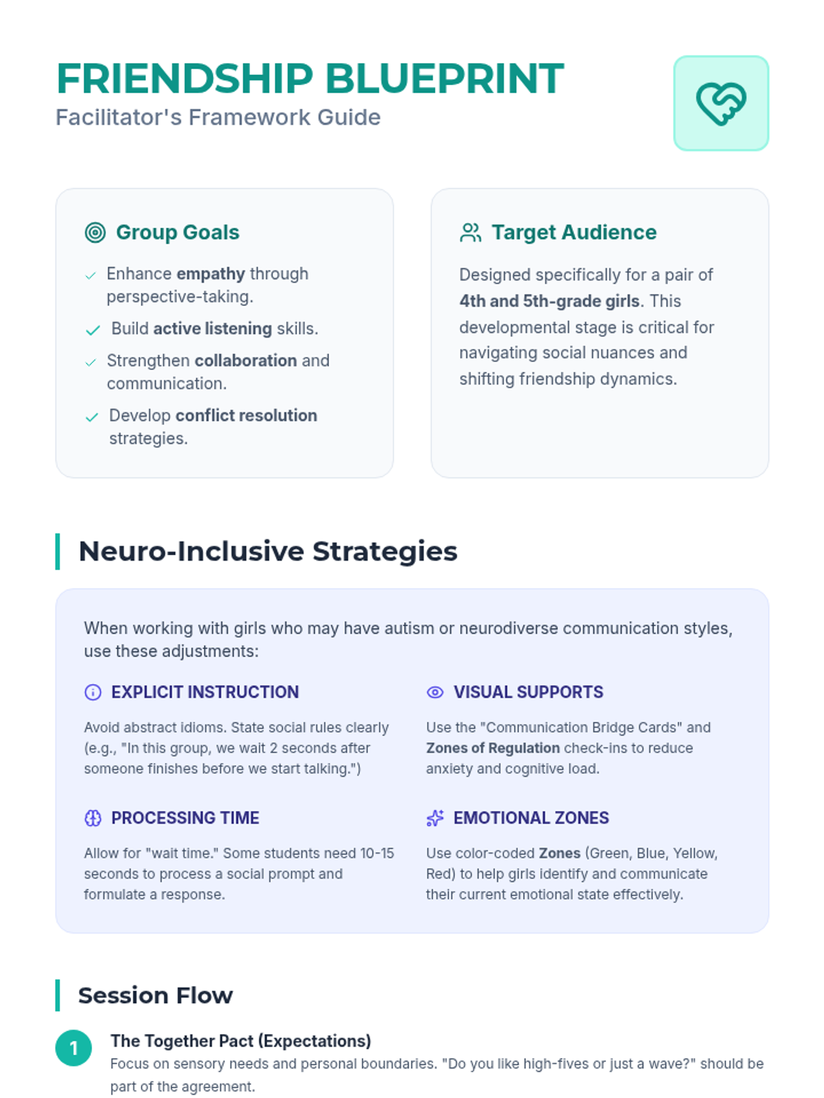 A comprehensive small-group framework designed for two 4th and 5th grade girls to build communication skills, empathy, and friendship through shared agreements and six interactive activities.