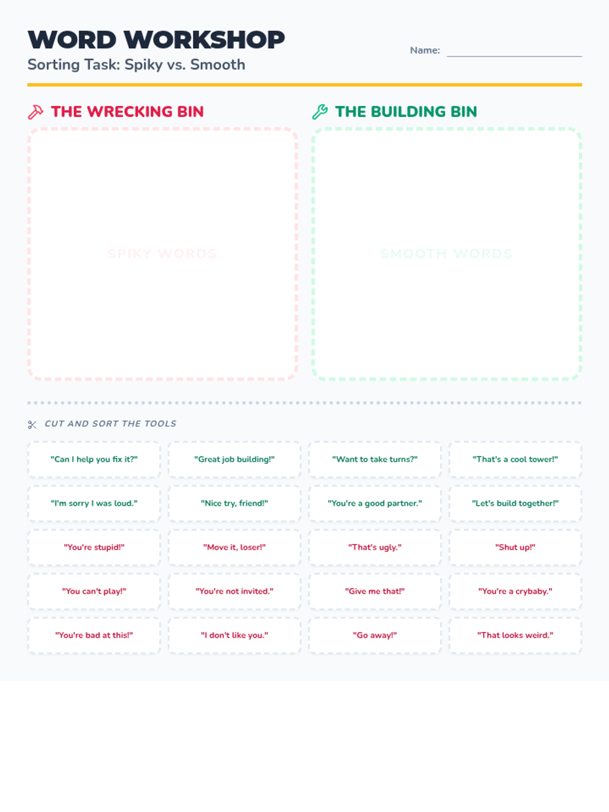 A small group intervention for 1st and 2nd grade boys focused on replacing mean words with kind ones, developing self-awareness, and improving social interaction through a 'Word Workshop' construction theme.