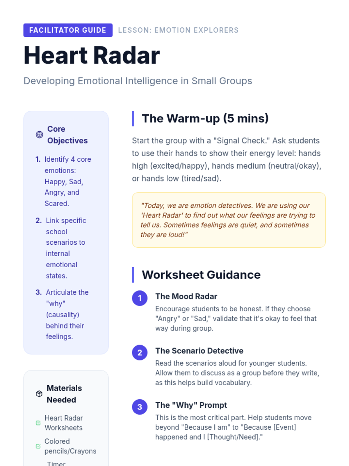 A social-emotional learning lesson focused on identifying and explaining common emotions within a school context, designed for small group facilitation.