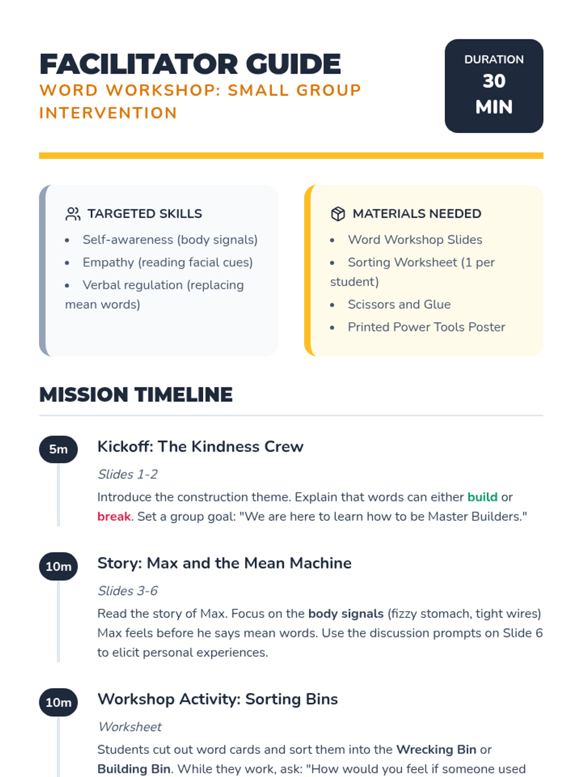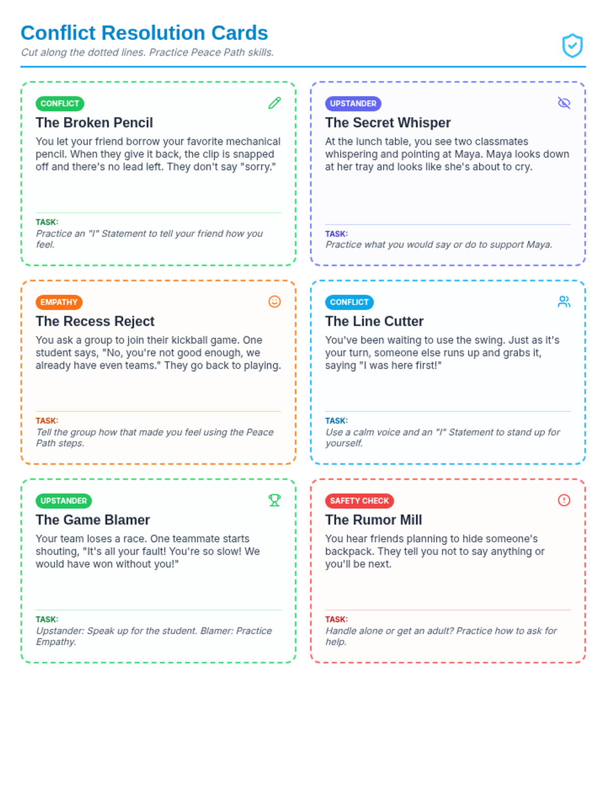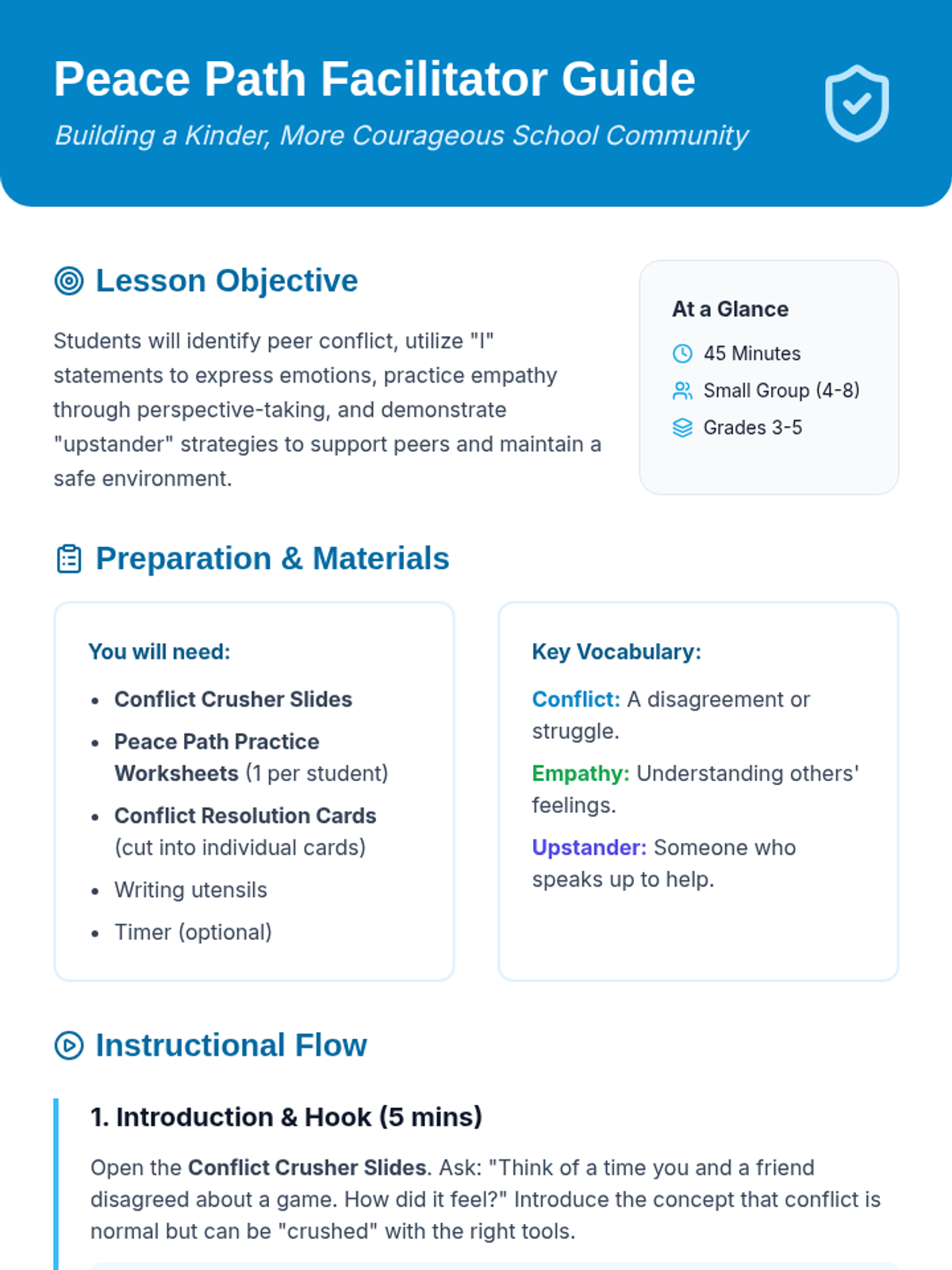 A small group lesson designed to teach students how to identify peer conflict, resolve it using 'I' statements and empathy, and act as upstanders in challenging situations.