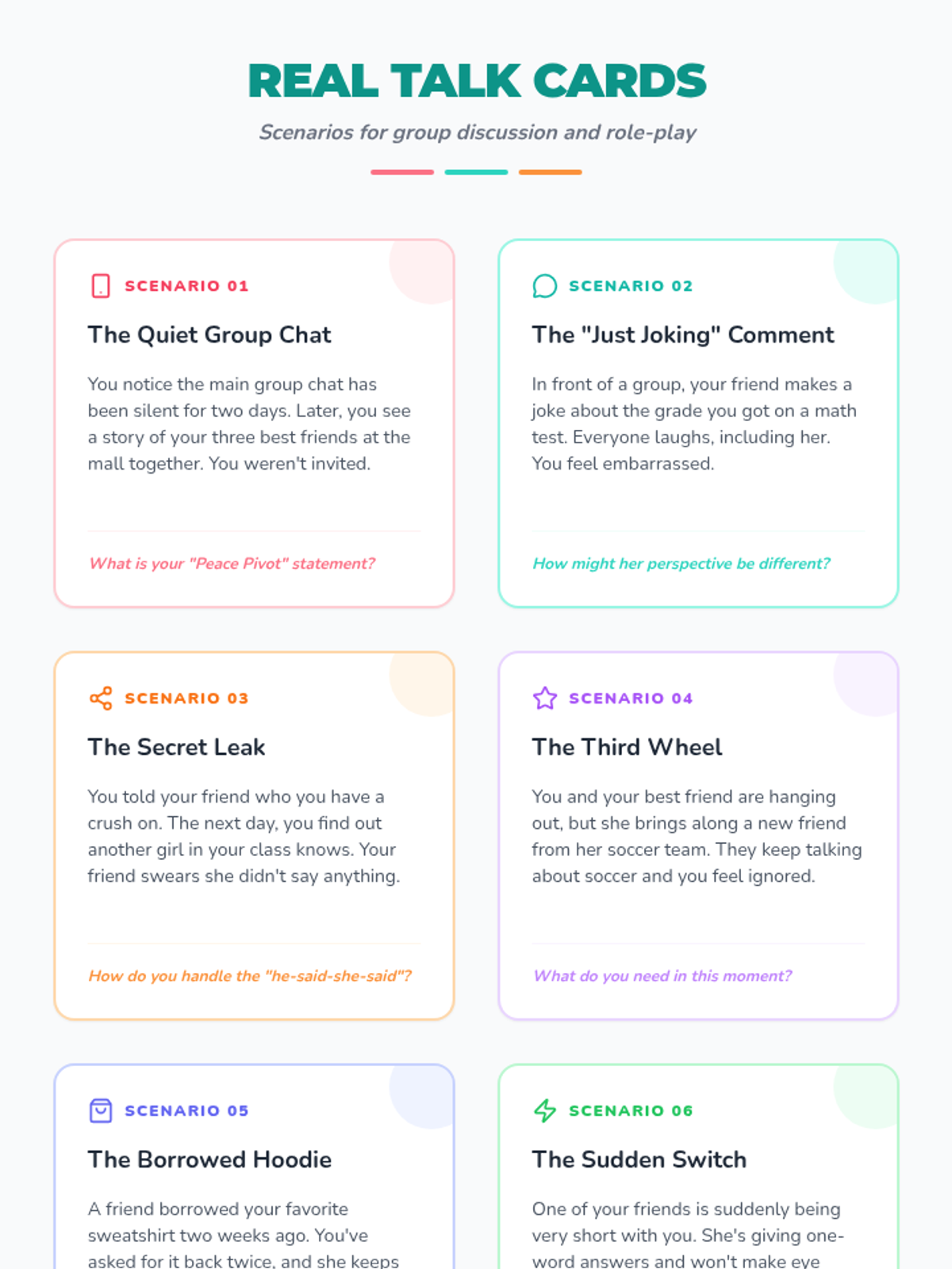A targeted 15-minute intervention for 7th-grade girls focusing on the 'Pause and Play' decision-making strategy. This session helps students analyze the potential outcomes of their choices in social and academic contexts.
