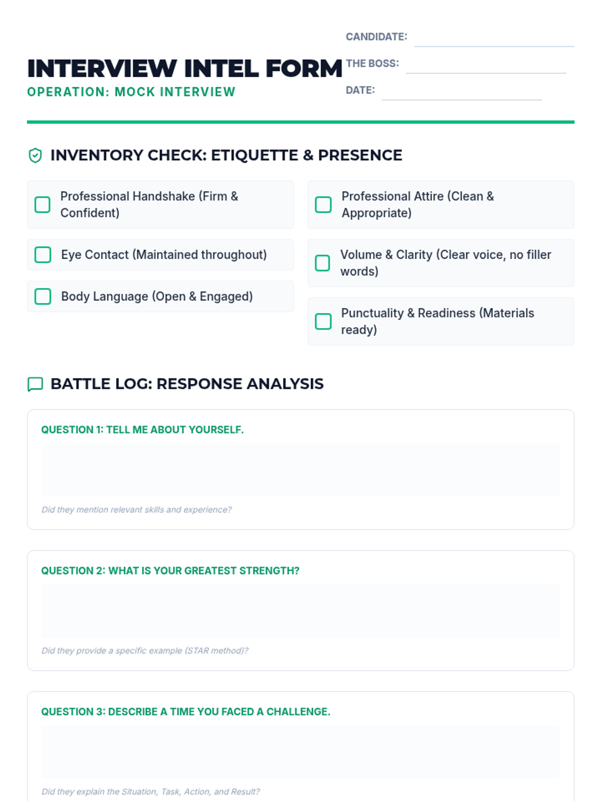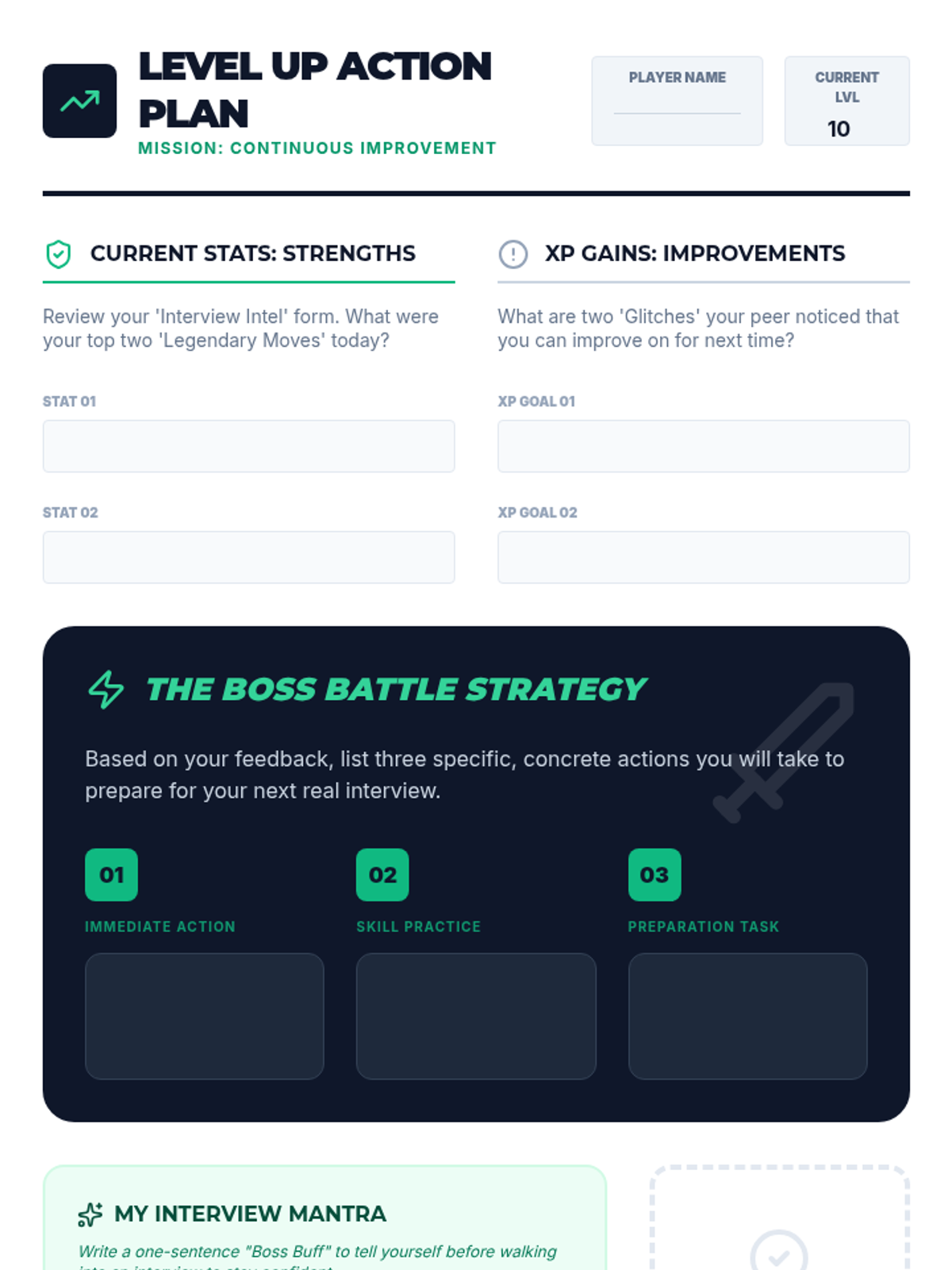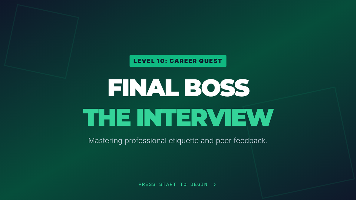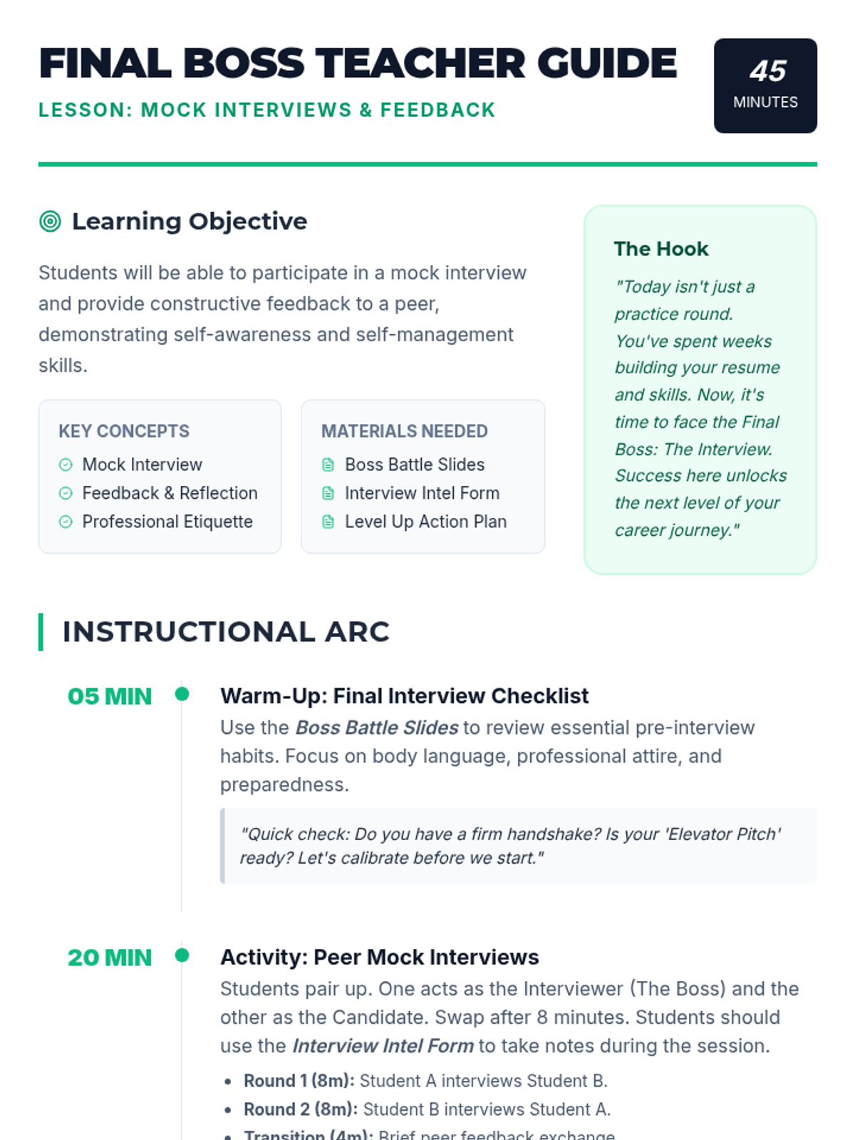 A high-stakes, engaging mock interview lesson where 10th-grade students face 'The Final Boss'—a peer interview. Students practice professional etiquette, provide structured feedback, and create a personalized action plan for future career success.