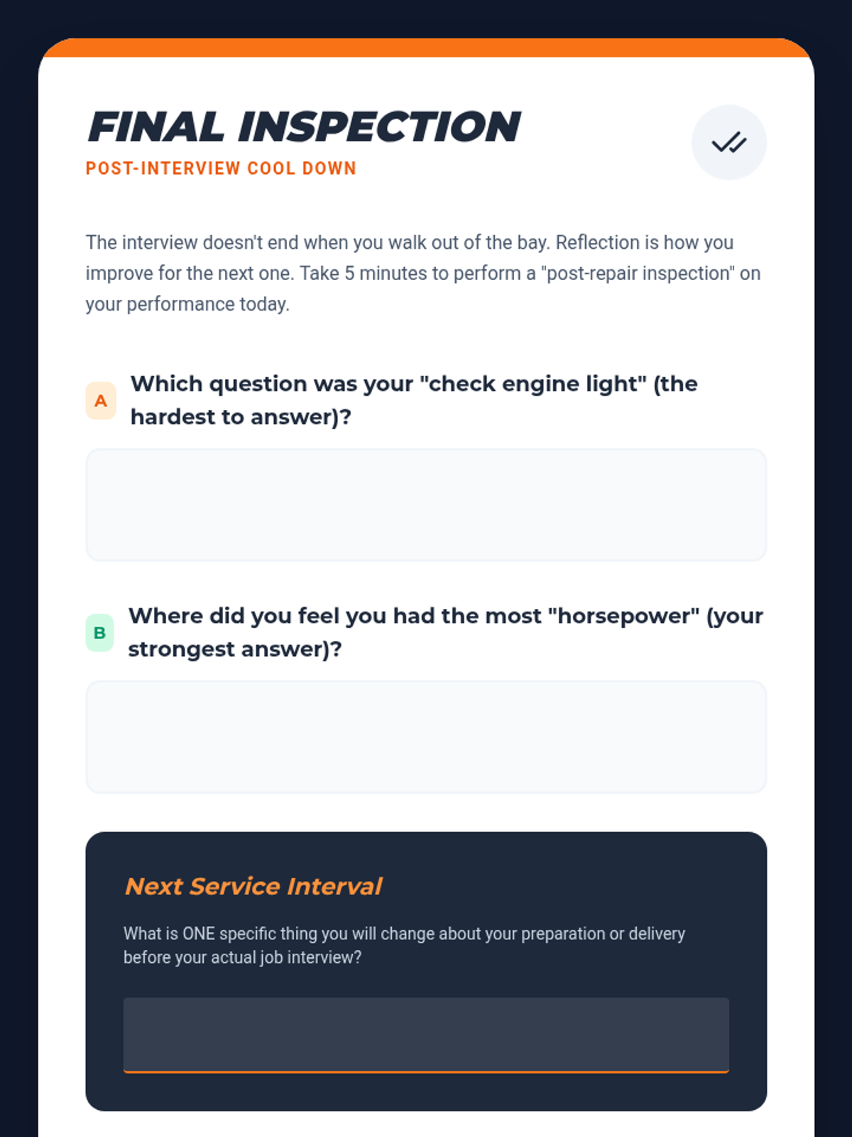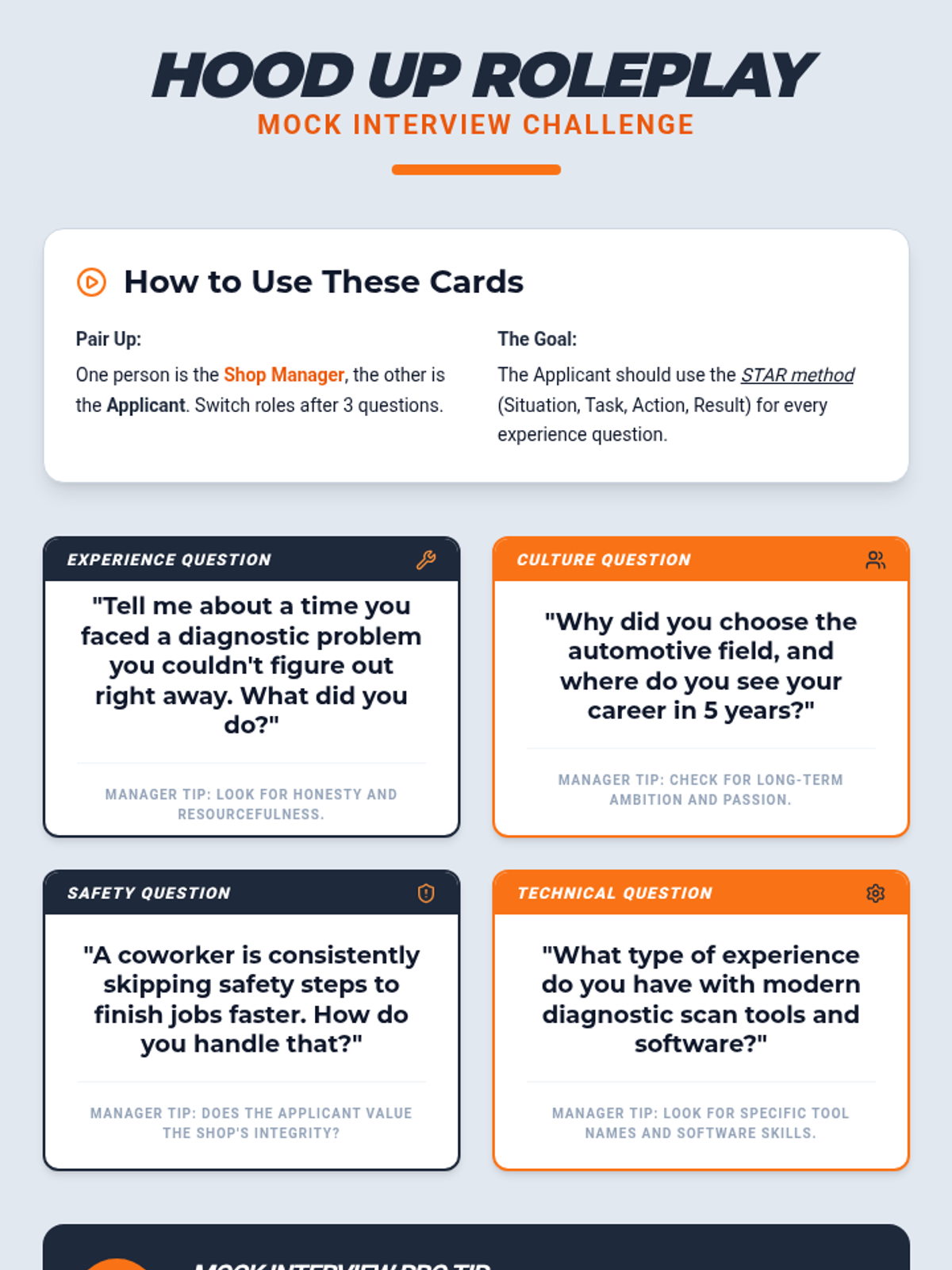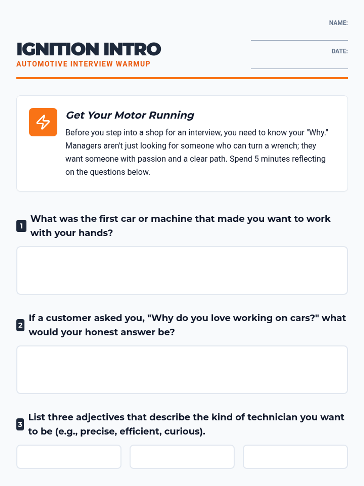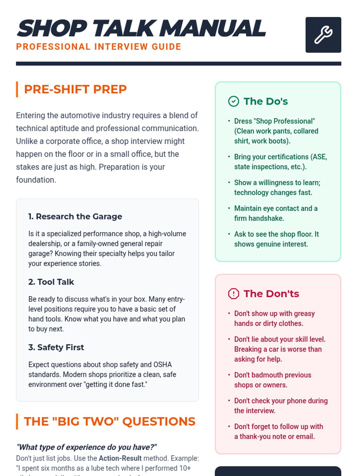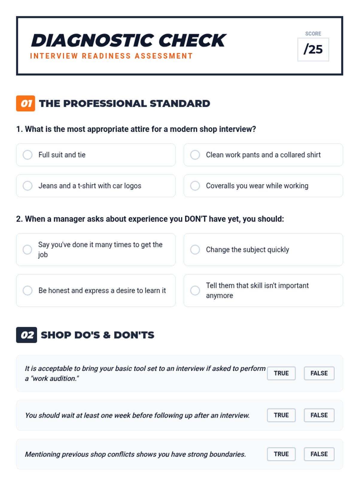 A comprehensive lesson to prepare aspiring automotive technicians for job interviews, covering preparation strategies, industry-specific questions, and professional conduct.
