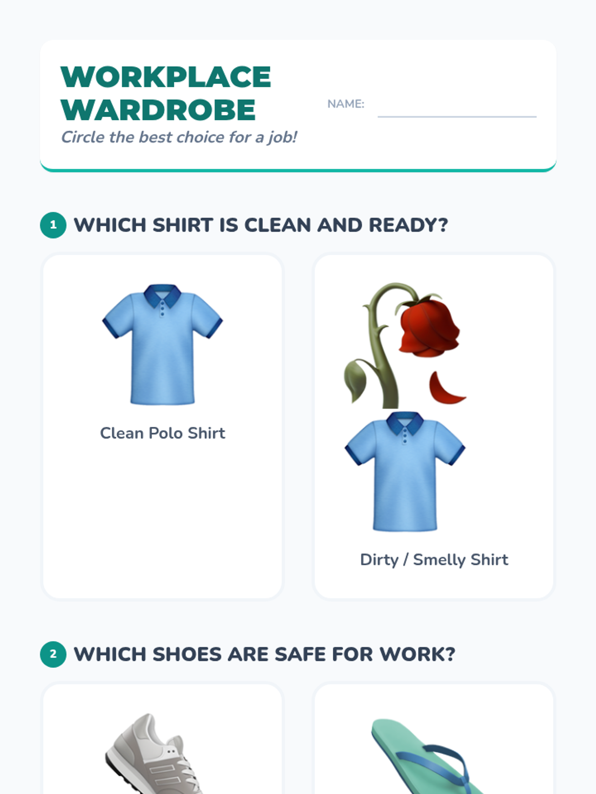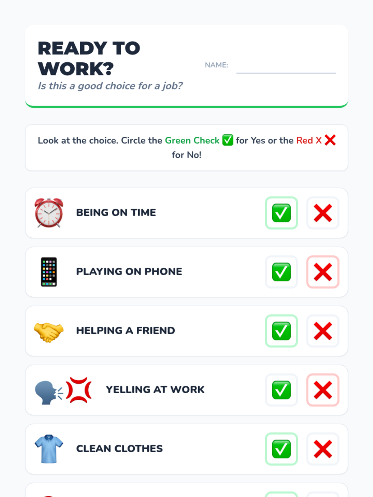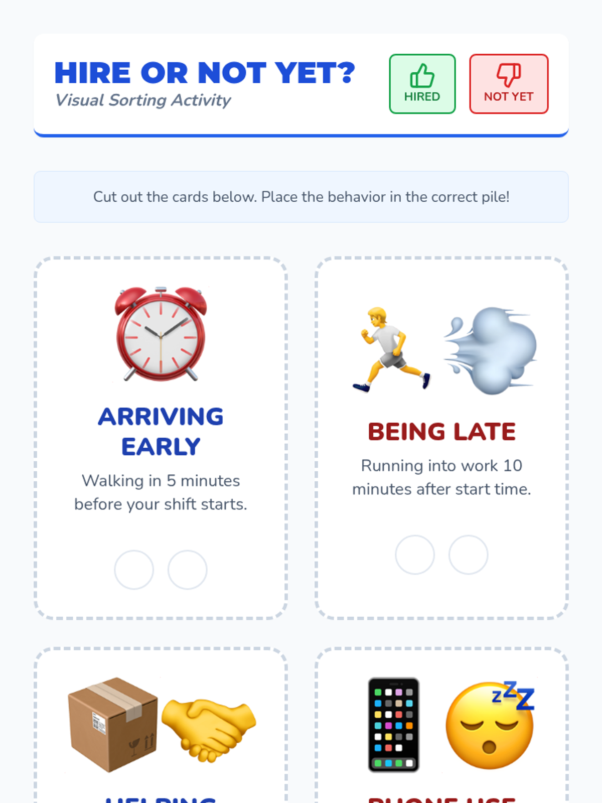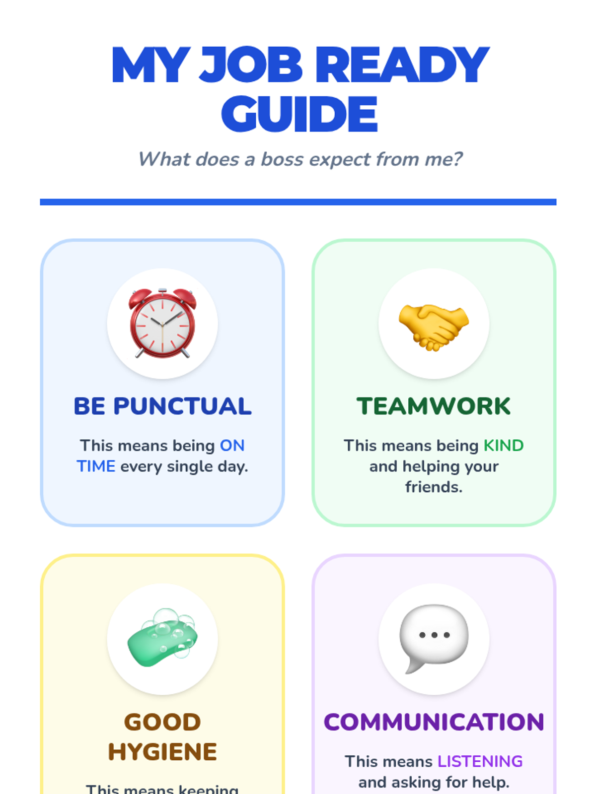 A comprehensive lesson designed for life skills students to understand what employers look for, focusing on core values like punctuality, teamwork, and hygiene through visual aids and interactive activities.
