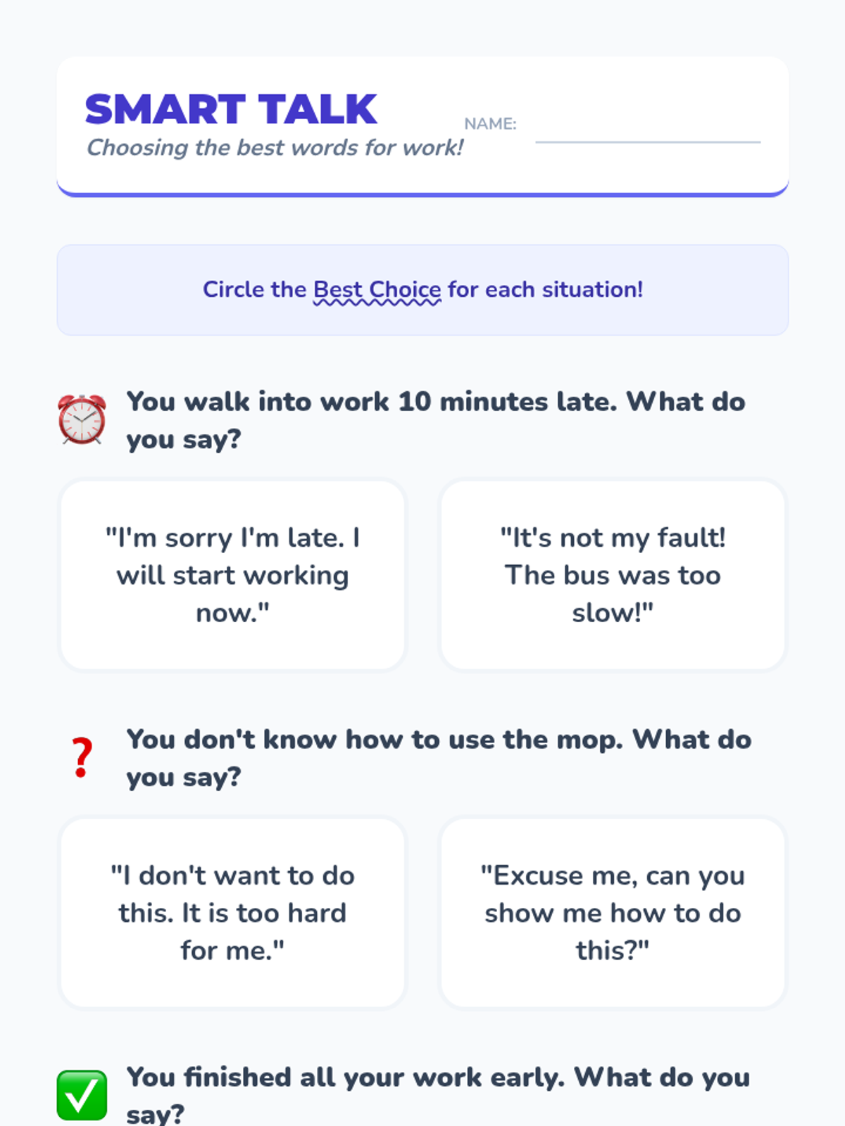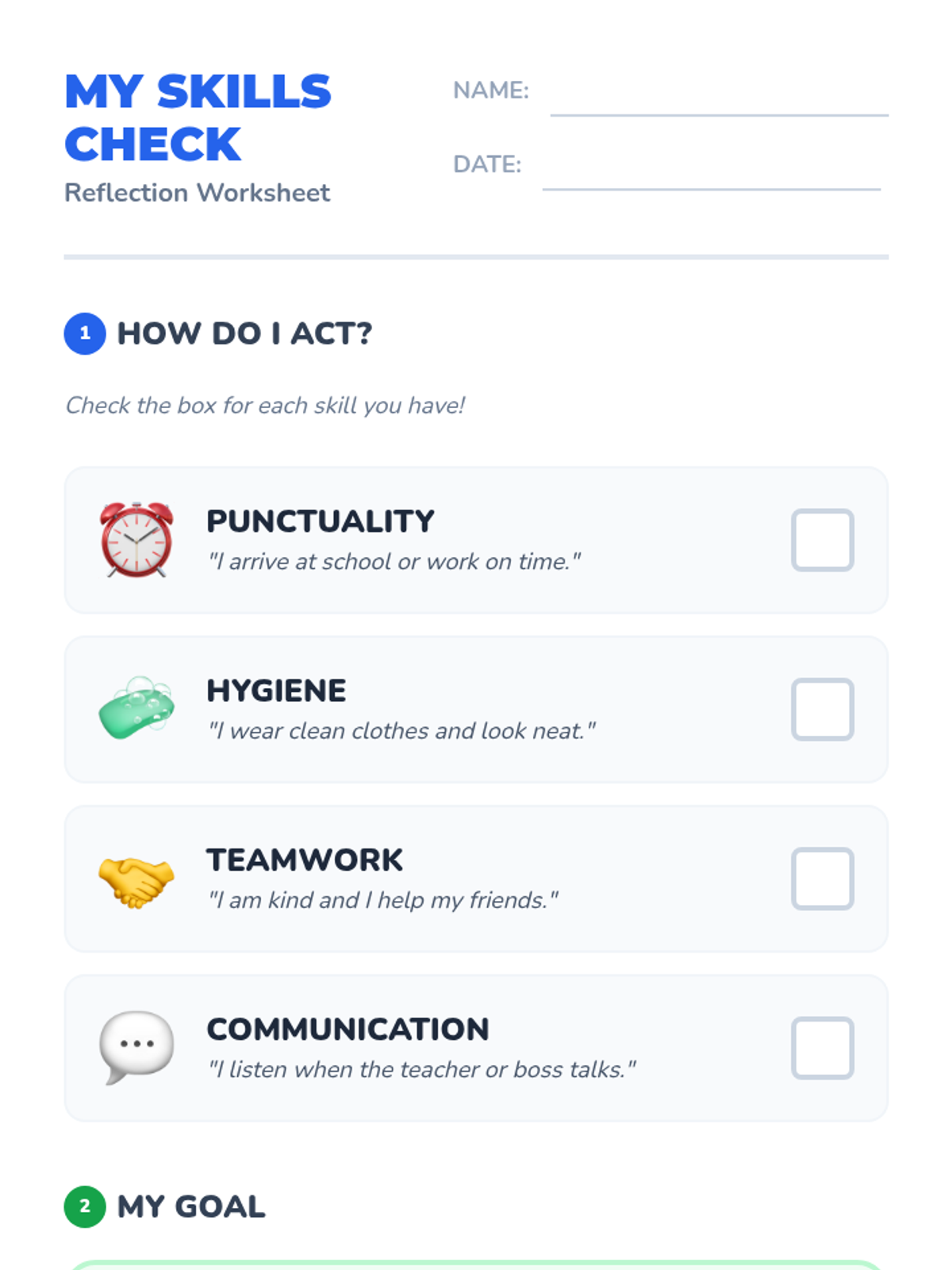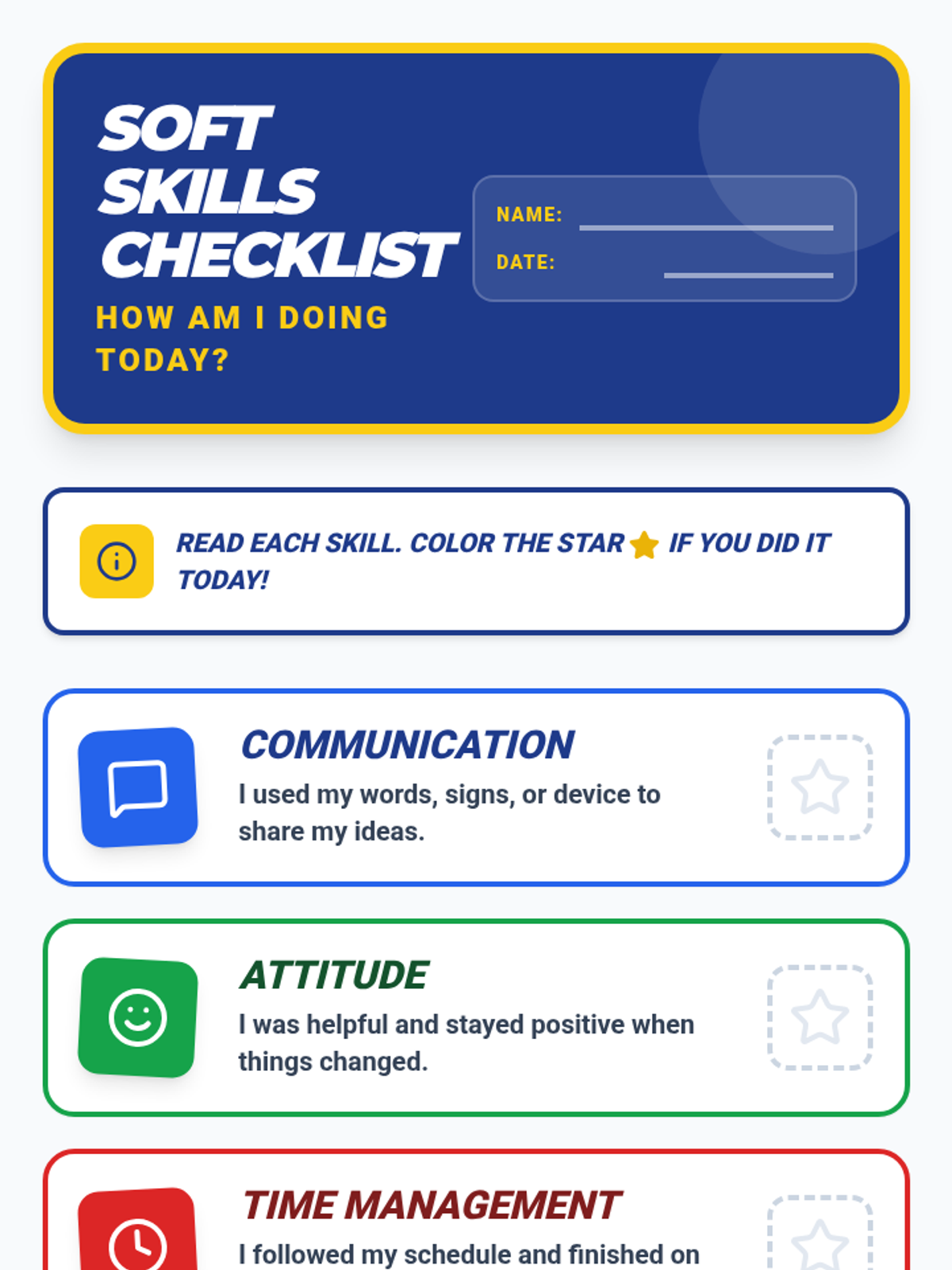 Identifying personal work strengths and professional skills using visual supports and simplified 'I can' statements.