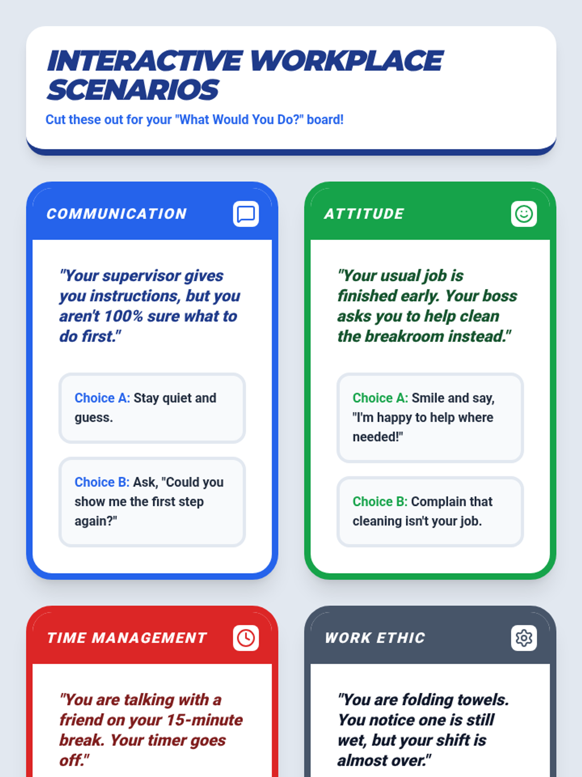A comprehensive collection of bulletin board components designed to teach adult students with disabilities the essential soft skills required for workplace success. The materials focus on communication, attitude, work ethic, self-confidence, and time management through visual aids and interactive elements.