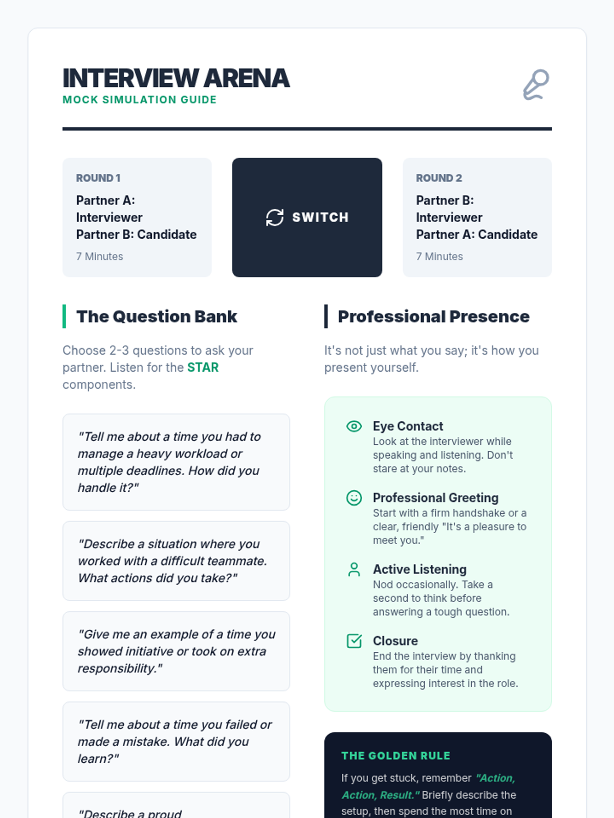 Students master the STAR method to answer behavioral questions and develop a strategic 'story bank' of professional experiences.